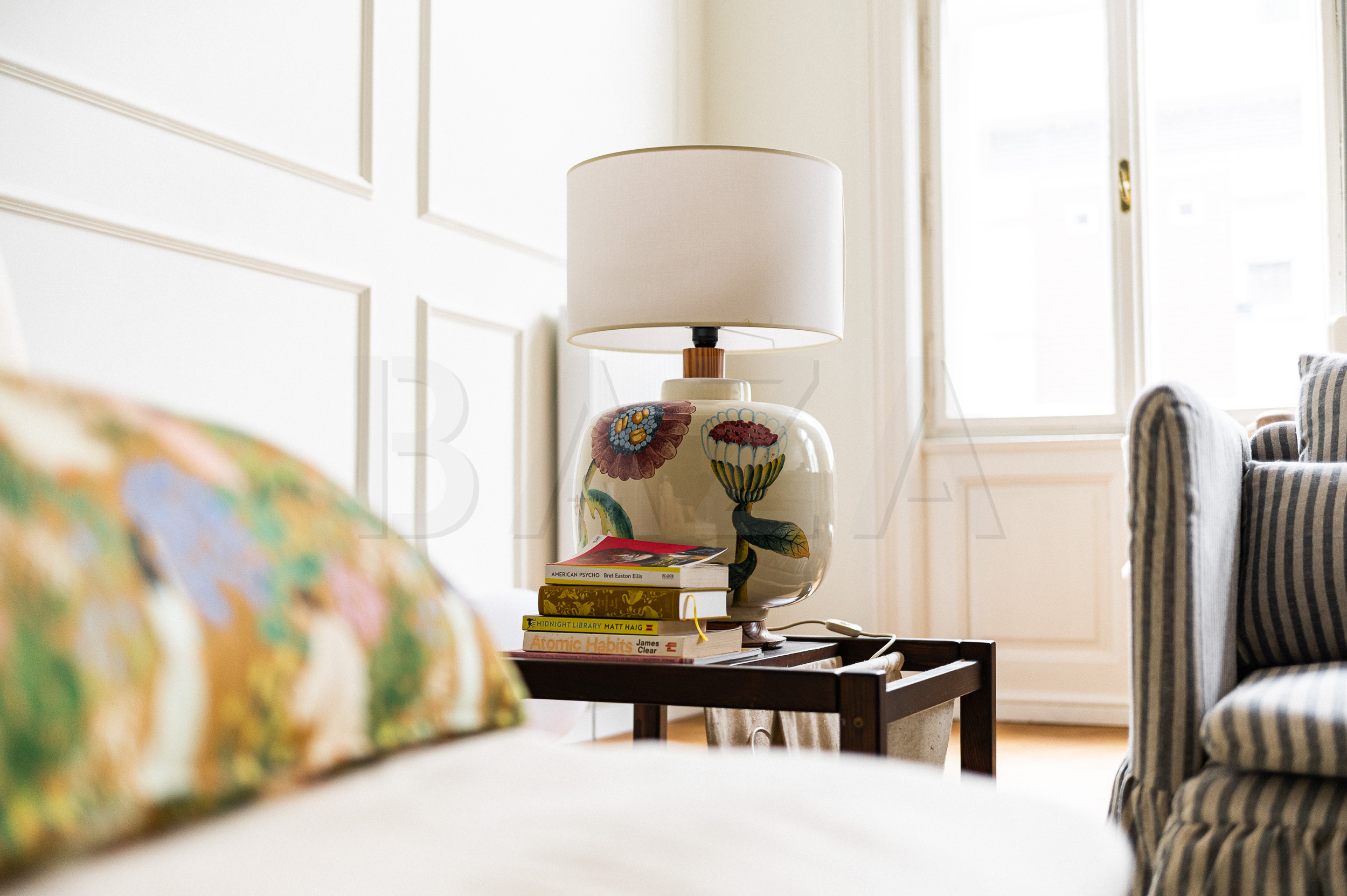 We have quite a few vintage furniture pieces we found at fairs and shops around Europe. My favorite piece is a ceramic table lamp with a floral motif that I brought back from Florence.