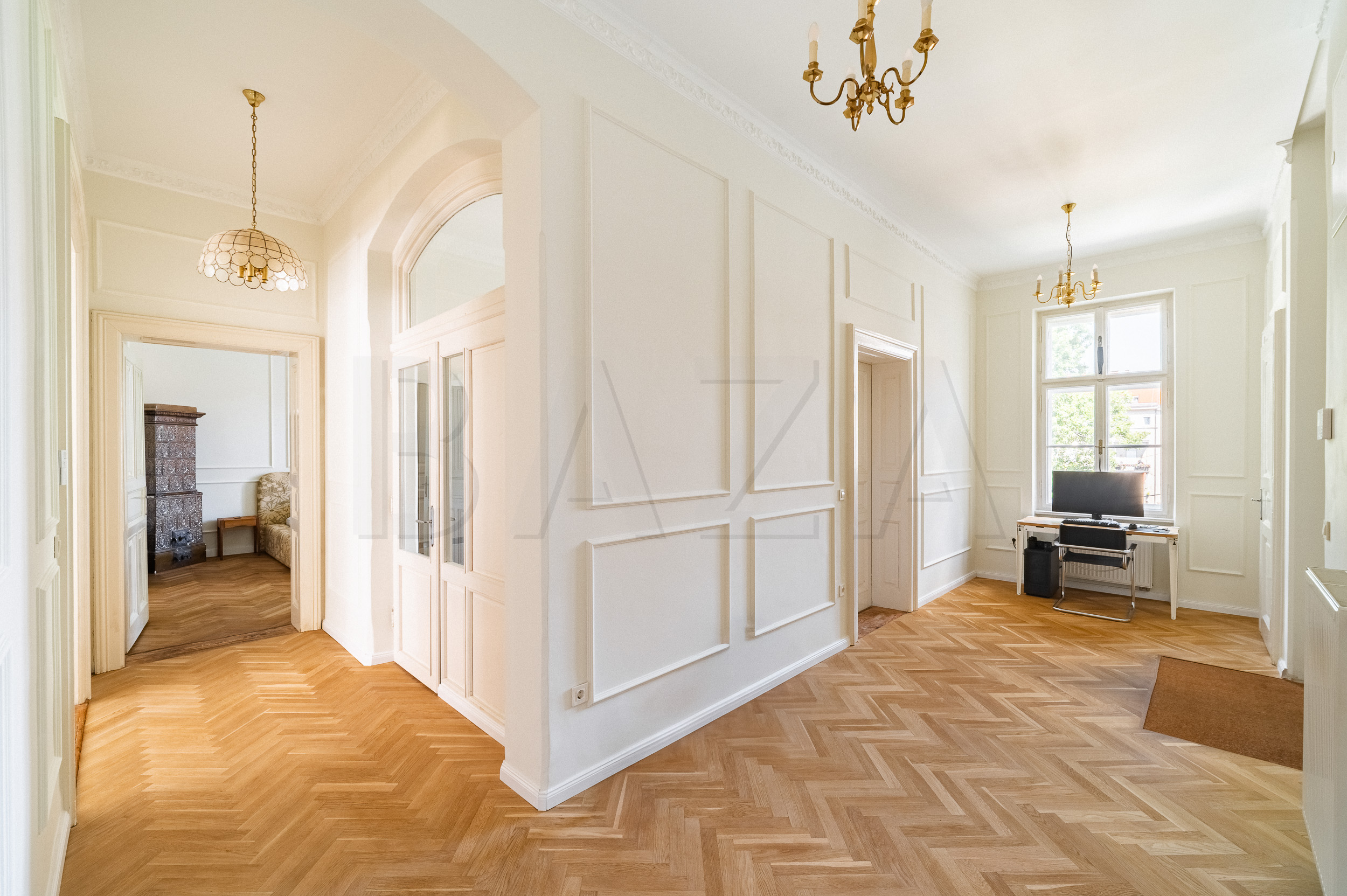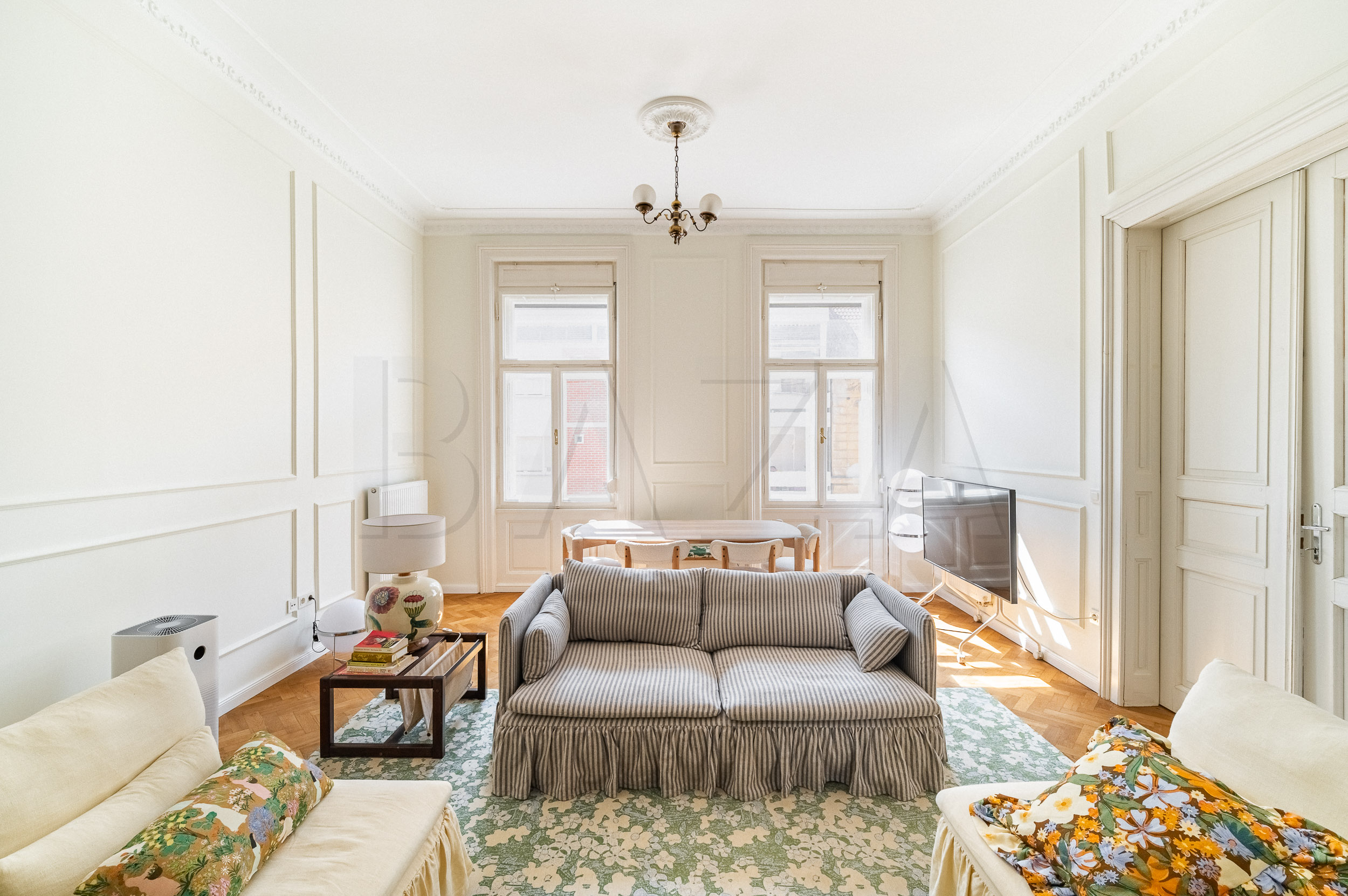 We viewed many old-town apartments, but most were poorly maintained, often damp, with neglected hallways, and in many cases, the original windows and doors had been removed or ceilings lowered. This apartment checked all our boxes.