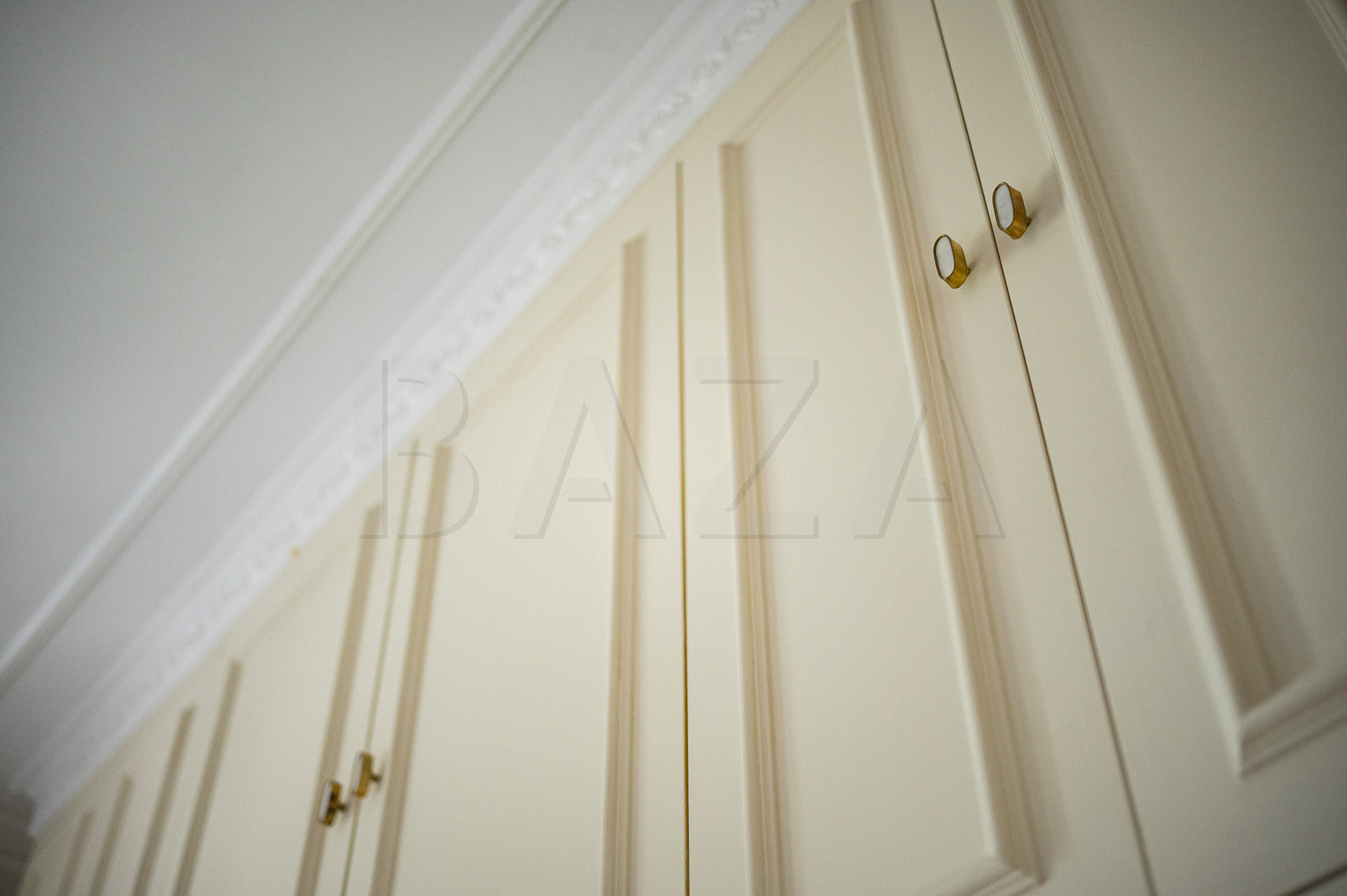 The renovation process was similar in every room. We always started by protecting the space according to the work planned. Niko always says that good preparation is the most important part. We began with sanding and filling the walls so they’d be perfectly smooth and crack-free. Next came installing wall and ceiling stucco; we filled the joints between stucco and walls, then painted everything. The floors were a story of their own. We started by sanding them, then manually removed old glue between the slats, filled the gaps with wood filler, sanded again, and finally applied three layers of matte varnish. We finished by installing decorative floor moldings.