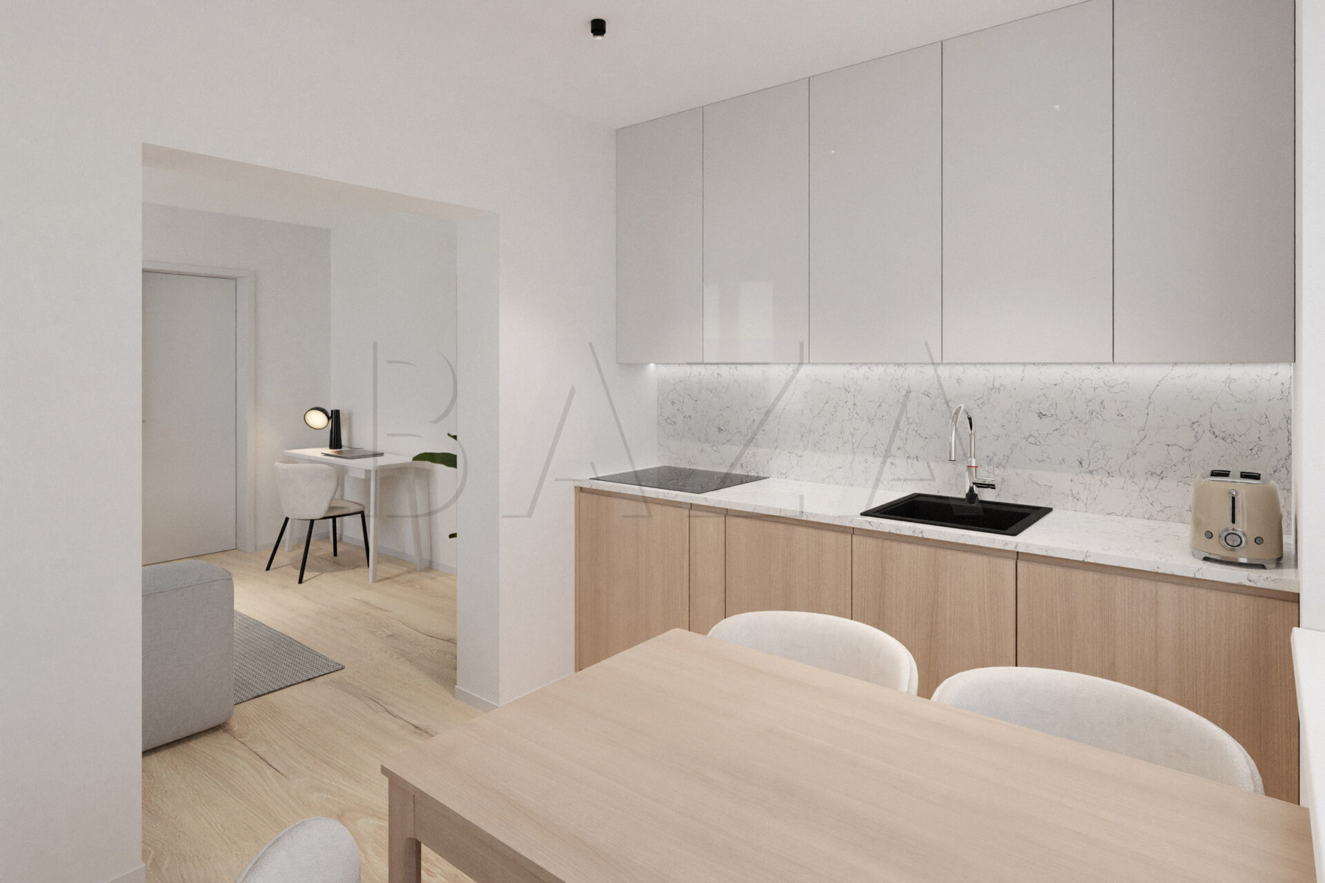 The apartment is currently under renovation and is being sold in its existing, unfinished state. The price includes the remaining laminate flooring for completion and some additional materials. The kitchen, refrigerator, induction cooktop, and oven, washing machine and dryer, new entrance door (which only needs to be installed), new sliding door awaiting installation, bed with mattress, desk, dining table with chairs, and wardrobe will also remain in the apartment.