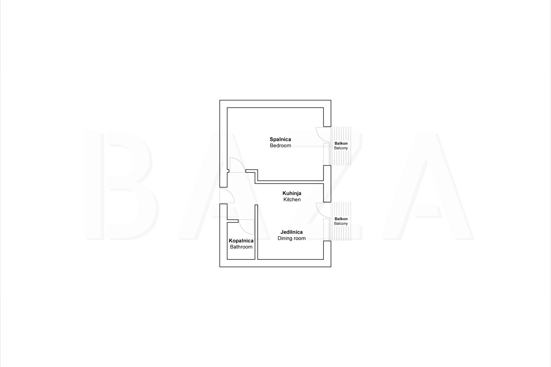 The apartment is oriented southeast and includes an entrance hall, a bathroom with a shower, a spacious living kitchen with a dining area, and a large room that serves as both a bedroom and living area. A special feature of the apartment is two balconies, accessible from the kitchen and bedroom, which provide additional light and a pleasant sense of airiness and openness.