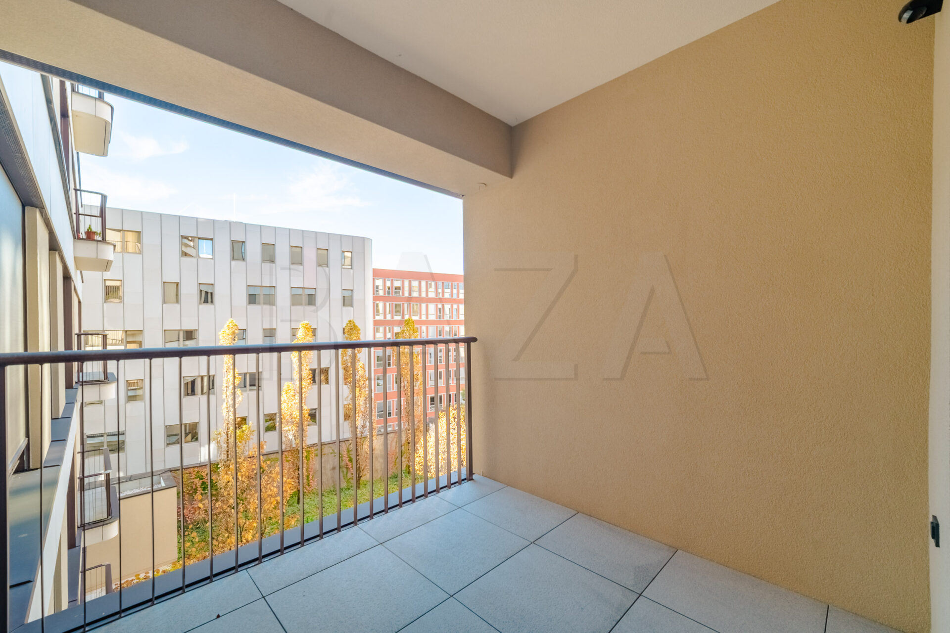 The apartment layout offers an open floor plan, with separate sanitary facilities and a special utility room and storage. The unified living area is connected to the kitchen, dining room, and living room, which continues onto a loggia. Access to the loggia is also possible from the study. In addition to the bedroom, there is a bathroom with a bathtub and shower, and a walk-in closet.