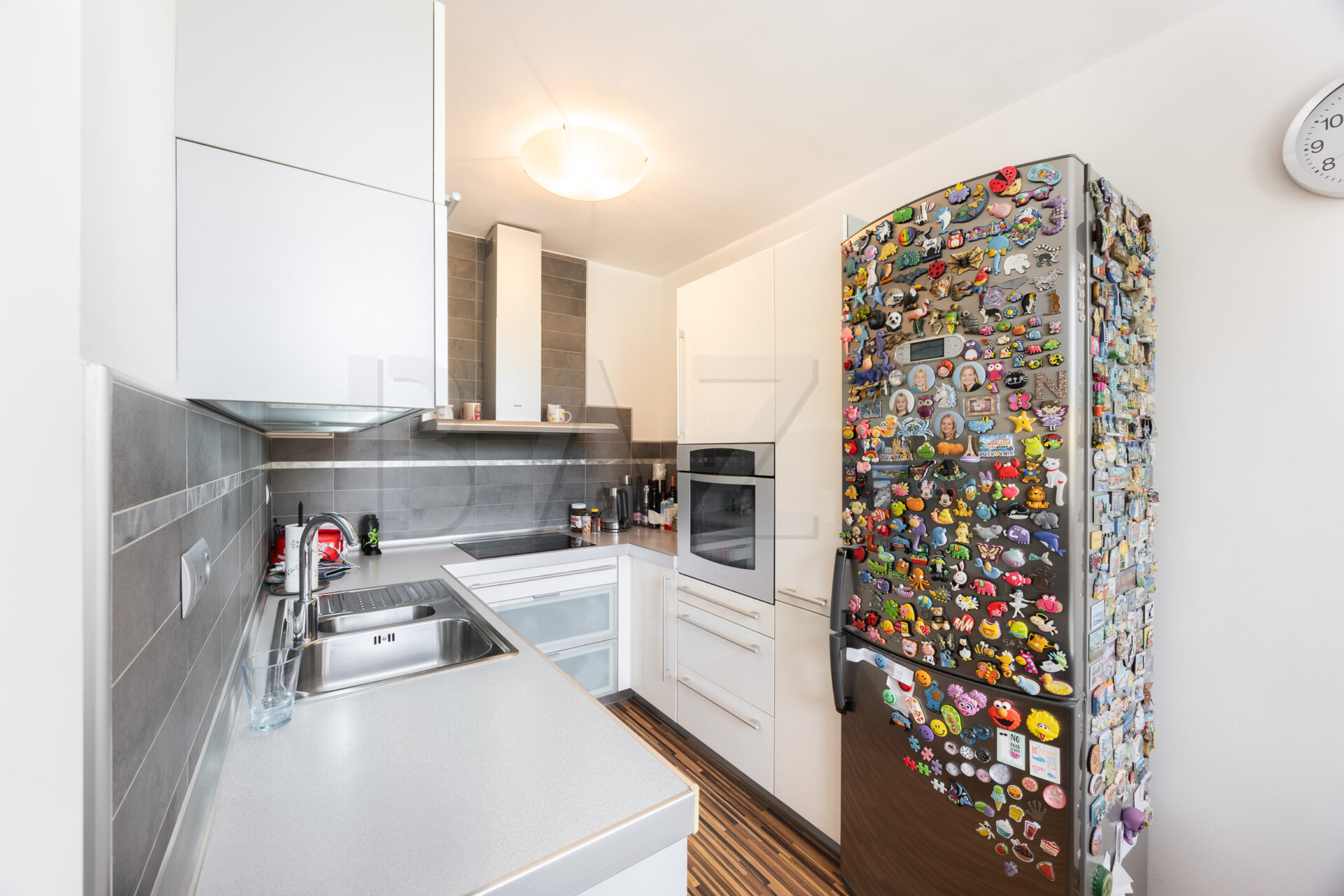 The floor plan includes a living room with a kitchenette, dining area, and balcony, two bedrooms, a bathroom, and a separate toilet. The apartment comes with a basement storage room. The apartment was completely renovated around 2010 (mechanical installations, electrical installations, laminate flooring laid over the original parquet, new kitchen, bathroom and toilet, doors).