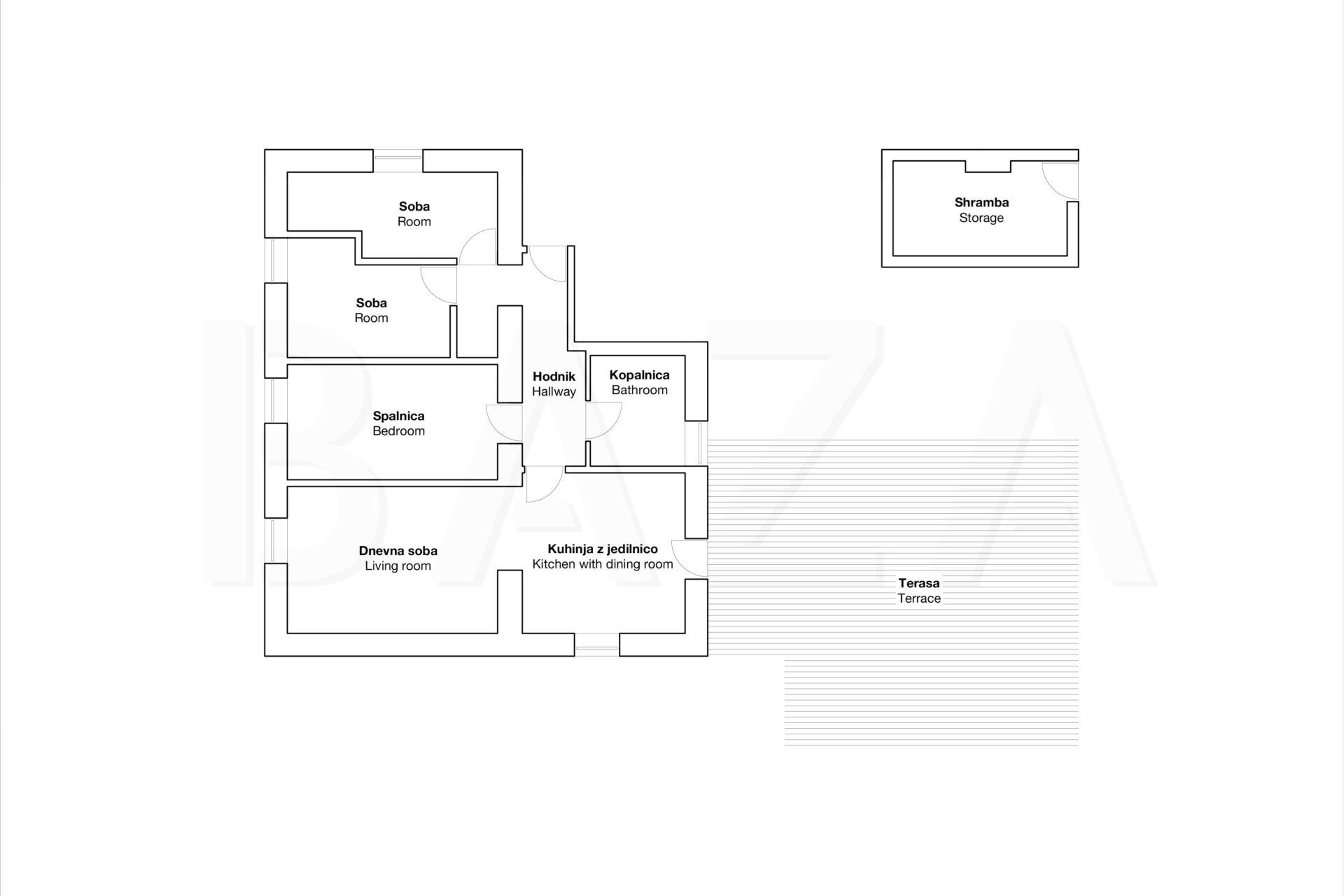 The apartment consists of two rooms, a bedroom, a bathroom, a hallway, a staircase, and a laundry room or storage. The central living area features a spacious living room with a dining area, offering a pleasant and comfortable living experience. The floor plan is functionally designed and allows for optimal use of space. The apartment includes a large outdoor terrace and additionally two uncovered parking spaces.