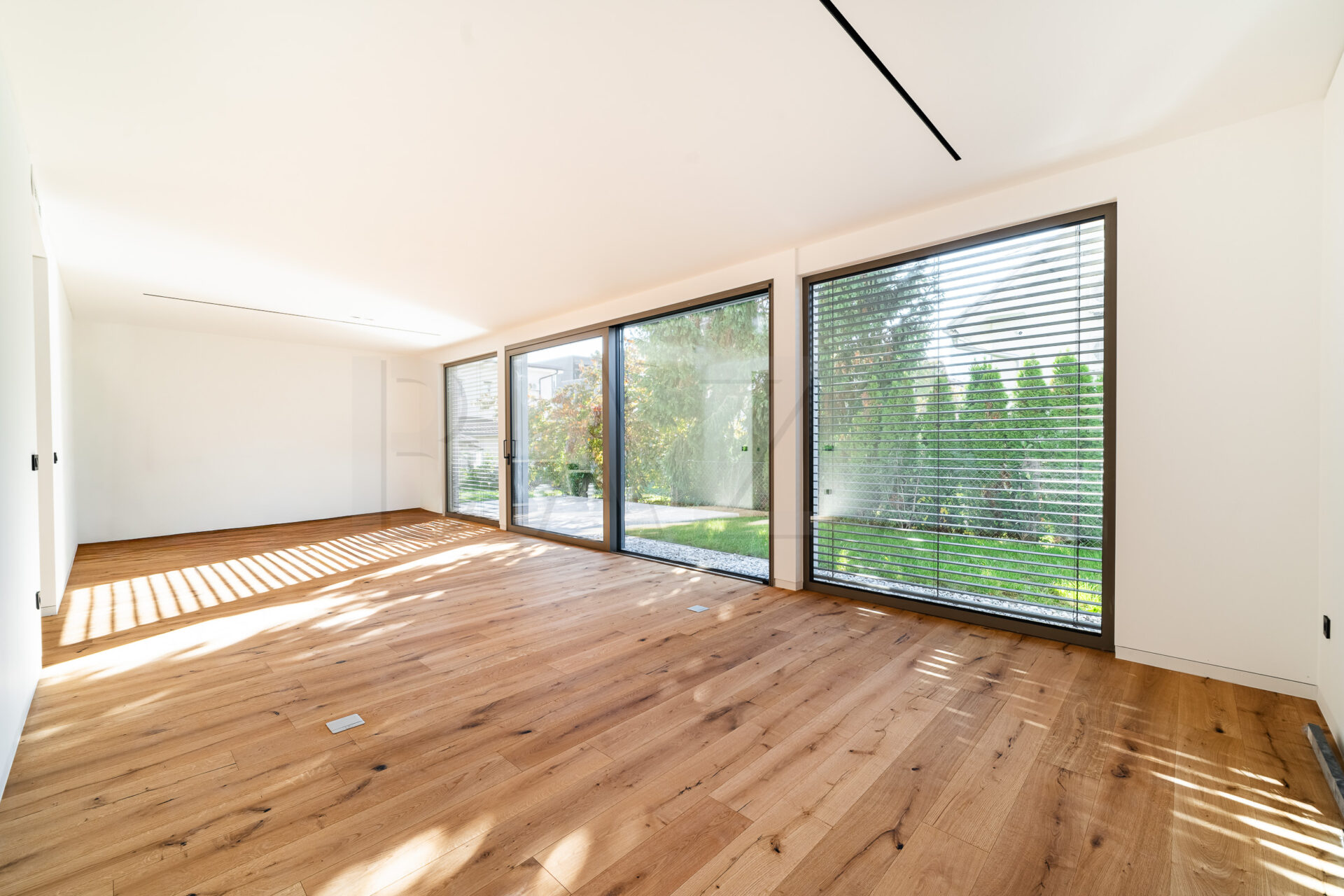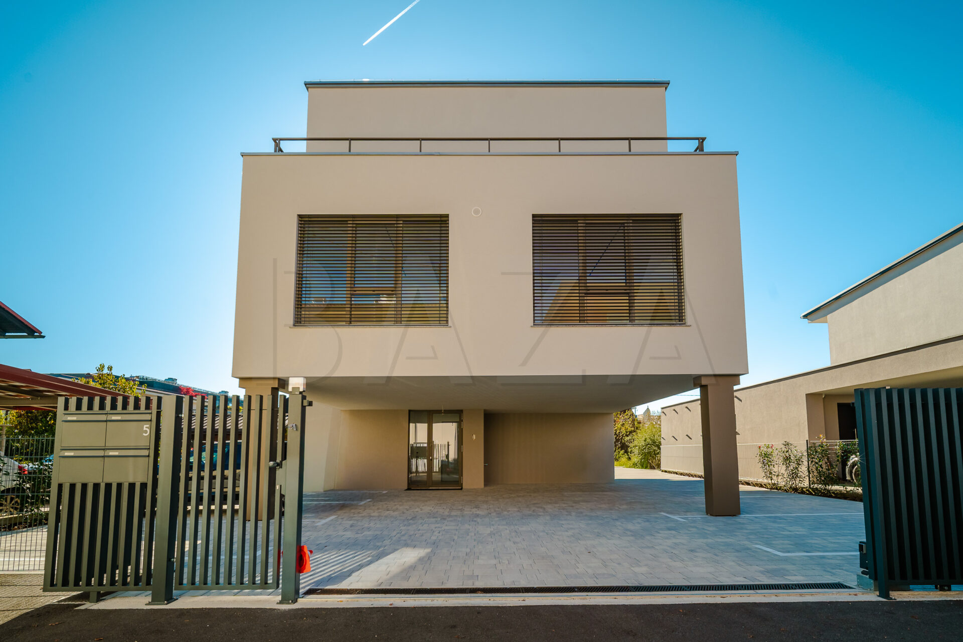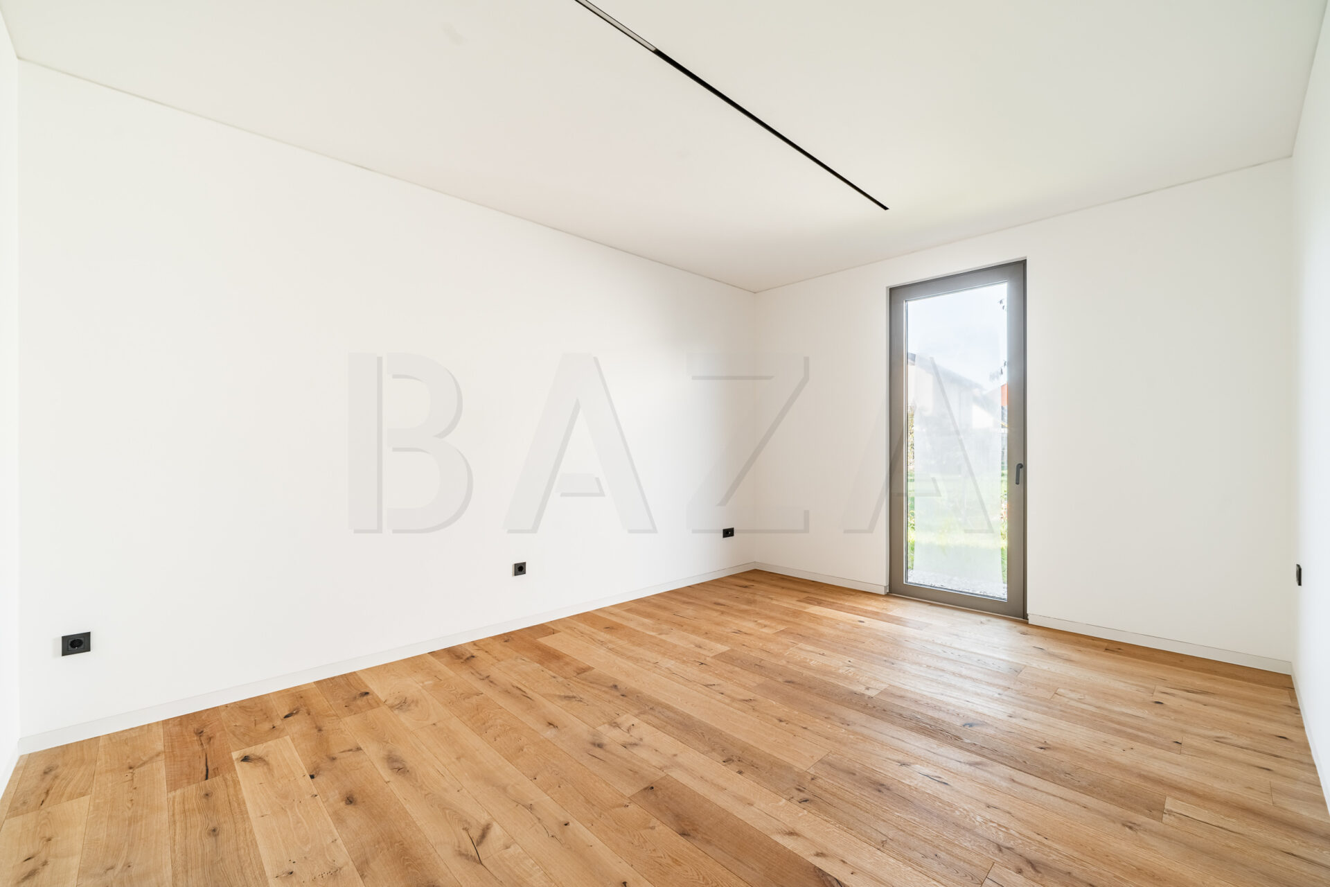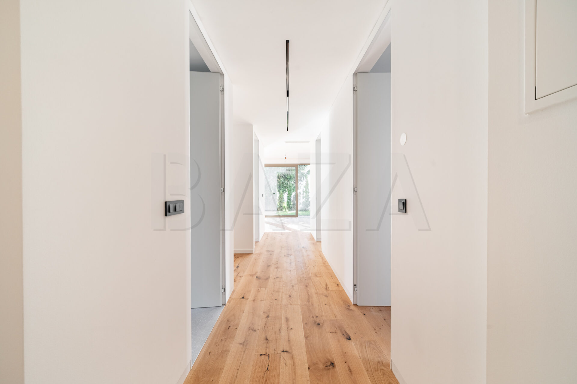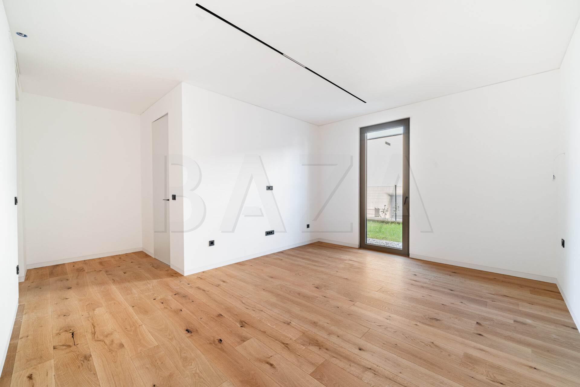 The functional layout includes an entrance hall, a master bedroom with an en-suite bathroom, two rooms, a large living area with kitchen and dining room (41 m2), and an additional bathroom with a utility room. The paved terrace in the greened atrium can accommodate a summer kitchen, and it is also possible to install a sauna or a pool. The highest quality materials have been used. The floors are covered with oak parquet, triple-layer ALU windows with narrow profiles (Arcont Prestige) and electrically operated exterior blinds are installed, solid interior doors with concealed hinges, ergonomic door handles (Tupai), smart track lighting (Denkirs Smart), sanitary equipment (Treeemme), burglar-proof and fire-resistant entrance doors (Dierre). The apartment includes a covered parking space of 51 m2 with preparation for an electric charger.