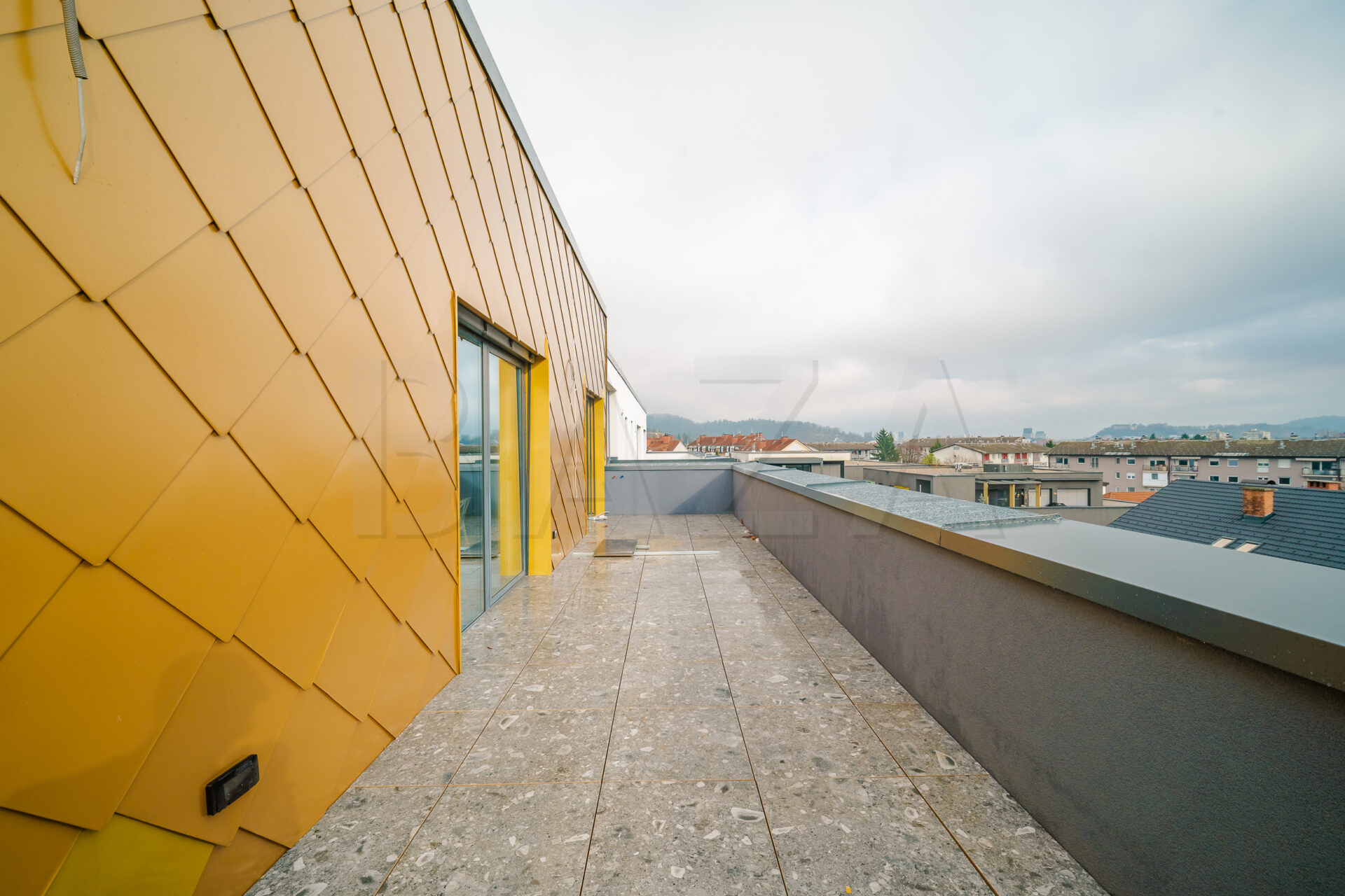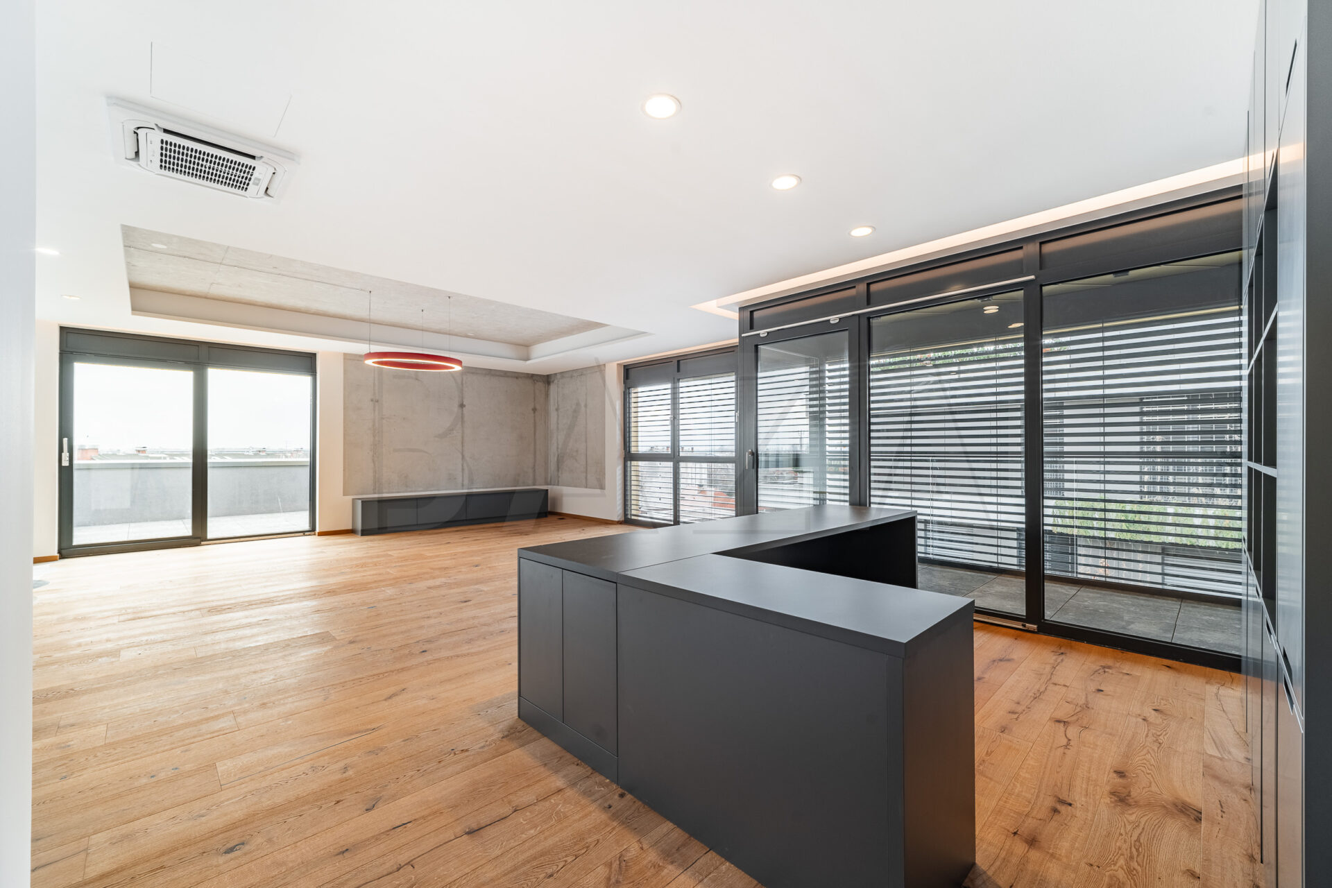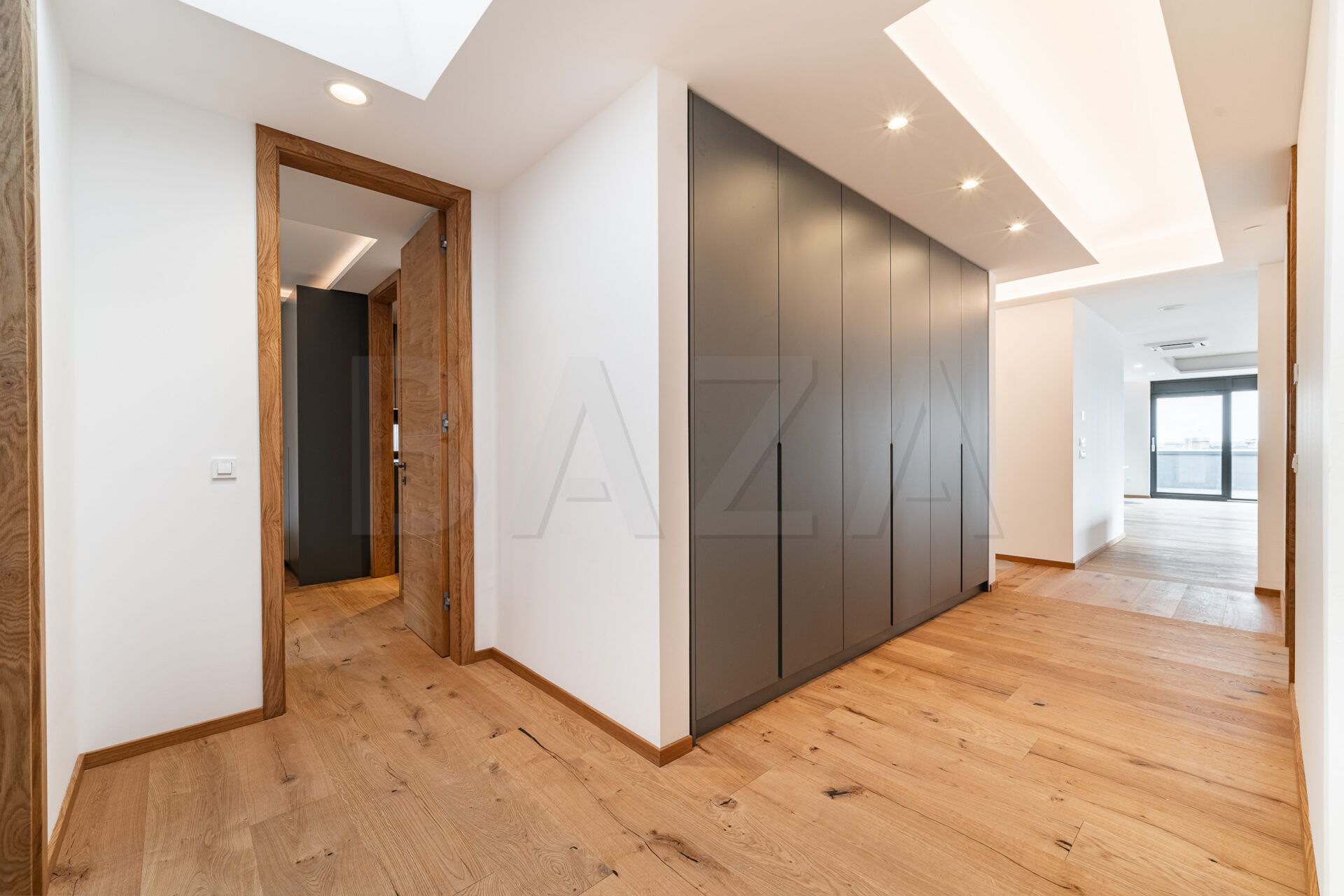 The apartment is oriented in all directions and includes an entrance hall, sanitary facilities, an open living area with kitchen and dining room, a living room with an office corner, a storage/utility room, a bathroom, two children’s rooms, and a master bedroom with an en-suite bathroom. A special feature of the apartment is the huge balcony with a view of Ljubljana Castle.