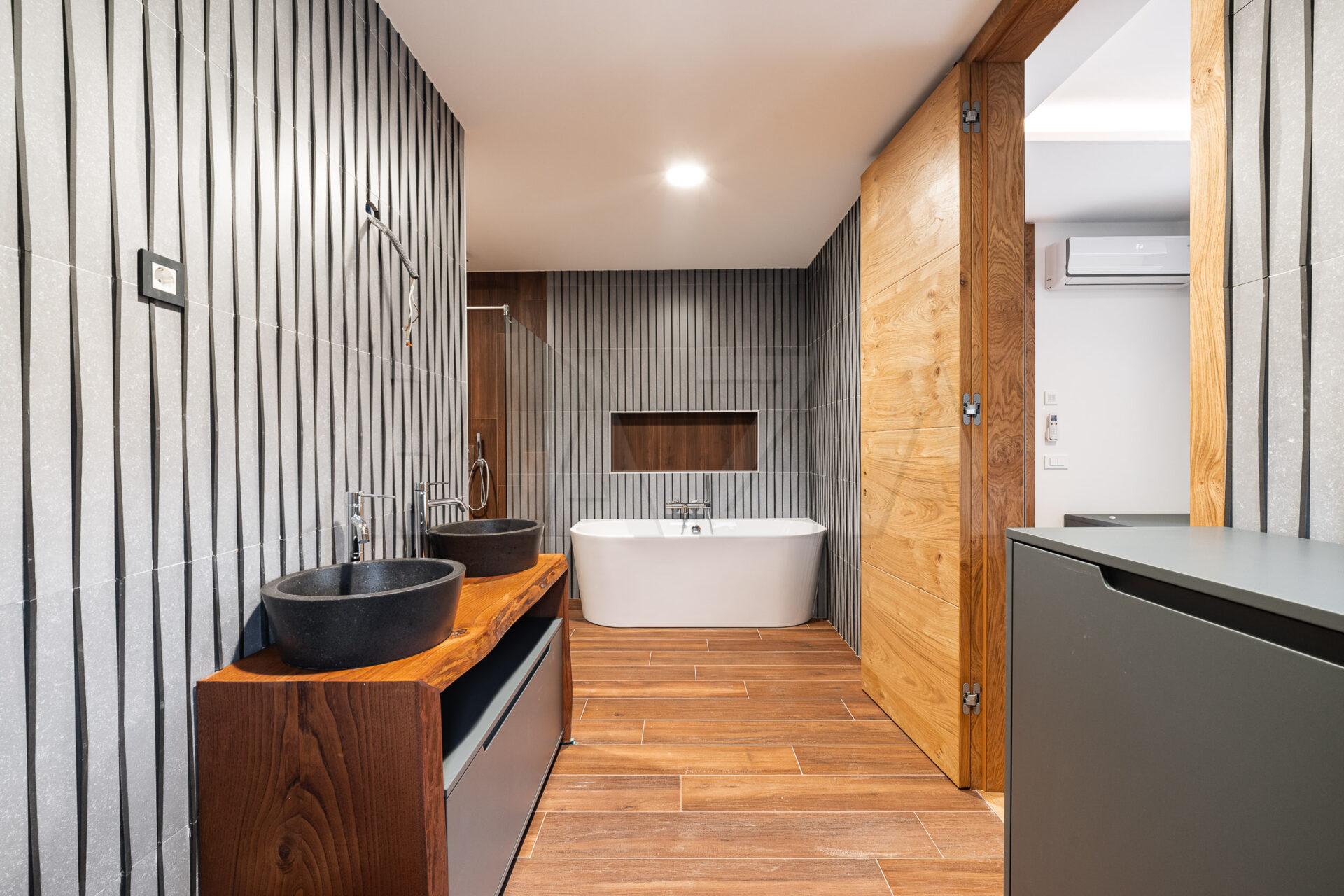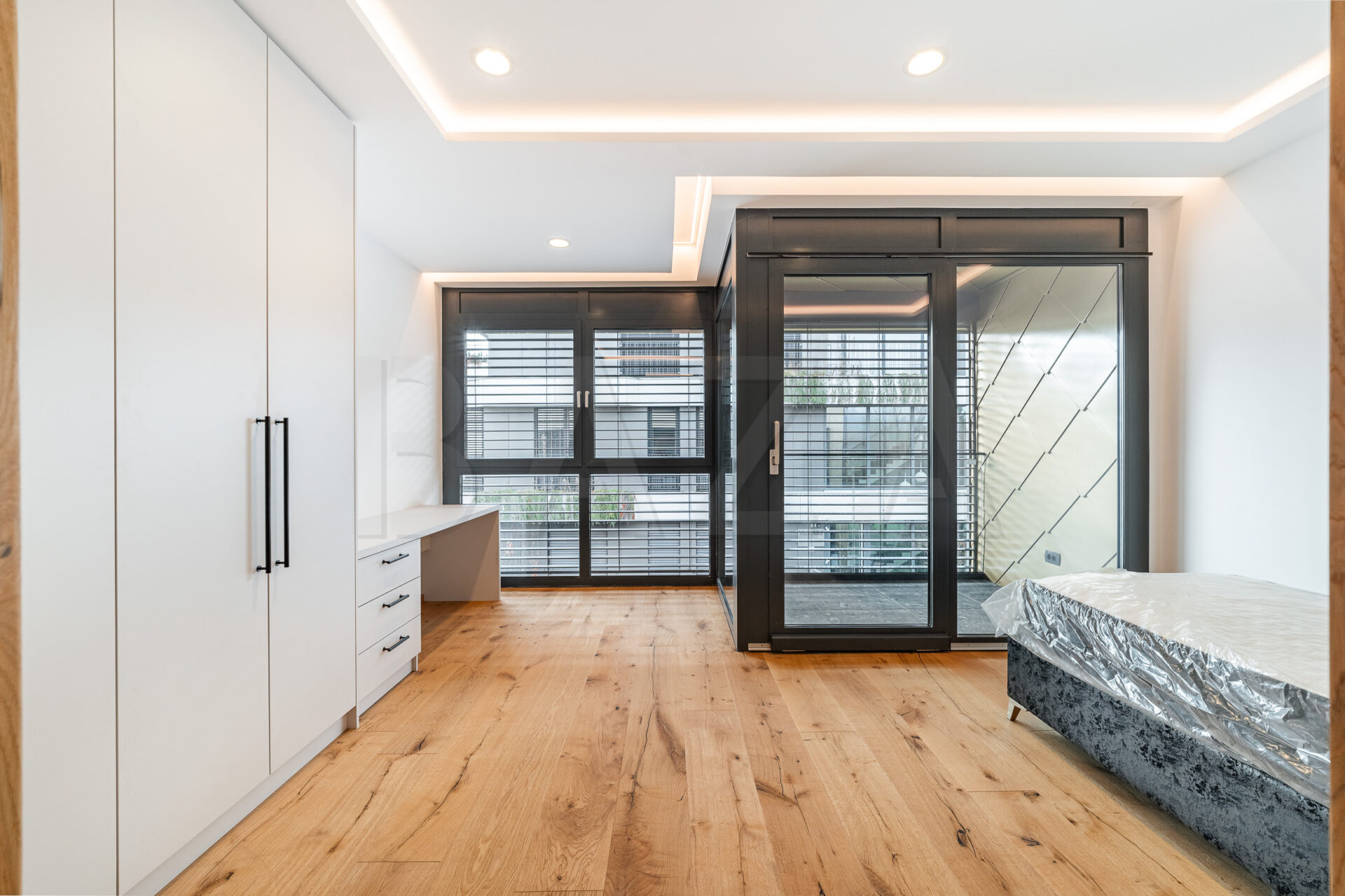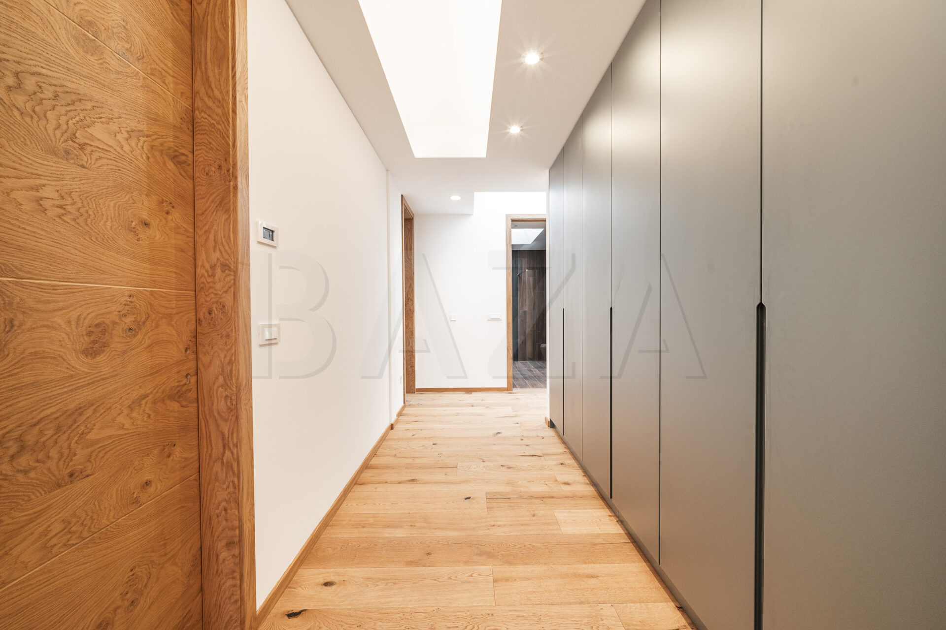 The apartment’s furnishings are custom-made. The kitchen is equipped with an oven, built-in microwave, extractor hood, dishwasher, refrigerator with freezer, and an induction cooktop; the bathroom includes a washer-dryer. All equipment is of high quality, and high-quality materials were used in the construction.