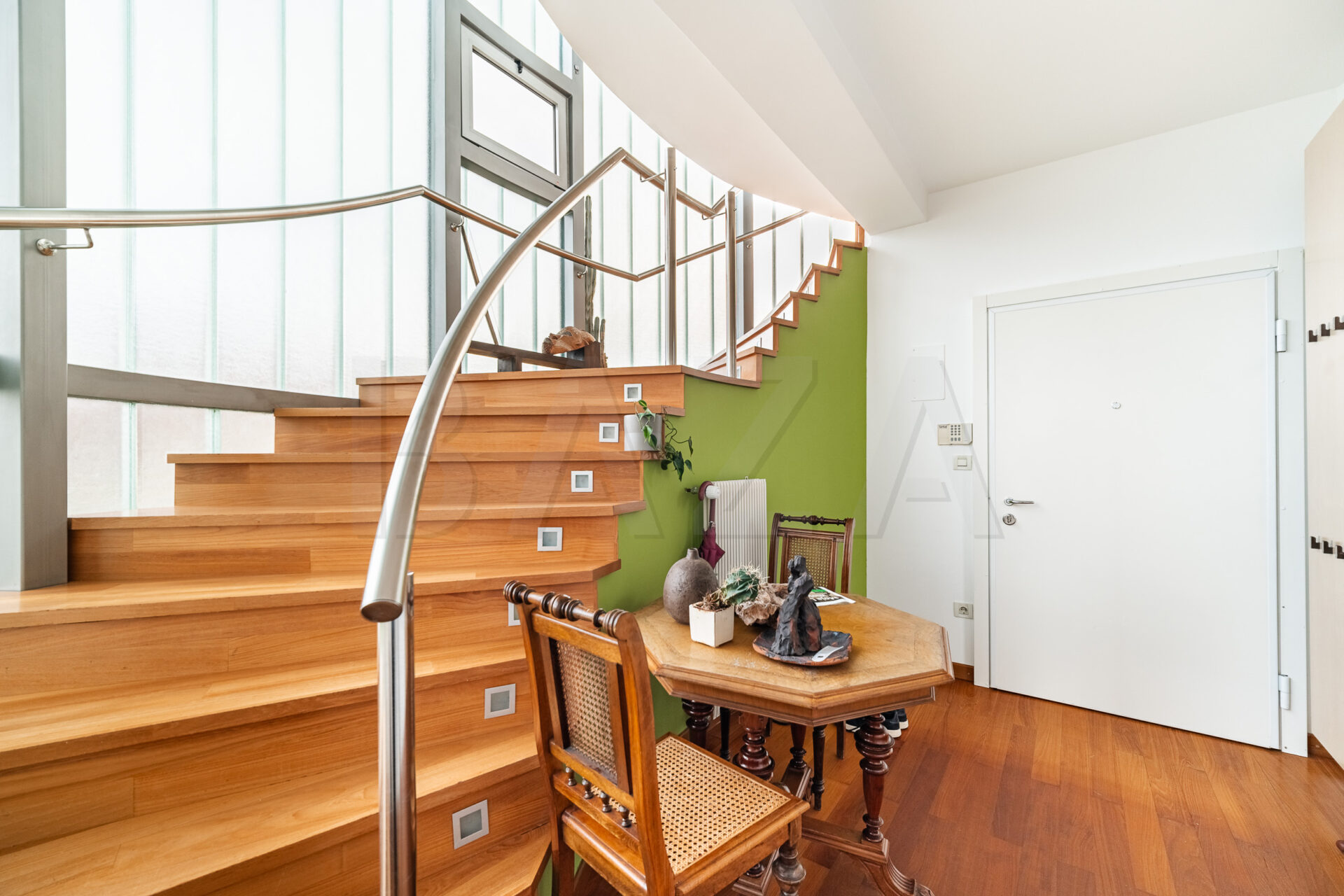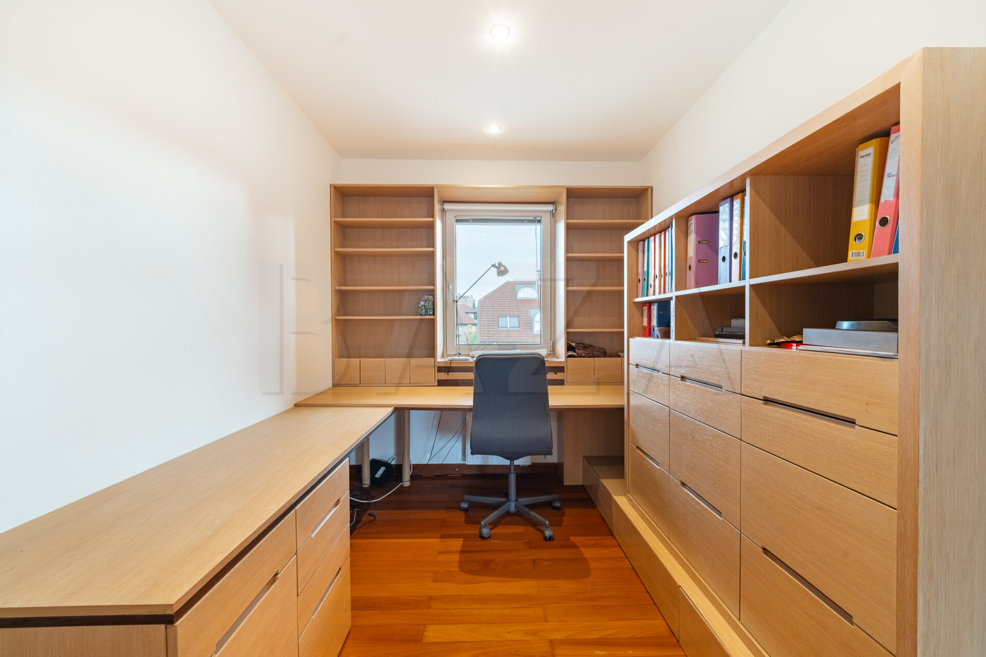 The entrance area includes a large hallway with its own staircase leading to the living area, but there is also an elevator with direct access to the apartment. The floor plan consists of a large living room with kitchen and dining area, and access to two terraces, a master bedroom with a separate office space and walk-in closet, two additional bedrooms, an extra bathroom and utility room. The apartment also comes with two parking spaces in the garage and a cellar storage room.