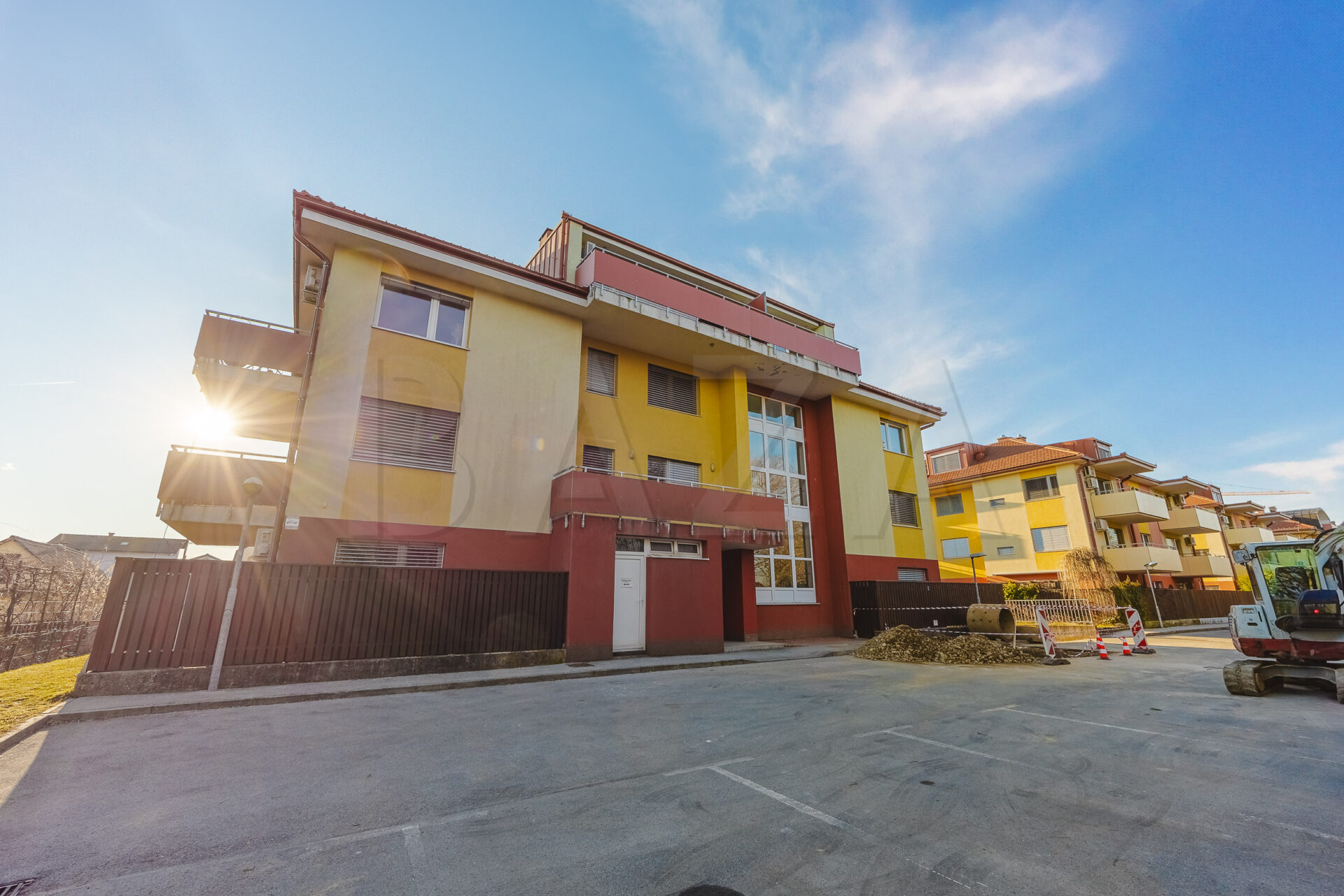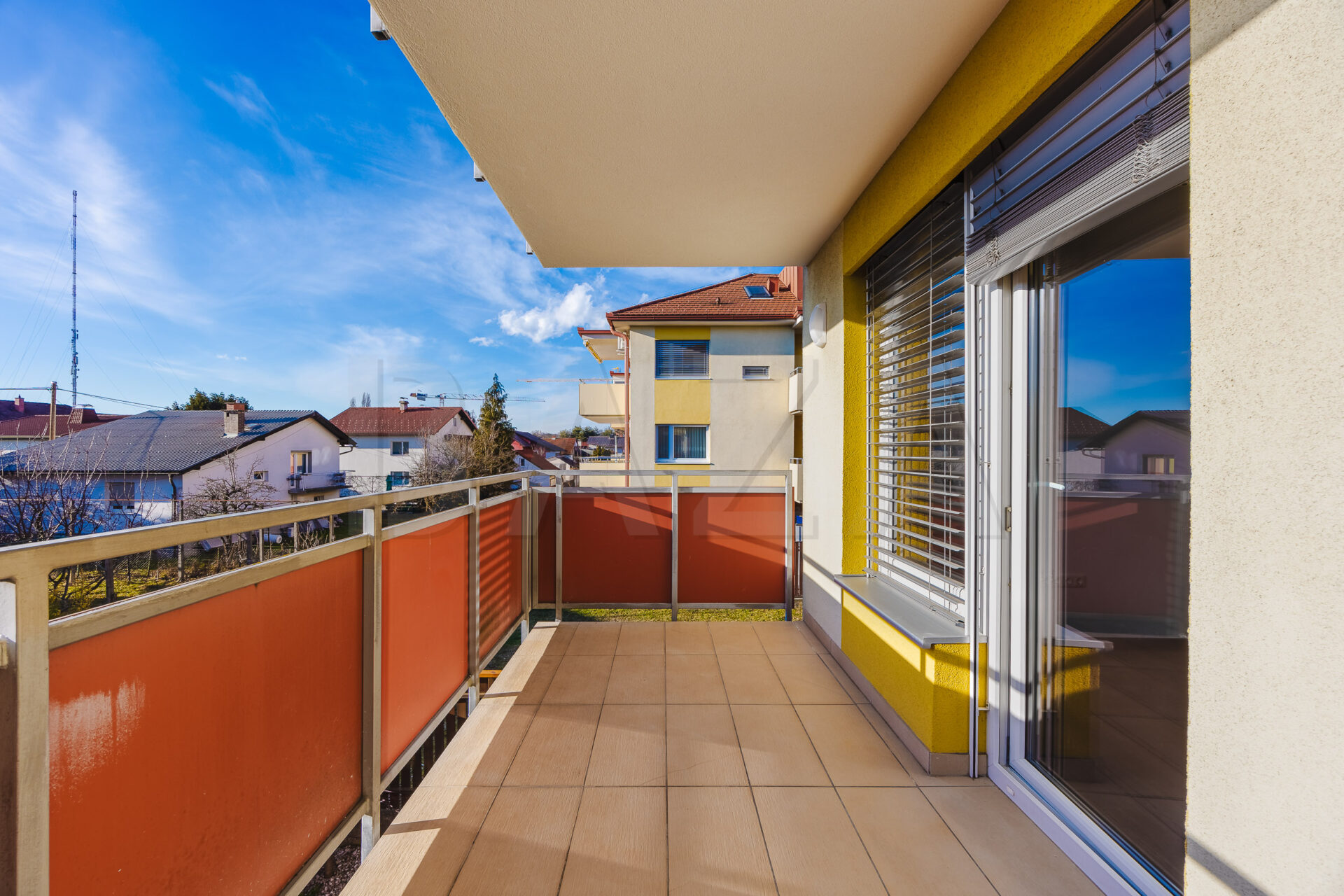 The floor plan includes a hallway leading to a storage room, two separate bedrooms, a bathroom with a shower cabin, bathtub, and two sinks, as well as a separate toilet. The living area with kitchen and dining room is designed in an open concept and provides access to a balcony with a view of Pohorje. The apartment is rented furnished with a kitchen, ceramic hob, oven, extractor hood, and dishwasher; the tenant will provide the remaining furnishings. It is oriented towards the southeast and southwest.