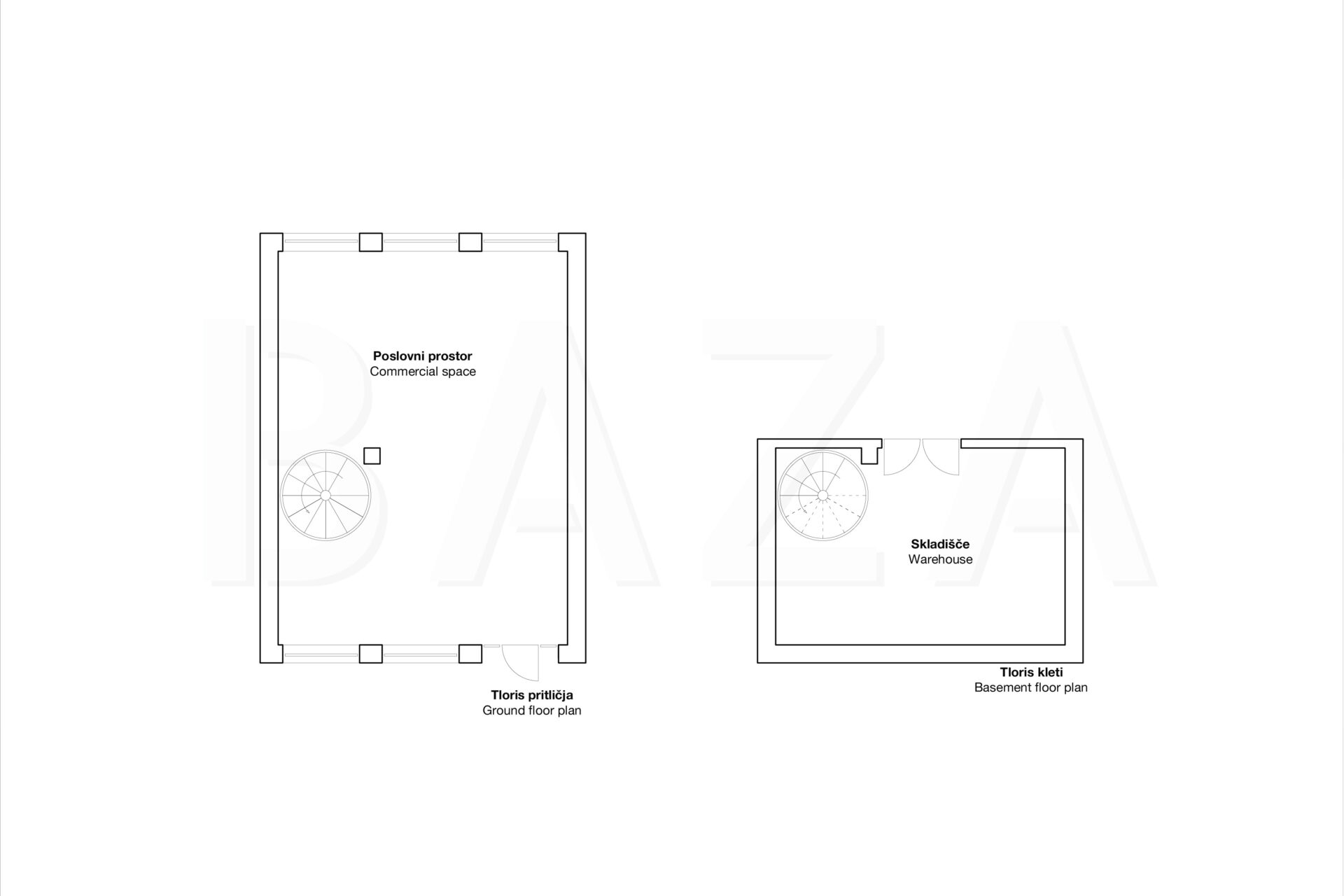 The commercial space is currently set up for conducting salt therapy treatments. The ground floor layout includes a reception area (with the possibility of a display section) with three rooms, two bathroom facilities, a communication area, and an office. The lower floor comprises two rooms and a utility room as well as a smaller storage area that can be converted into sanitary facilities. The space offers direct connection to the garage area, where it is possible to rent or buy a parking spot. Most partition walls were added during the arrangement of the space for the salt therapy activity and can be removed if a new use of the space requires it.