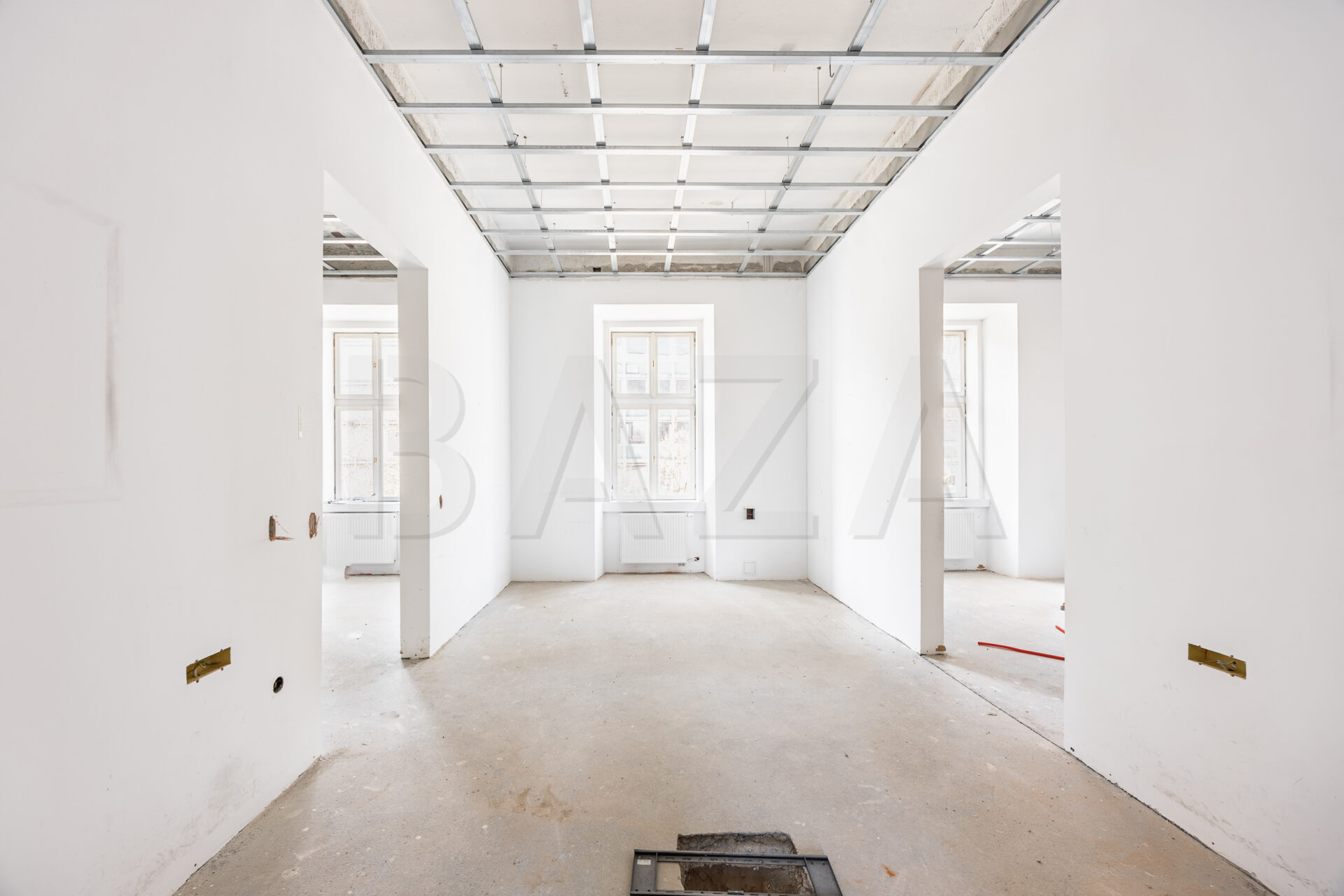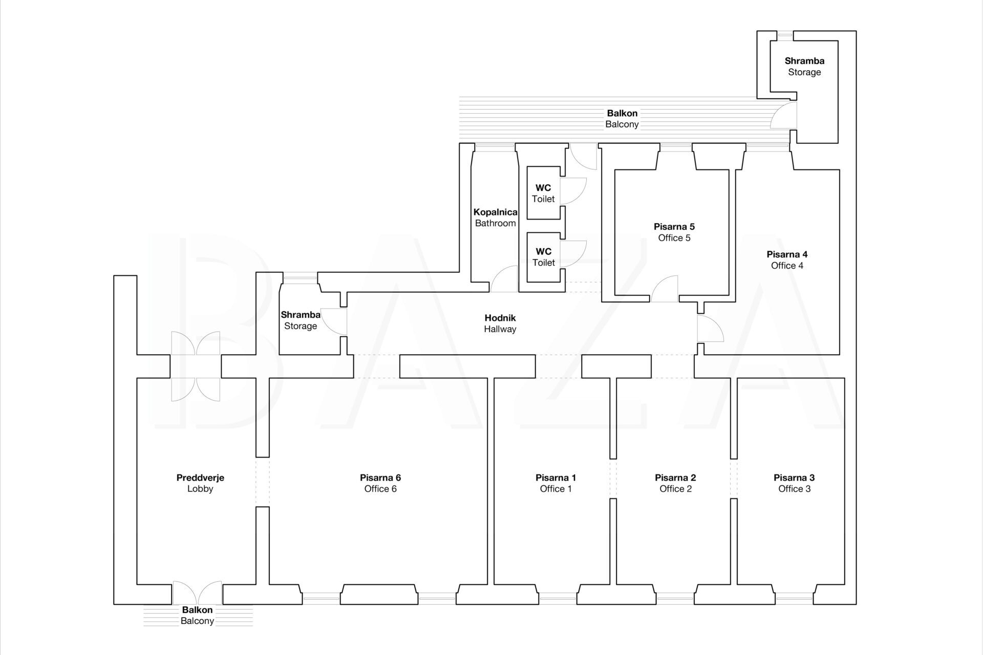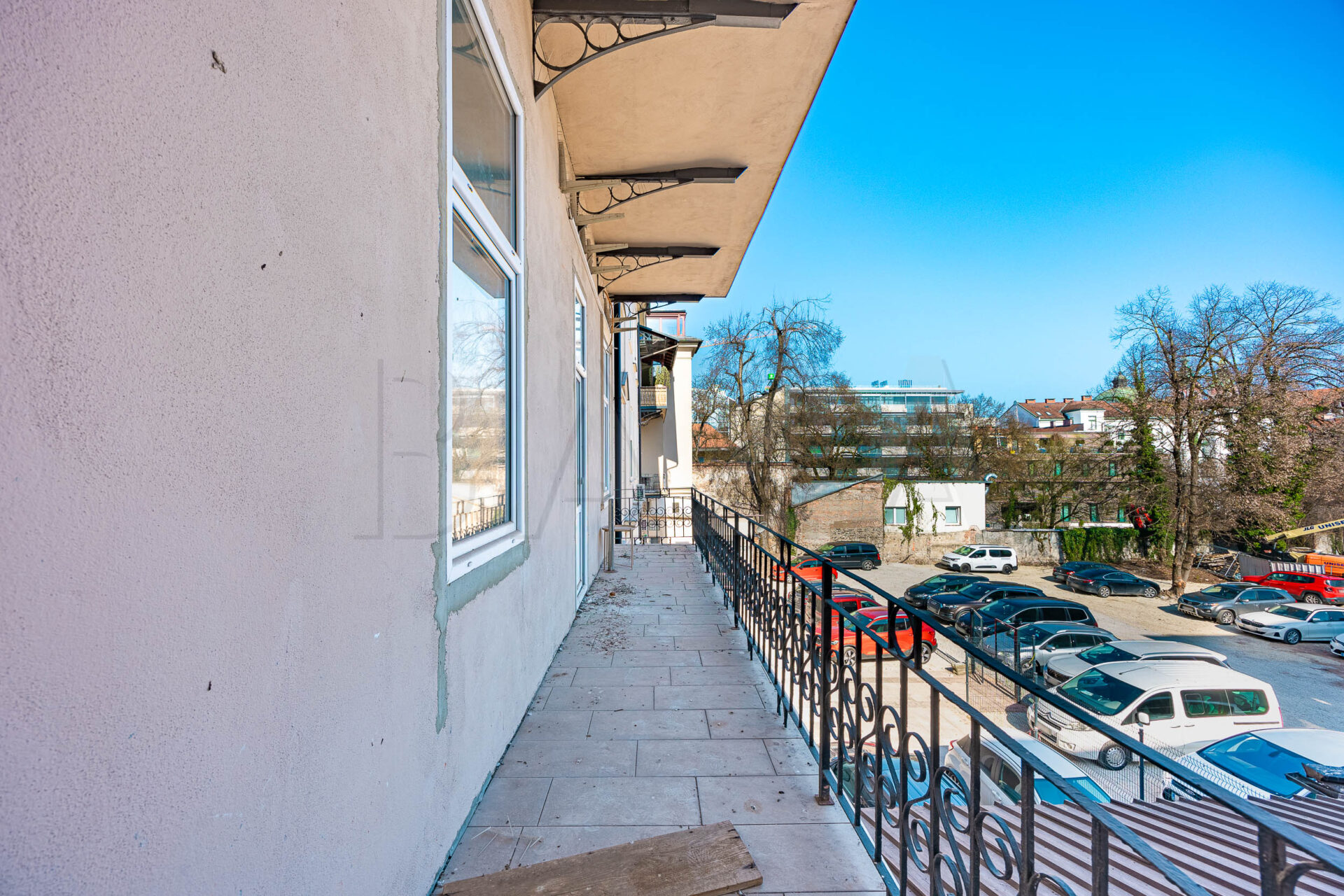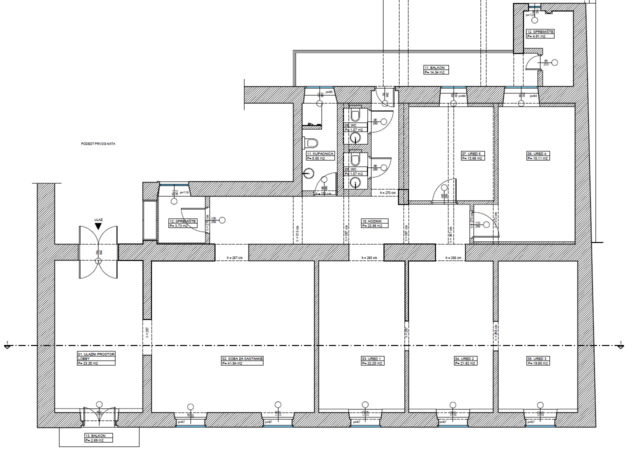 The space is located on the first floor of a representative building in the city center. It comprises six offices, double restrooms, an entrance lobby, and two balconies. Access is via an old-town staircase, and the space features high old-town ceilings. The tenant finishes the space according to their preferences and business needs. Current monthly heating costs amount to 300 EUR, with other utilities charged based on consumption. The tenant pays property tax. Parking for one vehicle is allowed in the building’s inner courtyard.