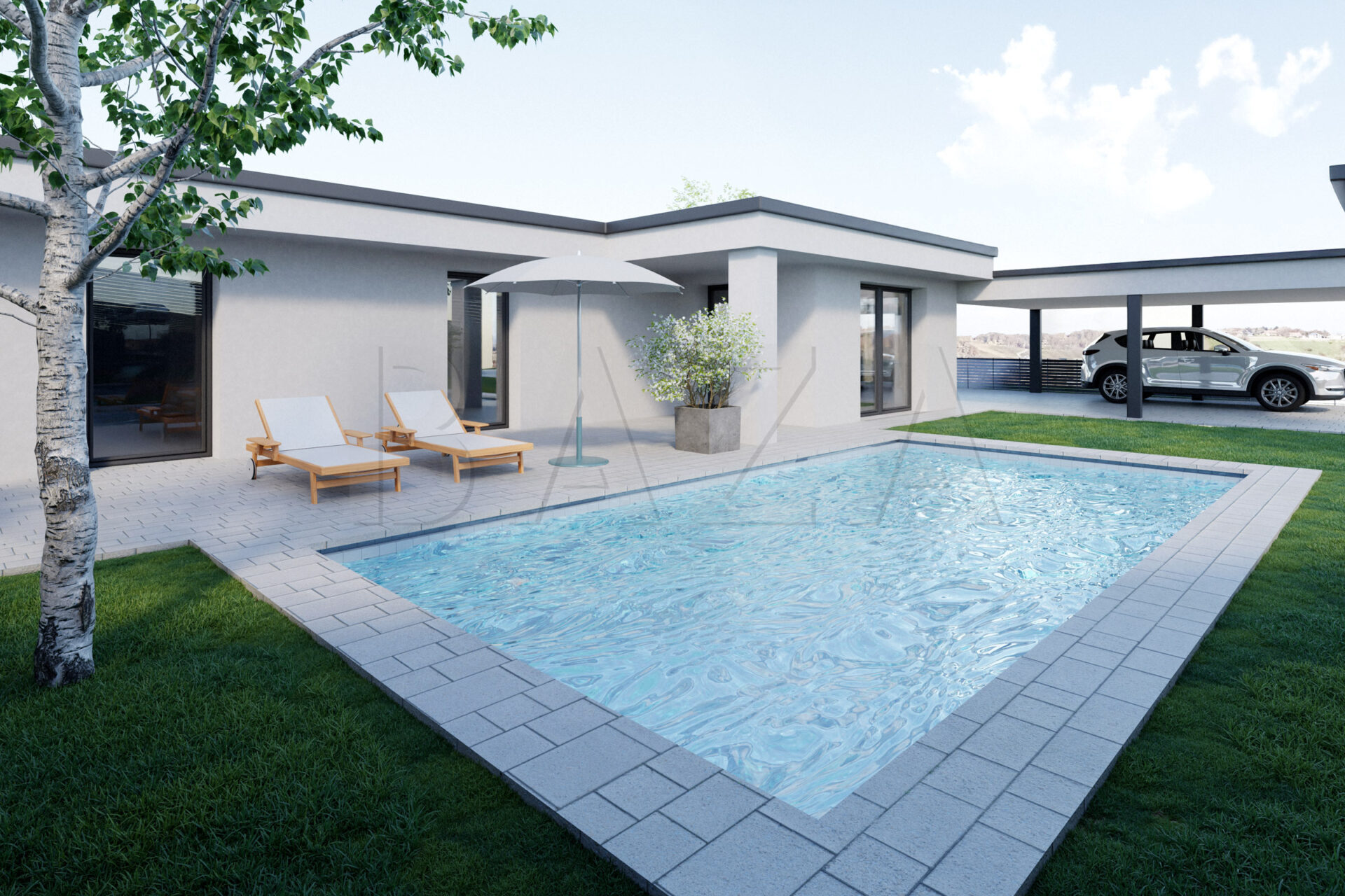 The floor plan of the house consists of one storey. The net living area of 133,35 m2 comprises an entrance hall, a large kitchen with a dining room and a living room, a bathroom, four bedrooms and a utility room. The living room has large panoramic windows providing plenty of daylight and connecting the interior space with a spacious covered terrace on the east side. A garage will be located next to the building, providing parking for two cars.