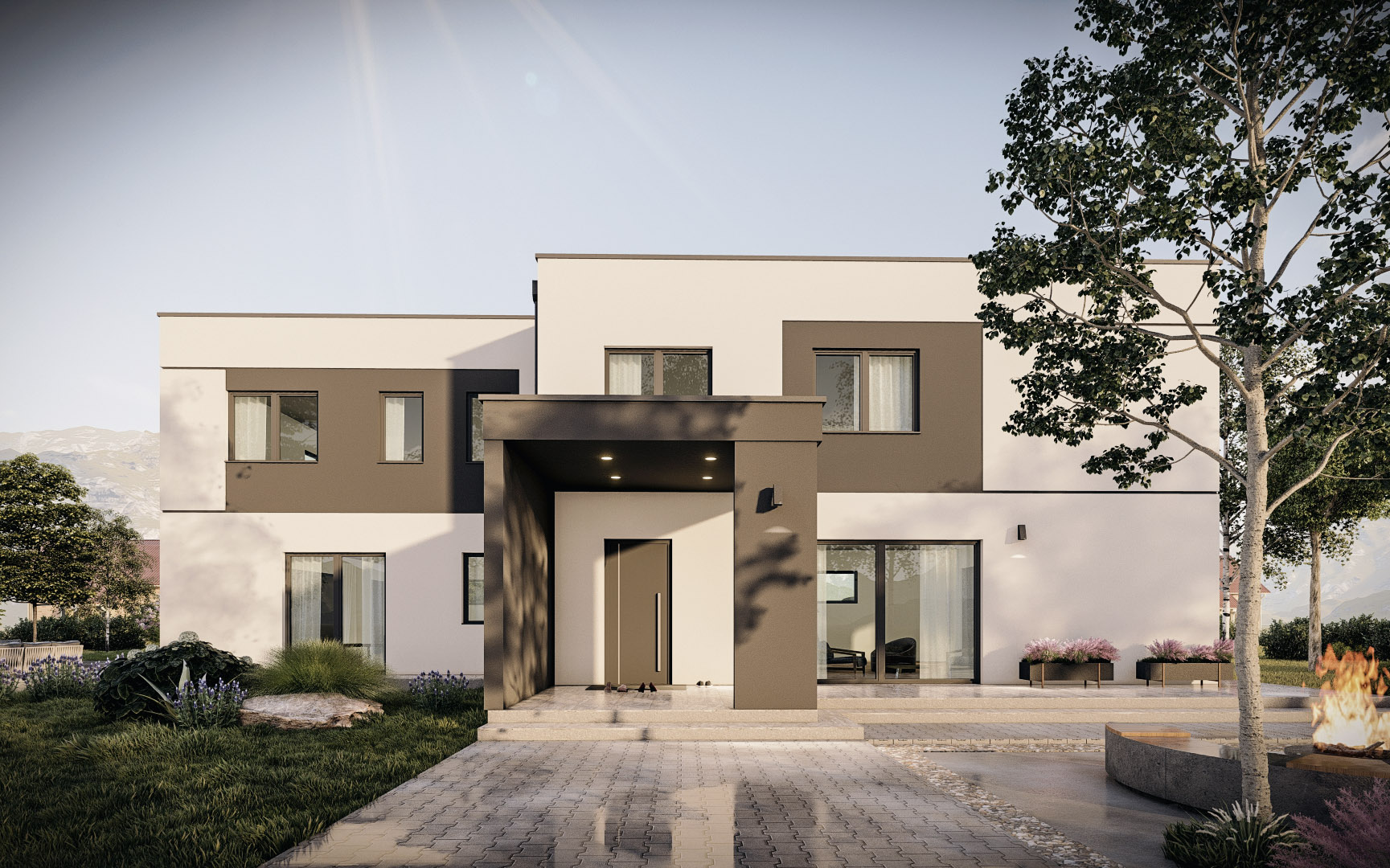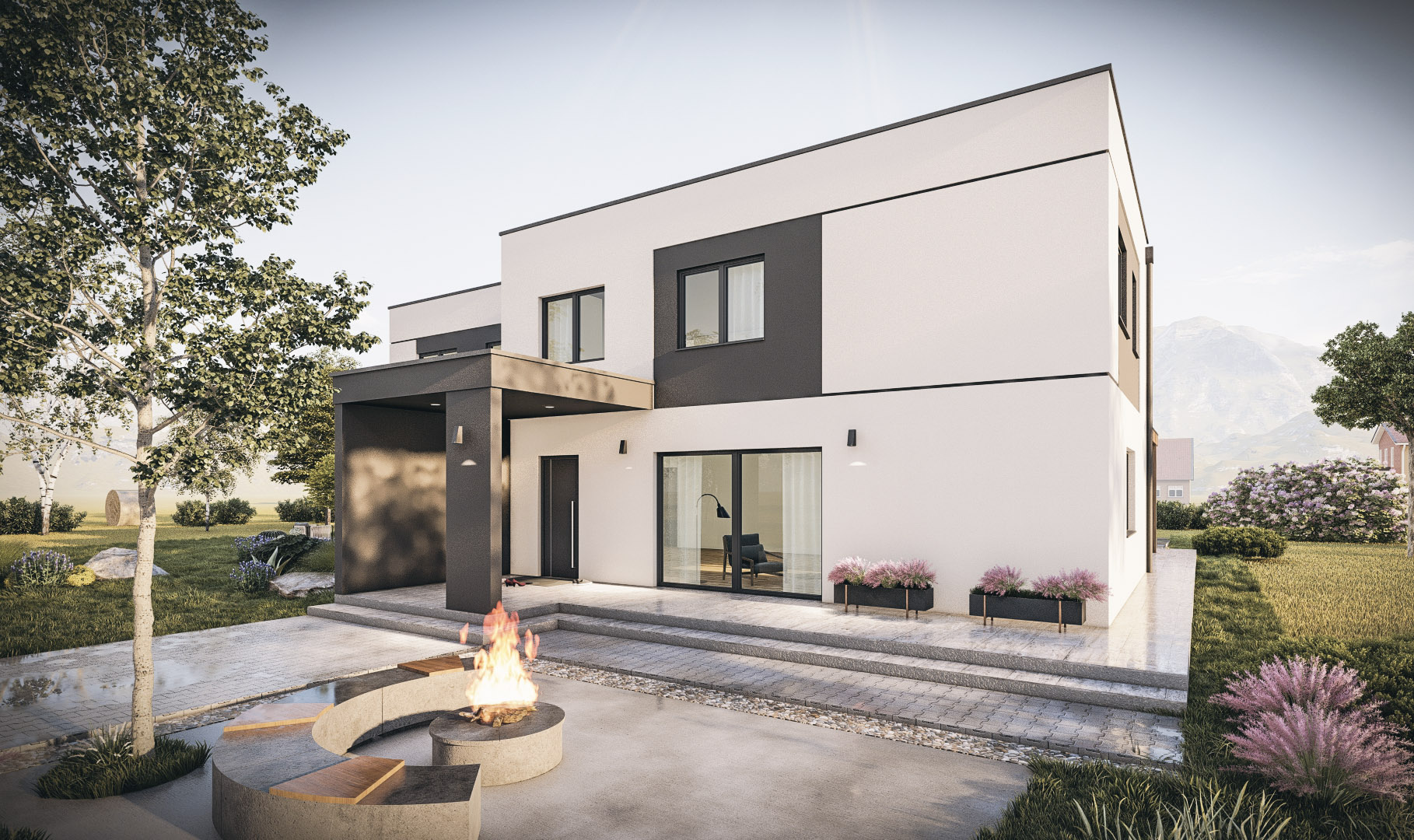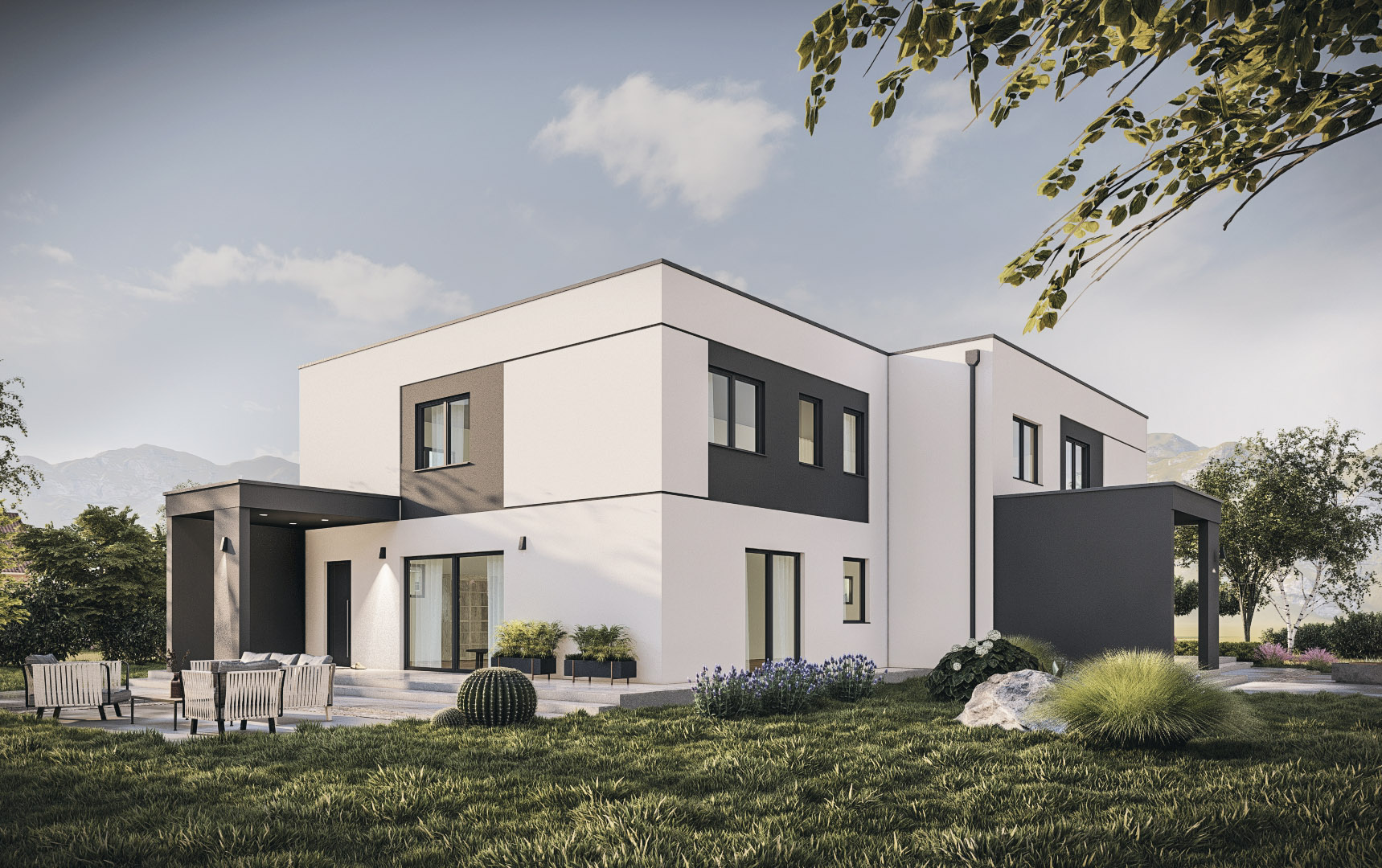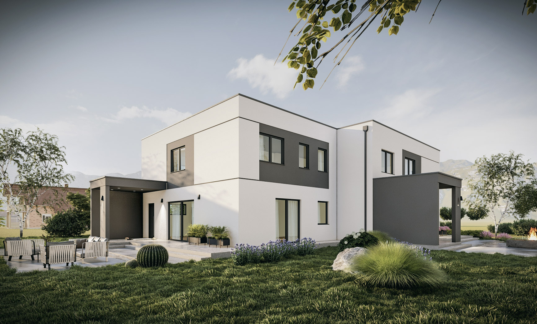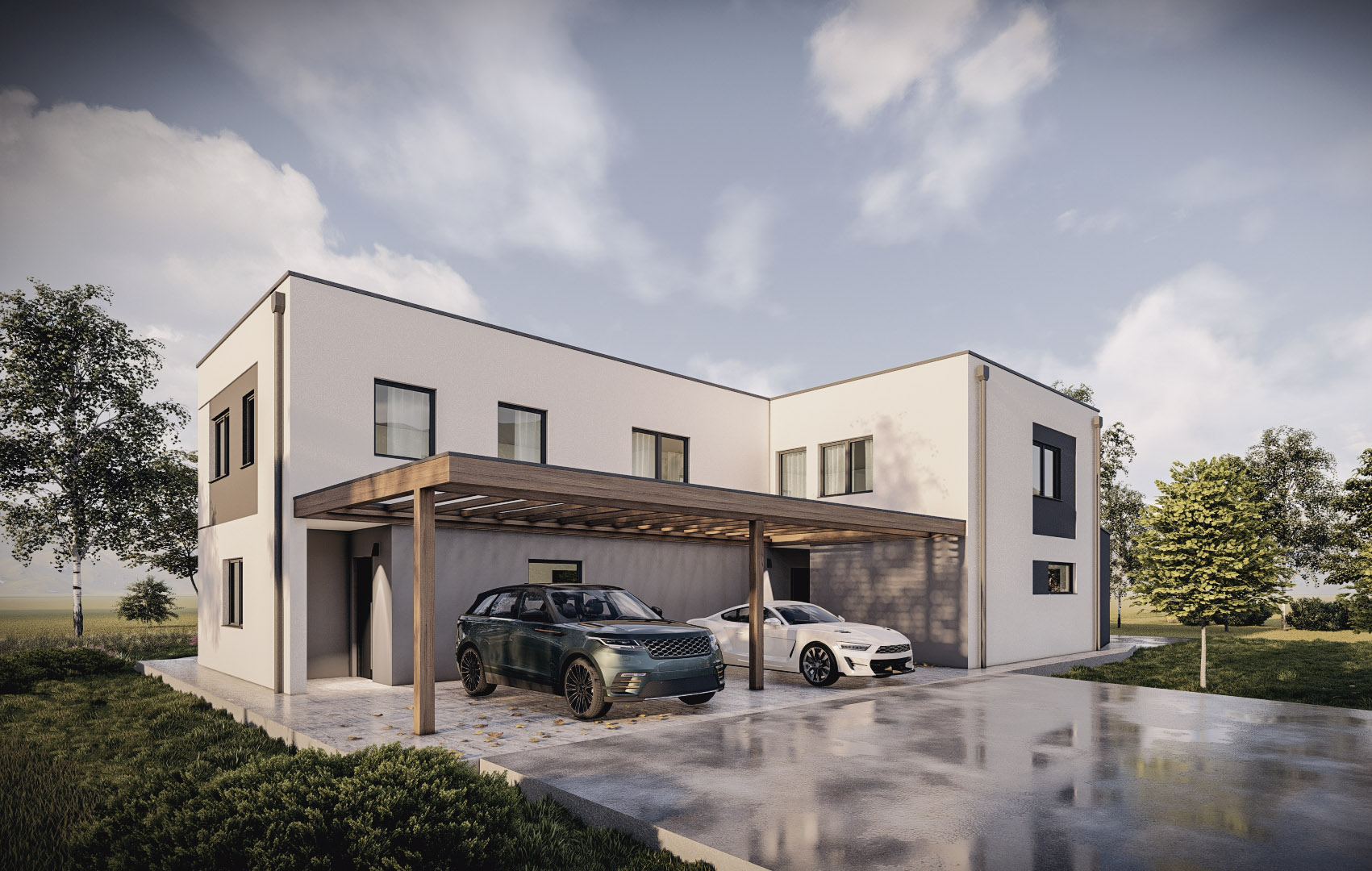 The house will be finished turnkey to the highest standards. It is a quality energy-efficient prefabricated construction. The prefabricated walls contain 18 cm of insulation, the exterior insulation is 15 cm of Neopor and facade. The two units of the building are structurally separated (double wall, expansion joint, and insulation between units). The roof is flat with Sika pool foil, insulation, and covering. An additional gravel roof protection is possible. Modern PVC joinery with triple glazing will be installed. Heating will be underfloor with a heat pump and an integrated boiler for sanitary water. Floor plan and installation adjustments are possible during construction. The buyer has the option to choose all final materials – floor and wall coverings, sanitary ceramics and fittings, interior doors, and interior paint; blinds are available for an additional charge. Air conditioning, heat recovery ventilation, and electric car charging station are possible. The surroundings will be paved and filled, with outdoor lighting, arranged embankment, covered terrace, and carport.