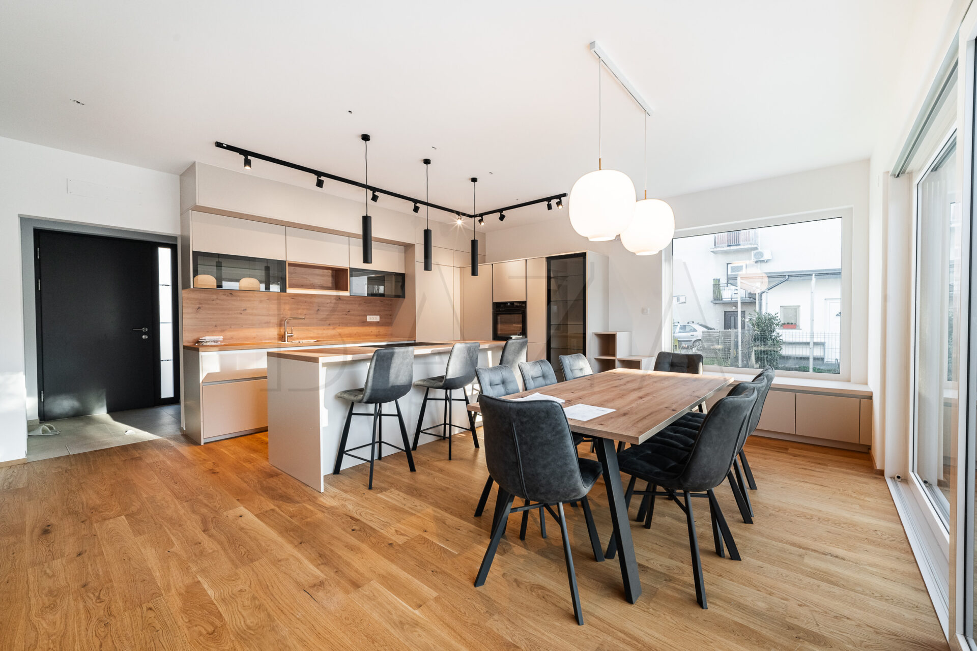 Unit in a two-apartment building, Ljubljana – Rožna dolina, new construction 2025, ground floor + 1st floor + attic, net floor area 176.40 m2, living area 146.00 m2, terrace 30.40 m2. Price: 3000.00 EUR/month.