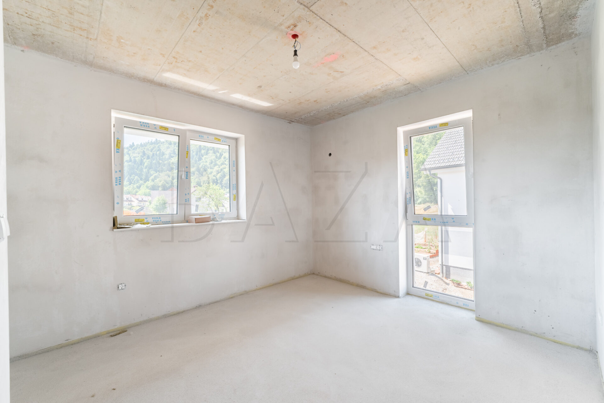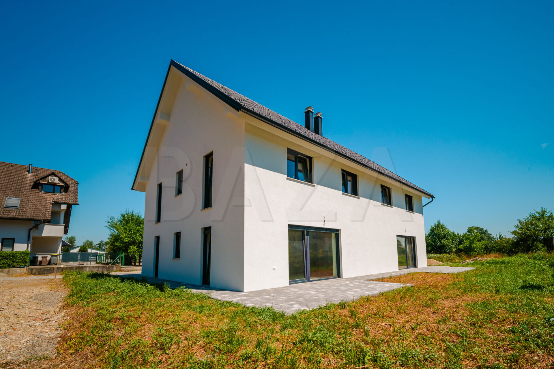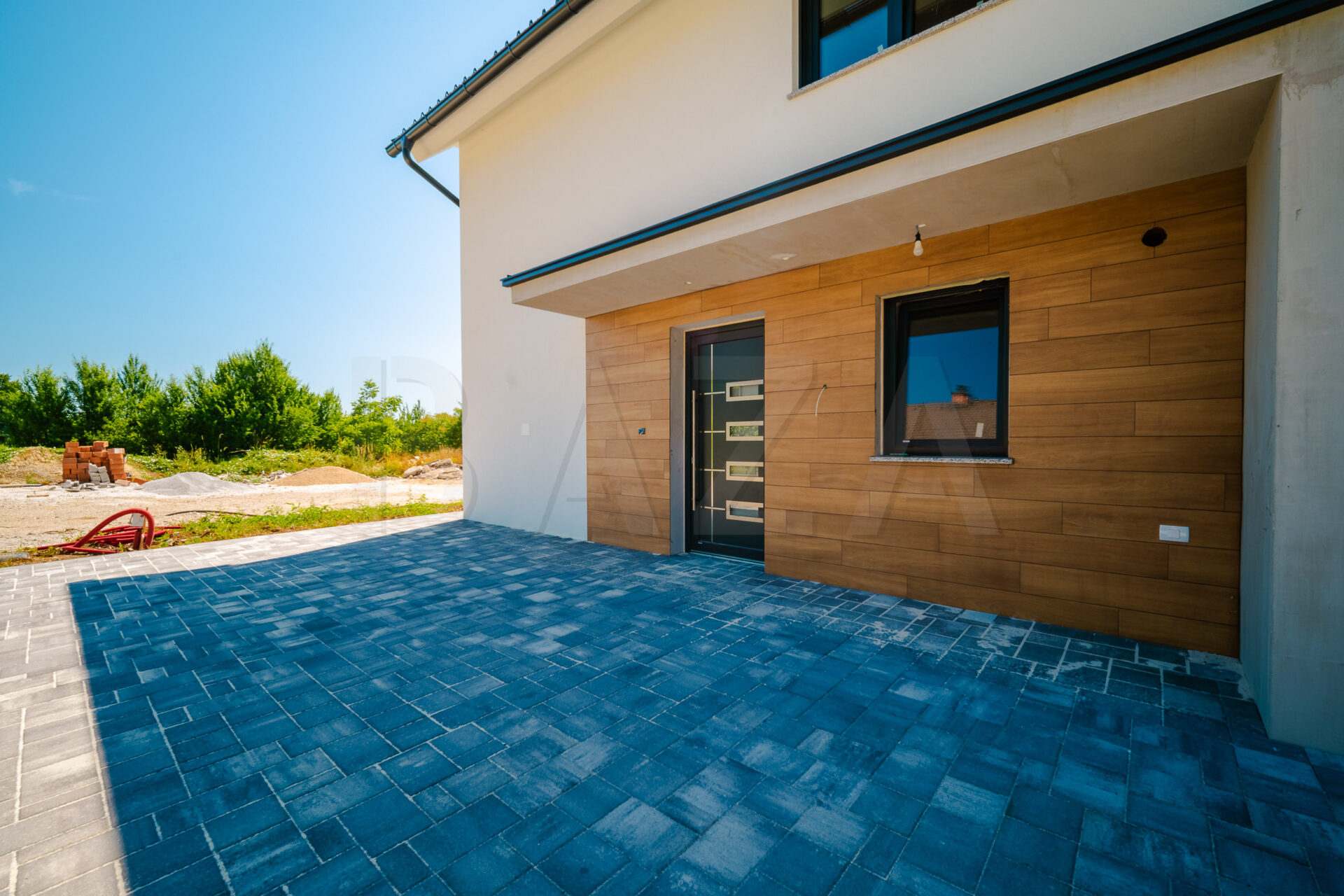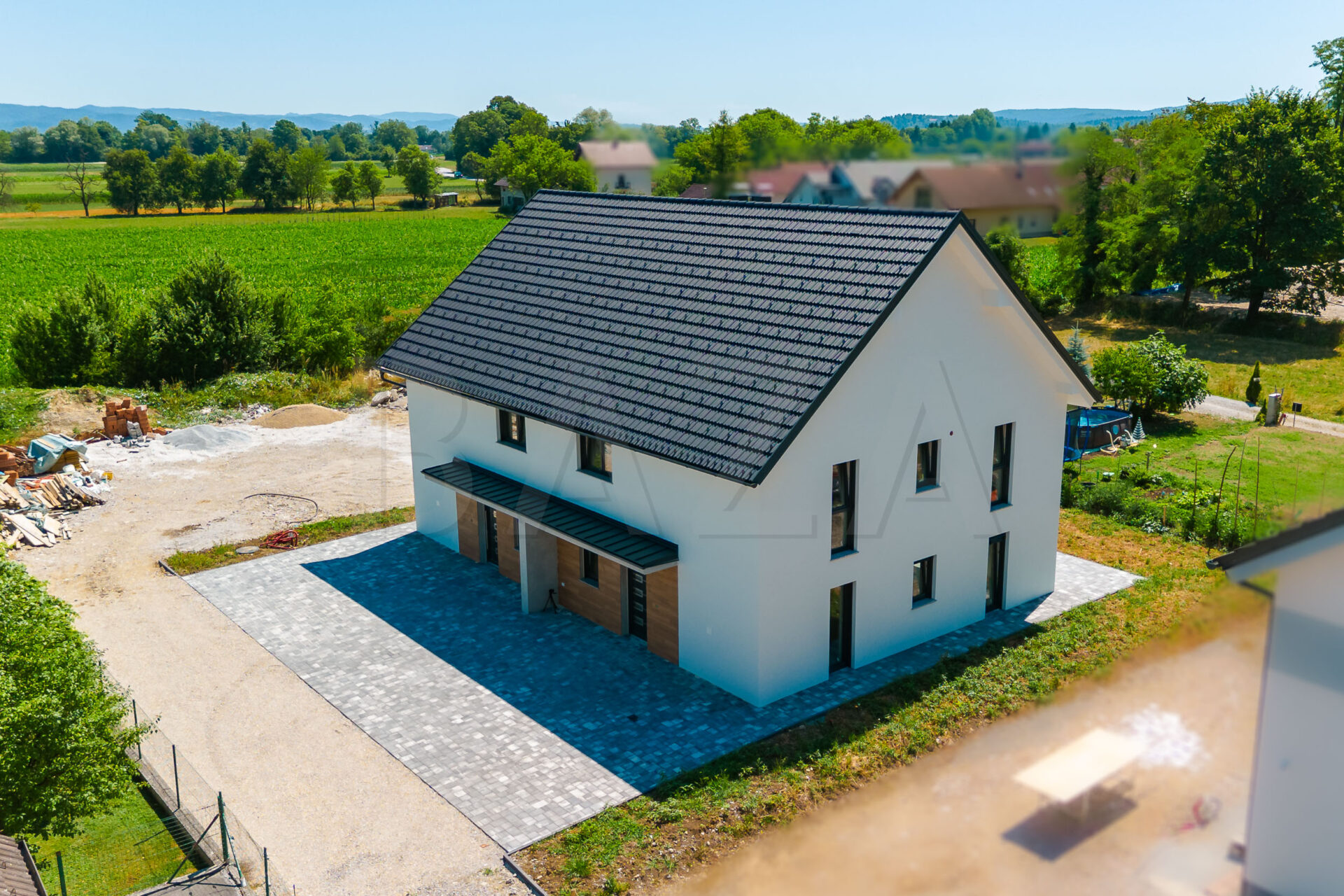 The unit will be built from quality materials, with high-quality triple-glazed PVC windows with external blinds and preparation for mosquito nets. The wall insulation thickness is 20 cm. Heating and cooling of the building is planned by a water-to-air heat pump, including underfloor heating. Preparation for a solar power system, electric car charger, fireplace (chimney), and a local ventilation system is also planned.