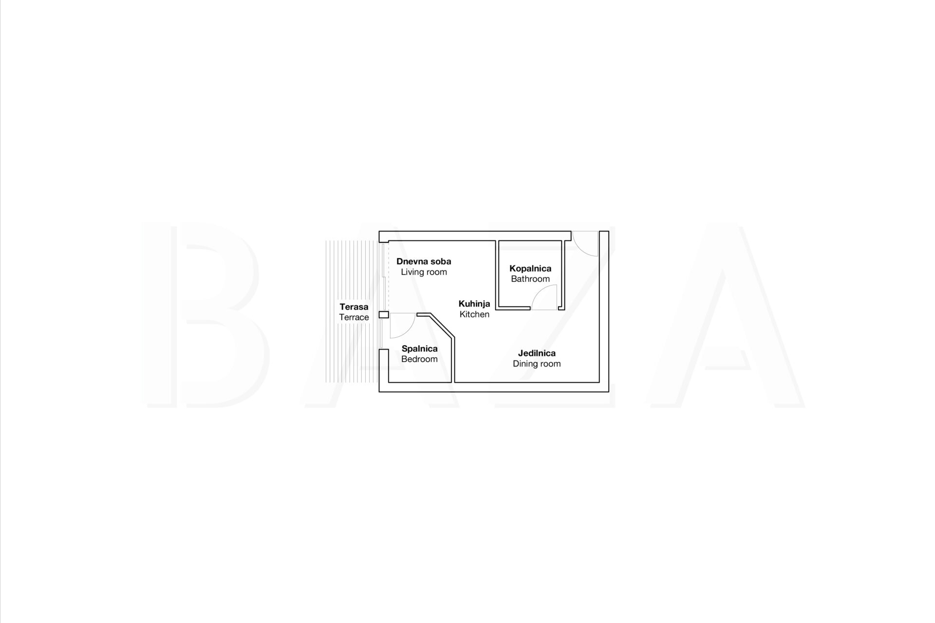 Razporeditev prostorov je izjemno funkcionalna. Ob vstopu v stanovanje je predprostor z vgrajenimi garderobnimi omarami, ki se nadaljuje v odprt dnevno-bivalni prostor s kuhinjo, jedilnico in dnevno sobo. Iz bivalnega prostora je neposreden izhod na teraso in atrij, prav tako ima izhod na atrij tudi spalnica. Kopalnica je sodobno urejena.