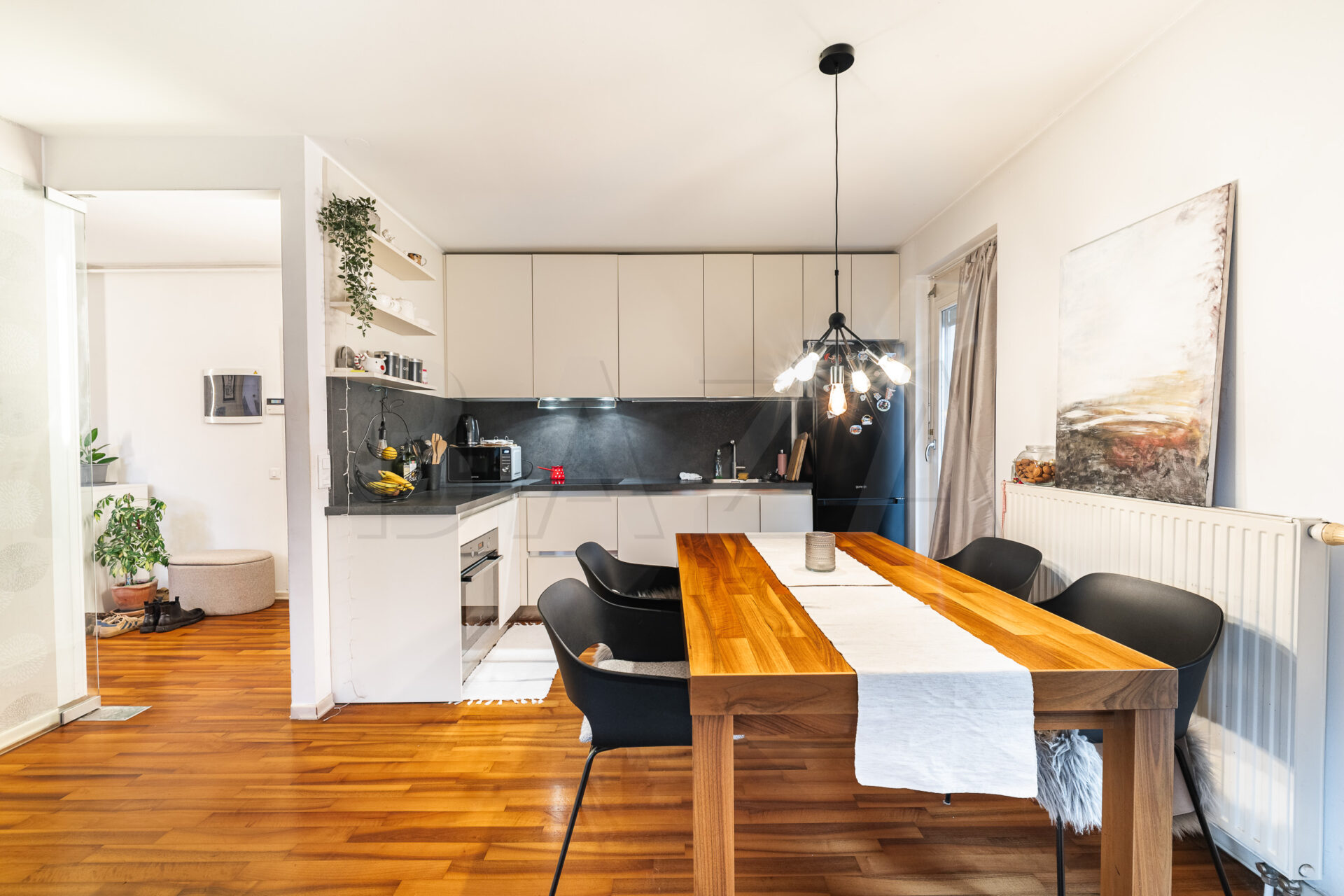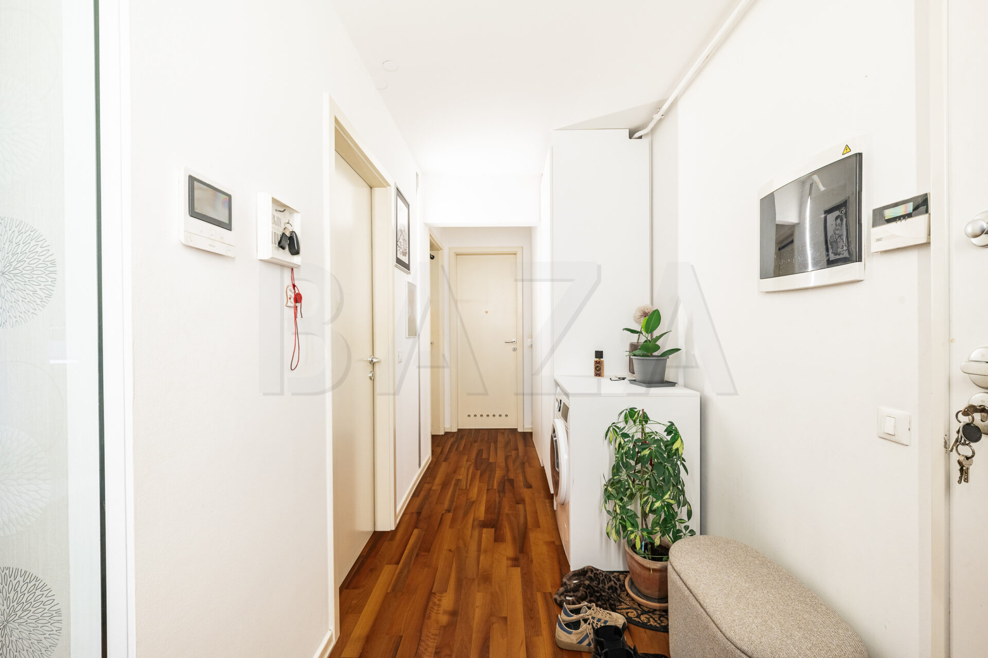 Stanovanje je orientirano tako, da omogoča veliko naravne svetlobe skozi ves dan. Tloris obsega predsobo, prostoren dnevno-bivalni del s kuhinjo in jedilnico, glavno spalnico, dodatno sobo ter kopalnico. Posebno dodano vrednost predstavljata velika zunanja terasa in loža. Stanovanju pripadata tudi shramba v izmeri 5,50 m2 ter dve lastniški parkirni mesti v garaži na dvižni ploščadi.