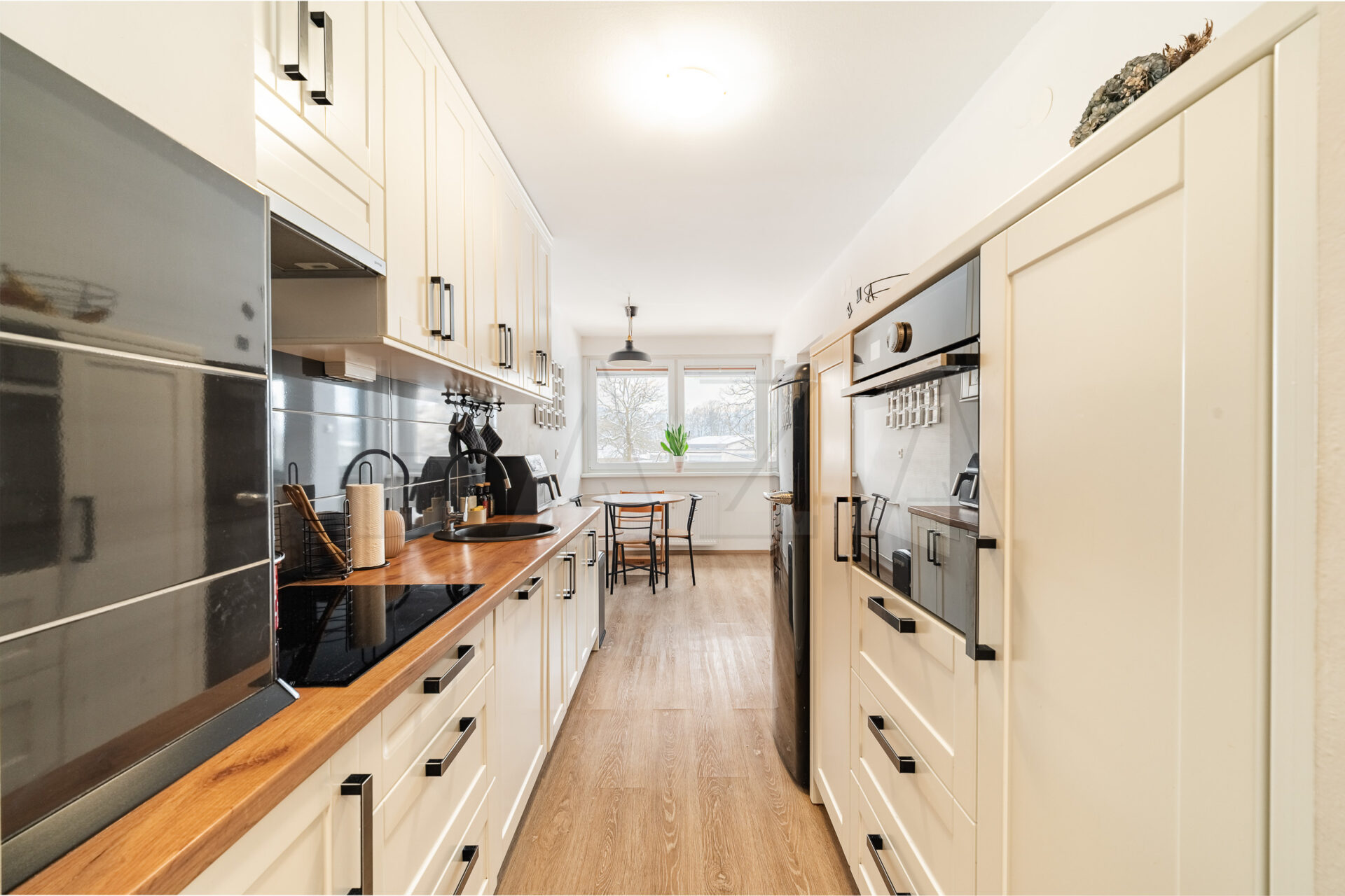 Stanovanje se prodaja popolnoma opremljeno, z opremo izdelano po meri. Kopalnica je opremljena s pralnim strojem, kuhinja pa z indukcijsko kuhalno ploščo, napo, hladilnikom, pomivalnim strojem in pečico. Na oknih so nameščena električna senčila, ki zagotavljajo dodatno udobje in zasebnost.