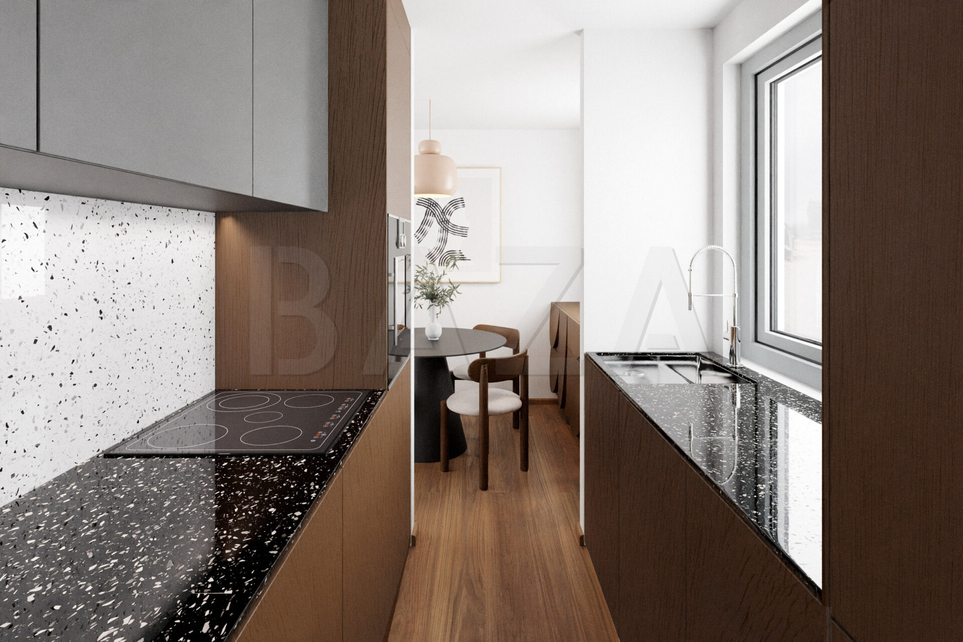Stanovanje je orientirano proti J in S. Odlikuje ga funkcionalna razporeditev prostorov in čudovita lega, ki nudi zasebnost in razglede. Tlorisna zasnova notranjosti obsega predsobo, osrednji dnevno-bivalni prostor s kuhinjo in jedilnim kotičkom, dve prostorni spalnici, kopalnico ter velik, deloma zastekljen balkon. V ceno je vključena tudi stanovanjska oprema. V kleti stanovanju pripada drvarnica (4,00 m2).