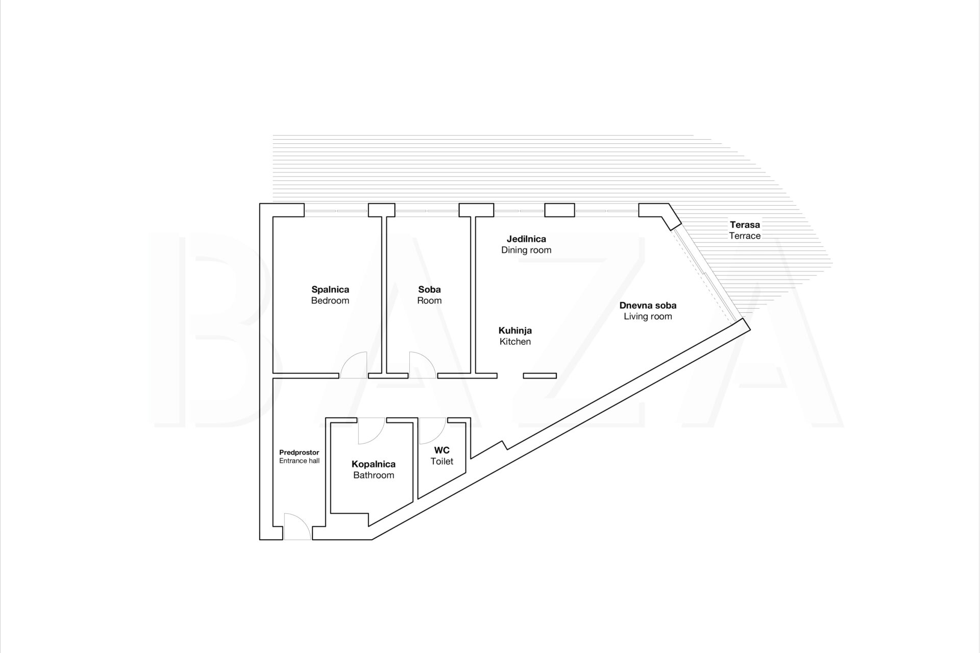Tloris stanovanja je logično razdeljen na bivalni in spalni del. Dnevni prostor se prek velikih steklenih površin odpira na prostorno teraso s pogledom na Kamniške Alpe. Terasa je dovolj velika, da omogoča ureditev zunanjega salona, jedilnega kotička ali prostora za sproščanje. Spalni del je umeščen v mirnejši del stanovanja in vključuje dve spalnici ter sodobno kopalnico. Prostornost in dobra organizacija omogočata udobno bivanje tako posameznikom kot družinam.