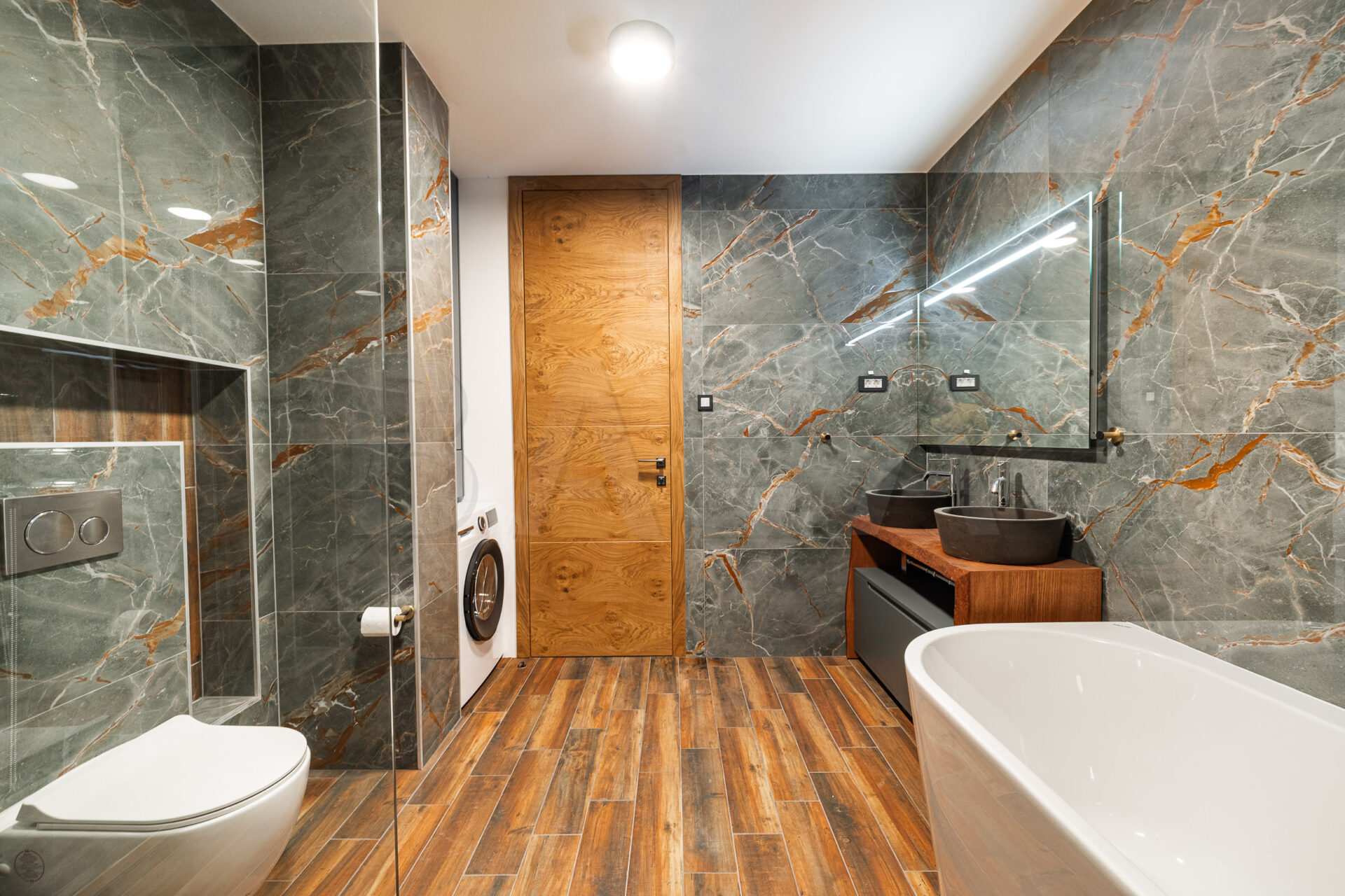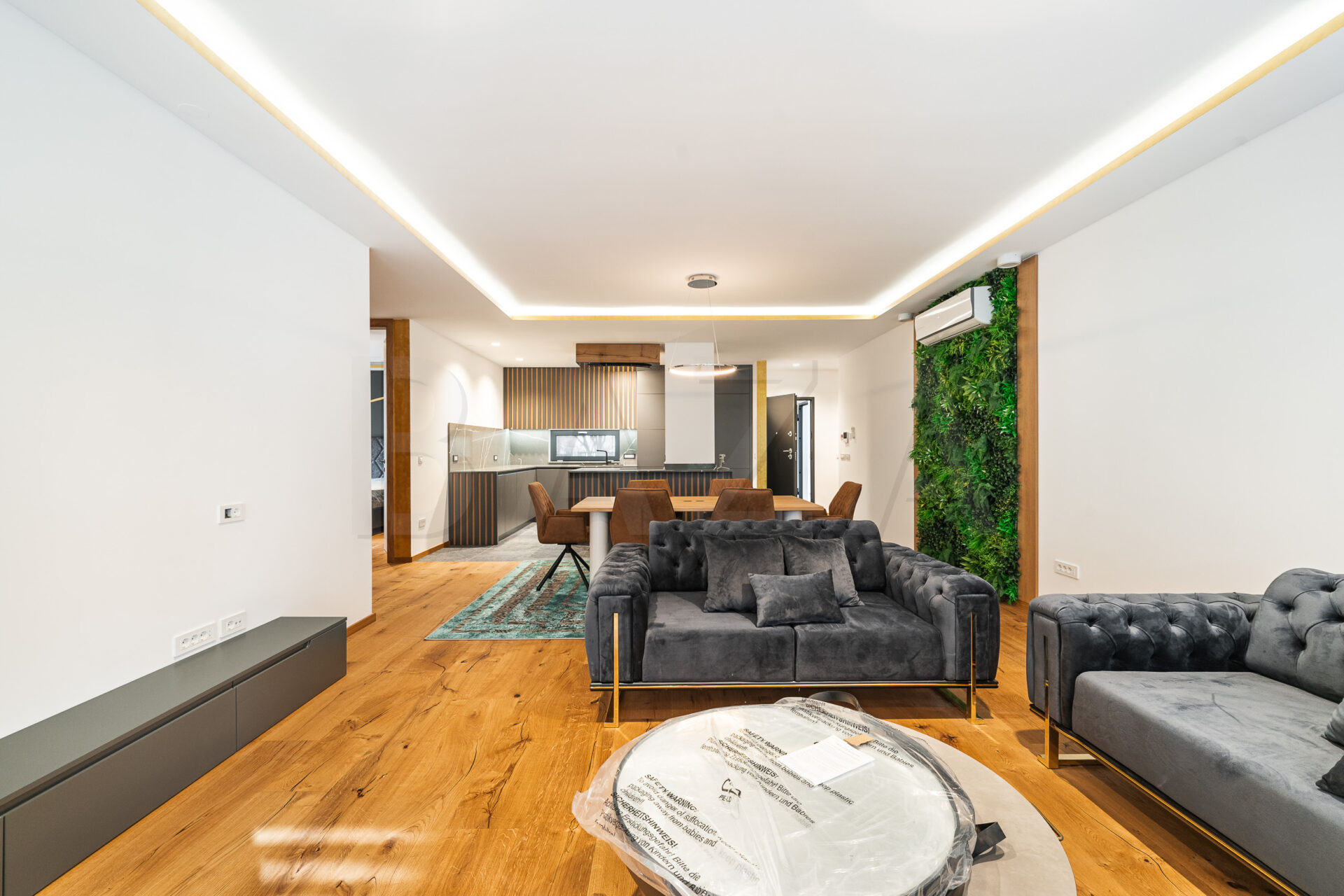 Stanovanje je opremljeno tudi s pametnimi inštalacijami, ki omogočajo upravljanje razsvetljave, temperature, zatemnitve in drugih funkcij preko telefona.