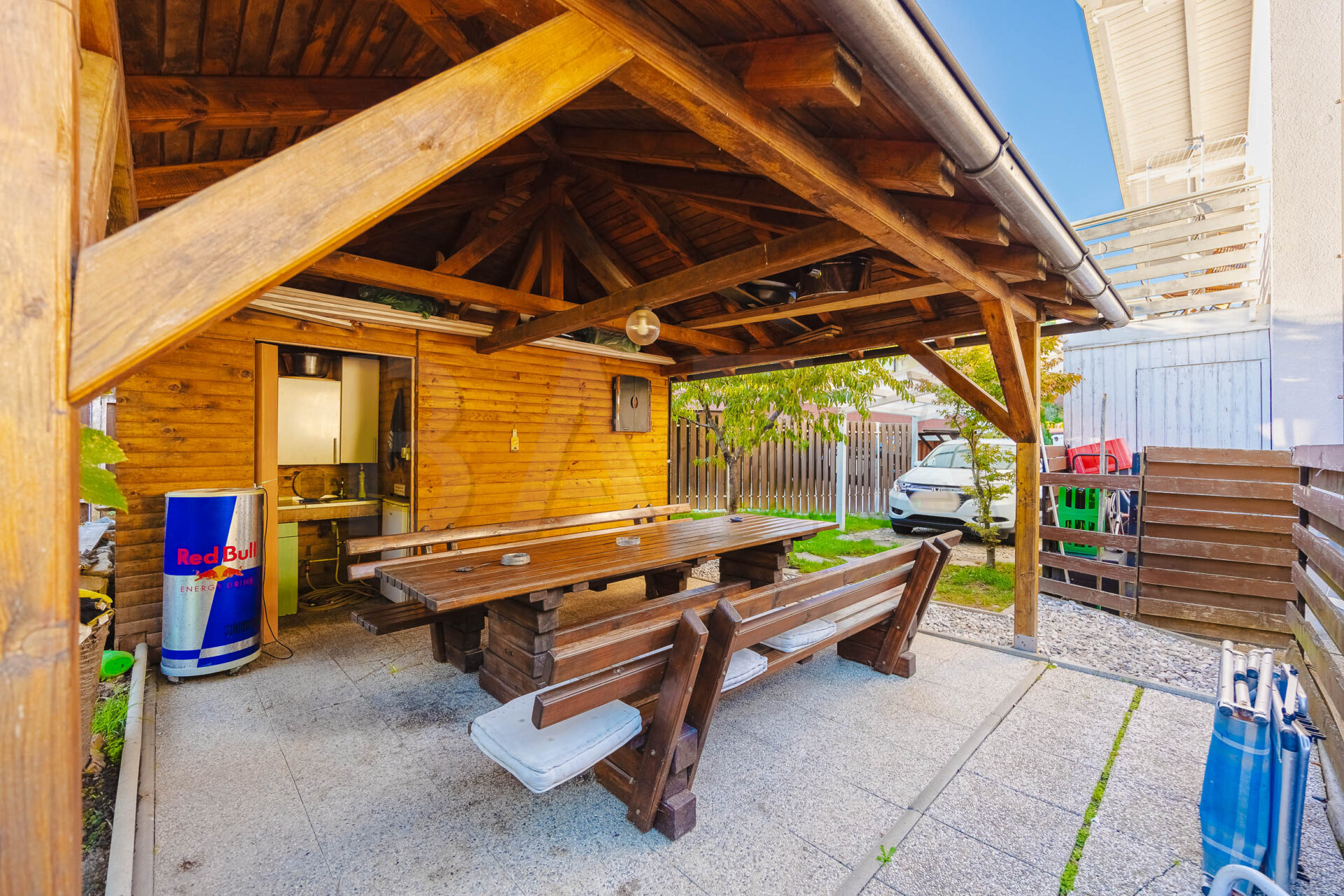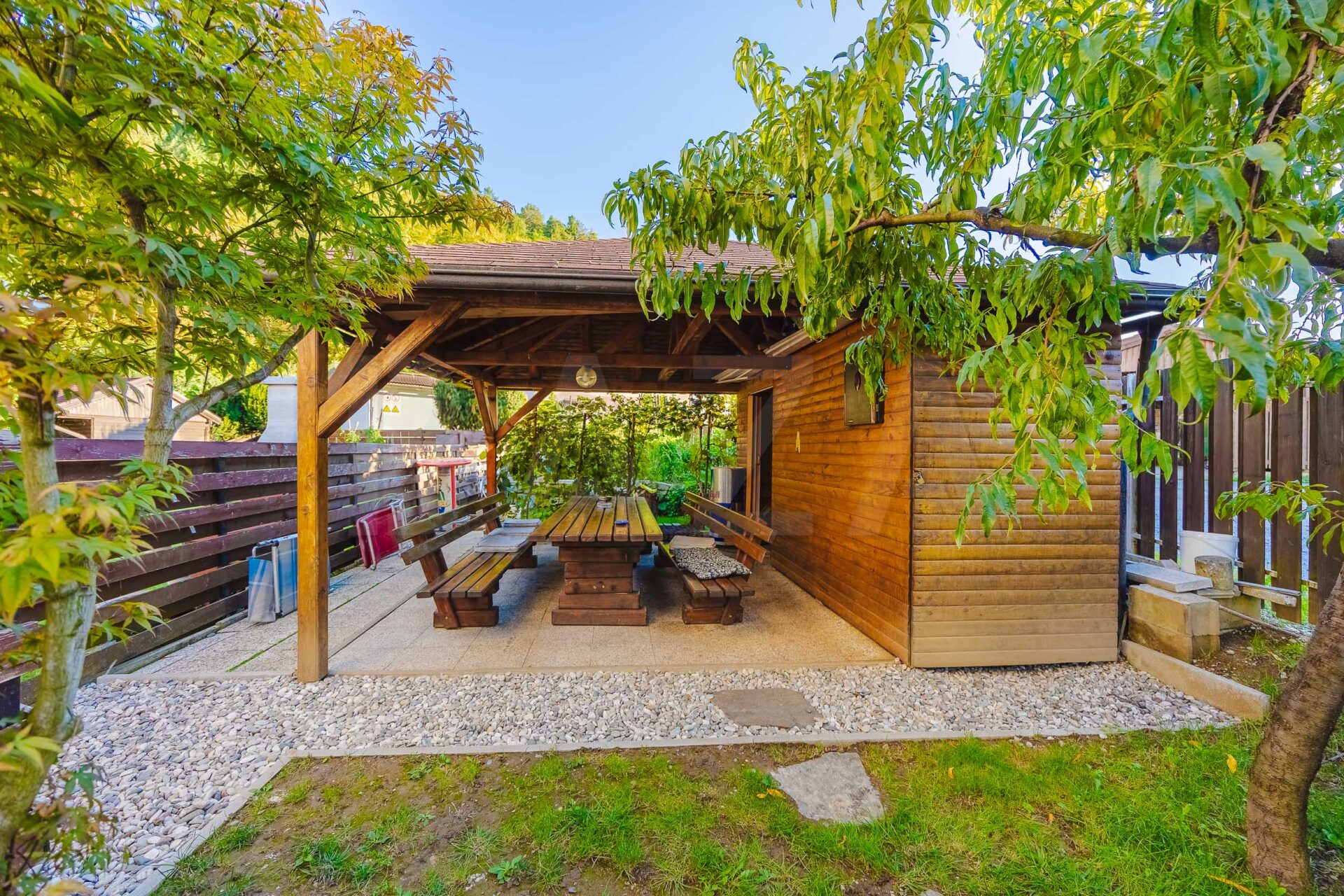 Dovolj velika, ravna in sončna parcela je izjemno lepo urejena in ograjena. Na pripadajočem zemljišču je postavljen nadstrešek za en avtomobil, z avtomatskimi vrati ter lesena nadstrešnica z lopo, ki nudi dovolj prostora za shranjevanje, druženje in prijeten odmik od vsakdana. Na voljo je tudi manjši vrt za gojenje zelenjave.