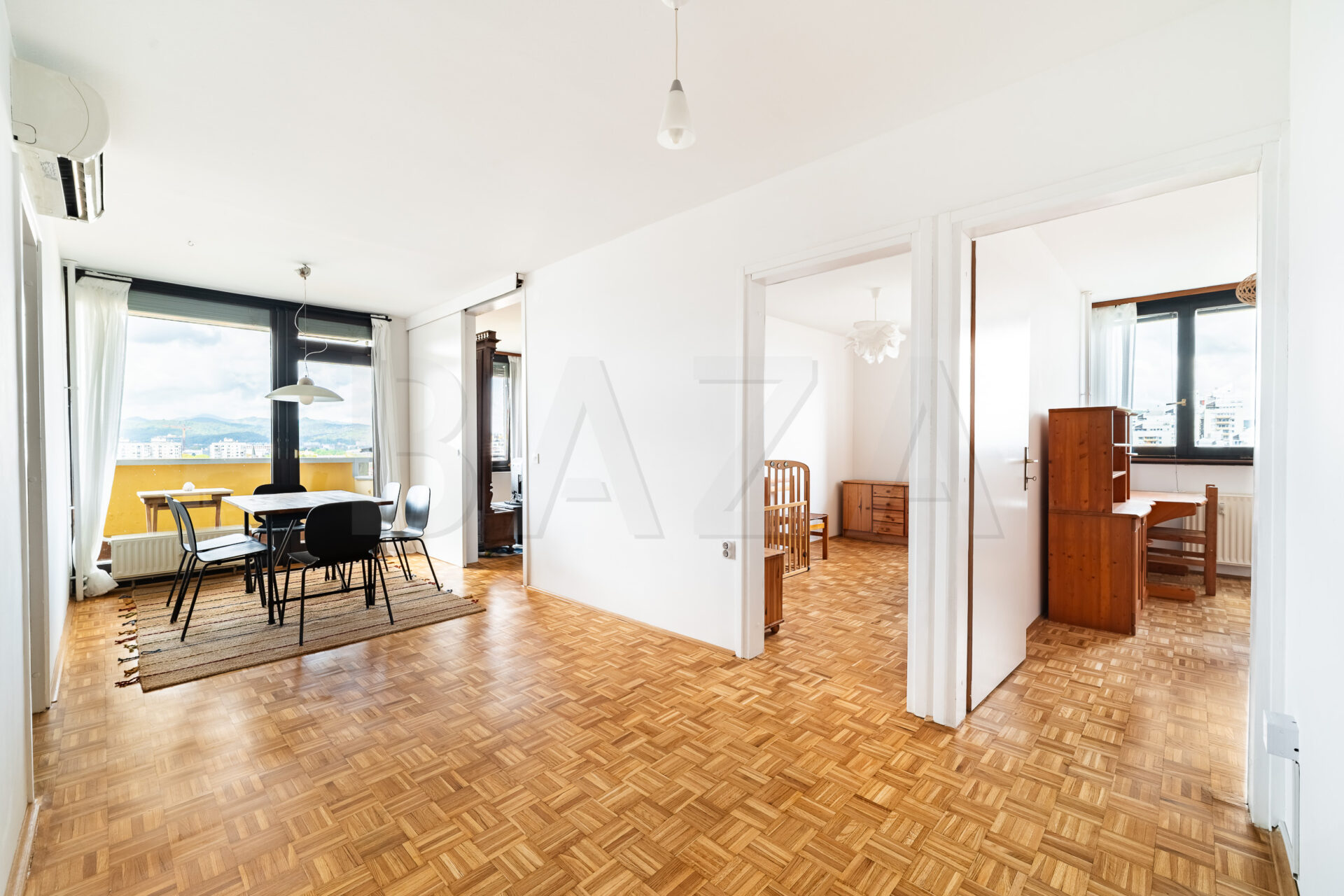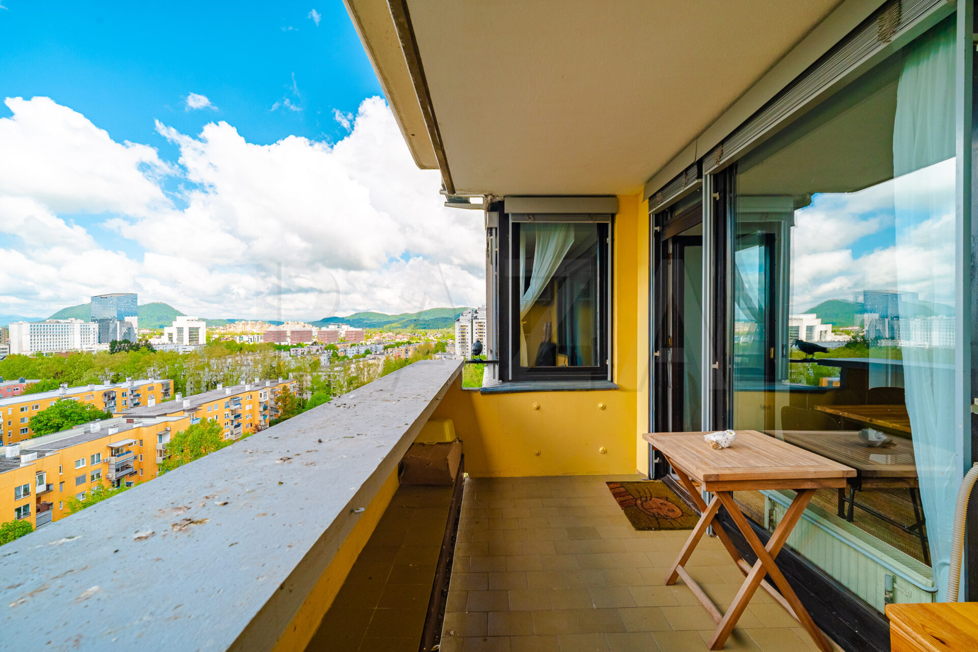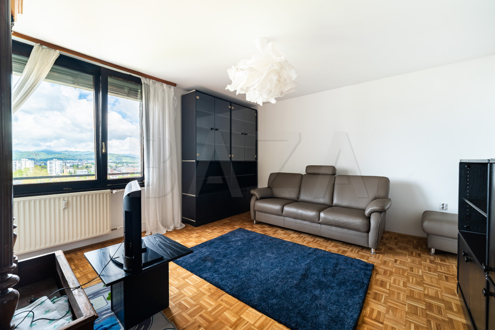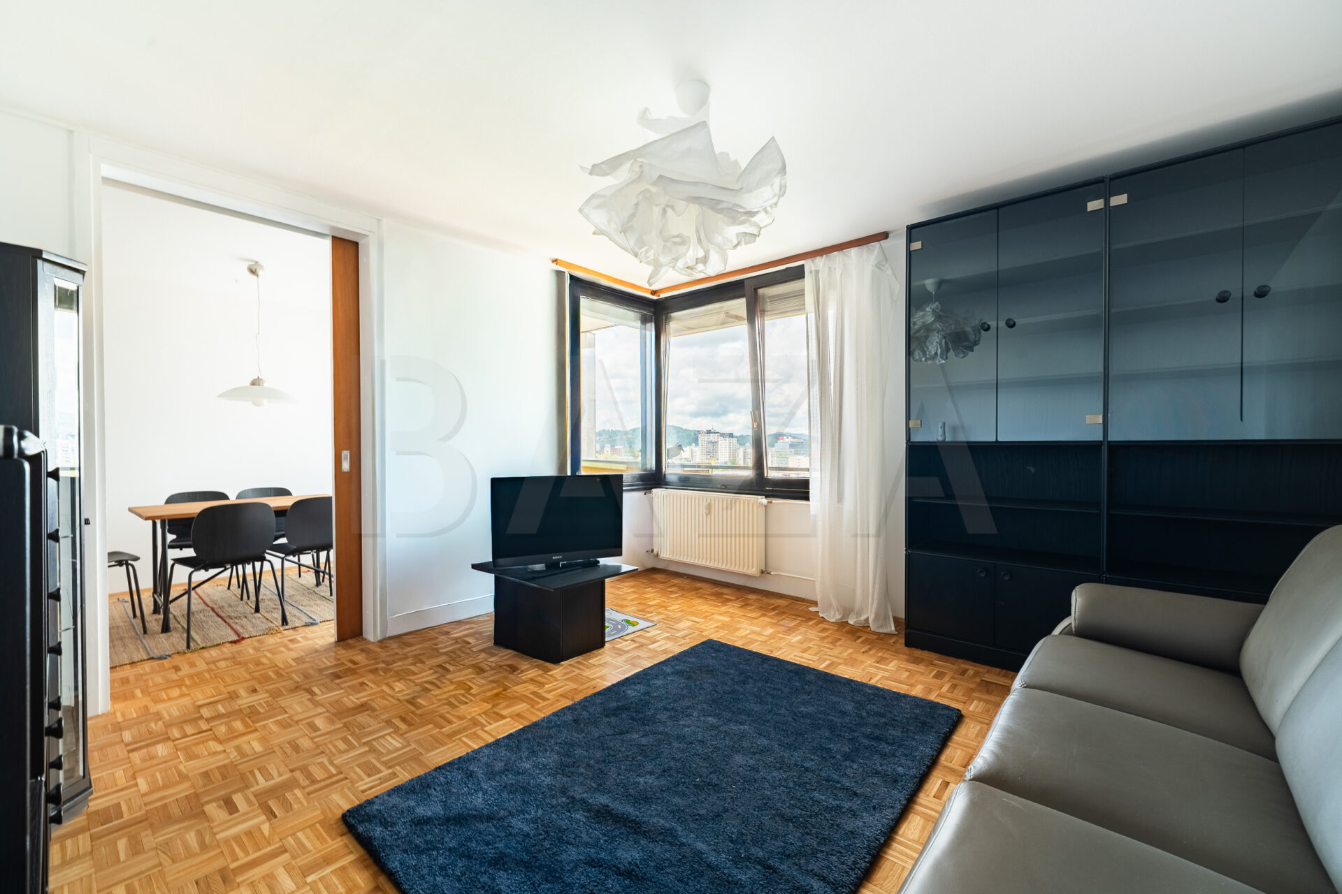 3,5 – sobno stanovanje, Ljubljana – Bežigrad, zgrajeno l. 1981, 12./18. nad., v bloku, neto tlorisna površina obsega 80,50 m2, bivalni prostor 69,90 m2, balkon 4,60 m2, nerazporejen prostor 3,90 m2, možen najem garaže. Cena: 1300,00 EUR/mesec.