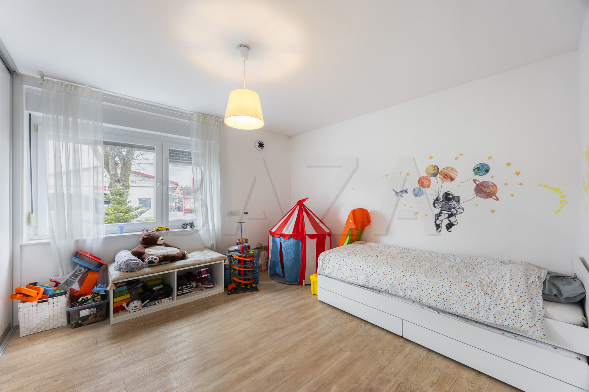 Stanovanje obsega 95,00 m2 neto površine in ima ločen vhod ter del vrta, ki pripada stanovanju. Vstop je skozi novo izdelan prizidek, ki ponuja veliko prostora za shranjevanje. Po stopnicah pridemo v 1. nadstropje, kjer je bila zaradi potreb dela od doma izdelna pisarna/utility, možna pa je tudi predelava v ločeno otroško sobo (glede na načrt arhitektov ob gradnji). V tej sobi se nahaja tudi sušilni stroj. V pisarni je ločen extender za internet, tako da je na voljo hiter internet v čisto vseh sobah. Tloris nadalje vključuje kopalnico z ogromnim walk-in tušem ter pralnim strojem, jedilnico in kuhinjo z dnevno sobo, veliko otroško sobo ter spalnico z walk-in omarami za posteljo. Stanovanju pripada tudi velik balkon.