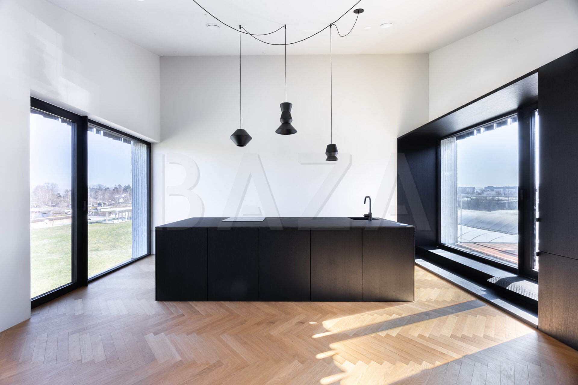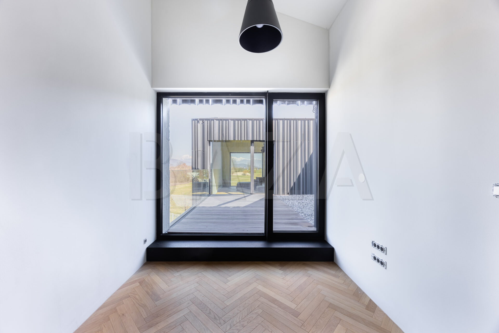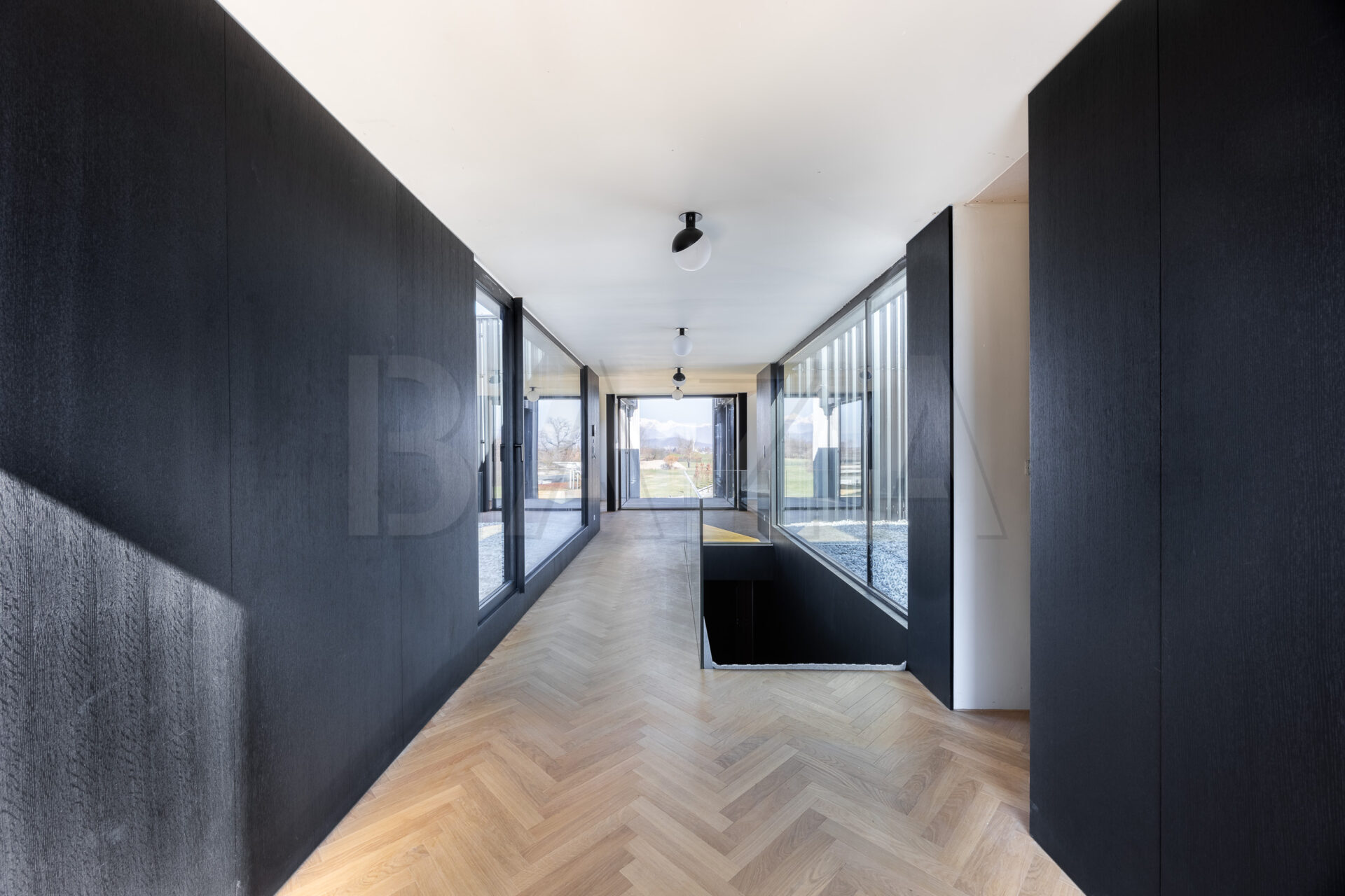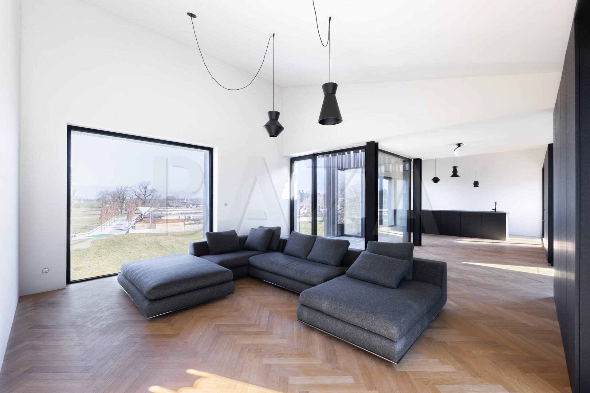 Stanovanje je zasnovano kot dvignjena atrijska hiša z odprtimi pogledi na vse štiri strani neba, kar zagotavlja veliko naravne svetlobe skozi ves dan. Obsega prostoren dnevno-bivalni del s kuhinjo in jedilnico ter izhodi na terase, tri spalnice ter dve kopalnici. Kuhinja je v celoti opremljena, kopalnici sta dokončani in opremljeni.
