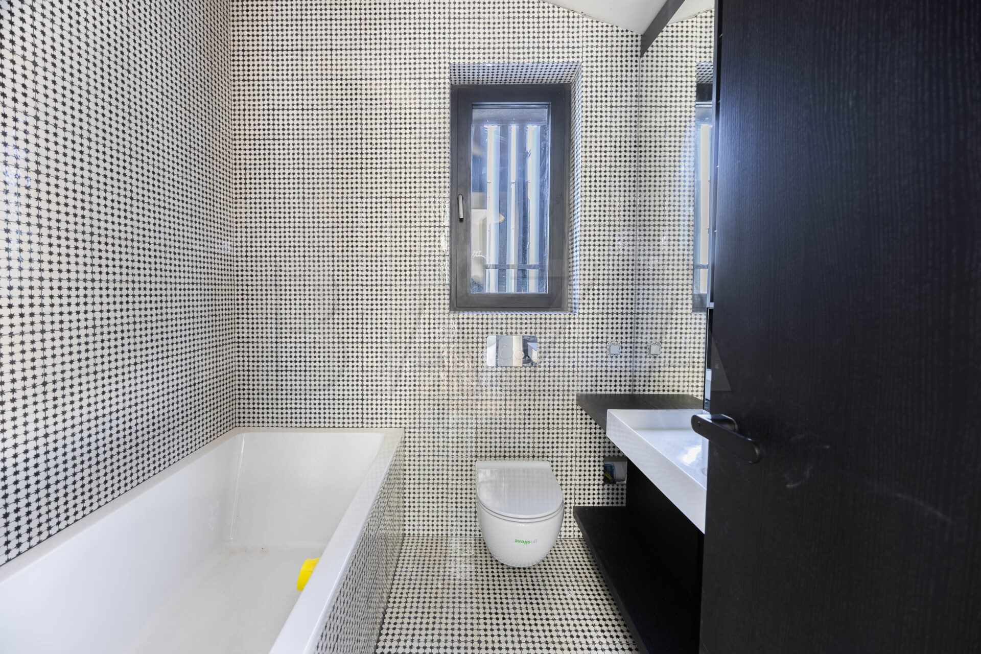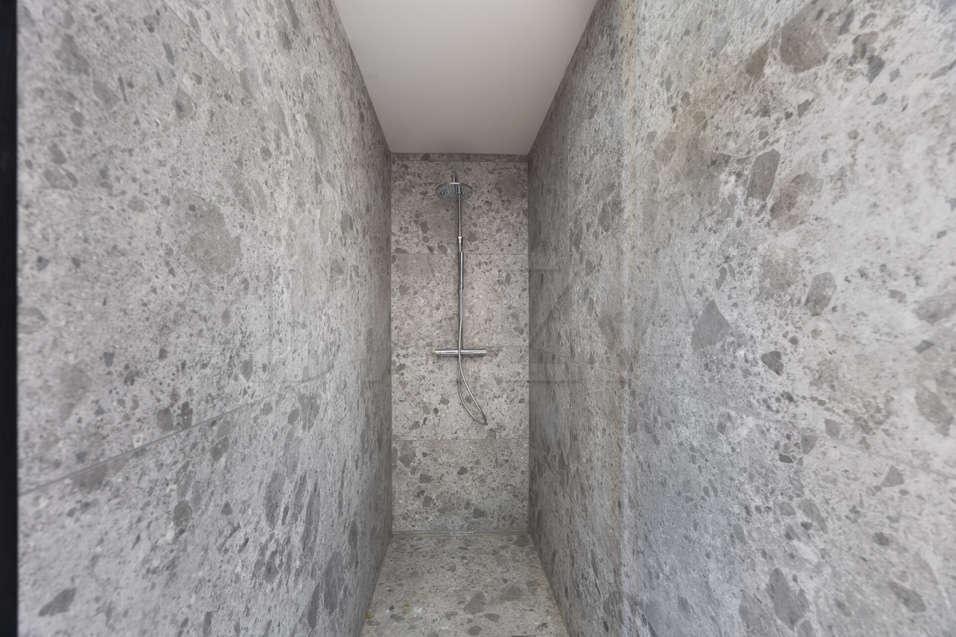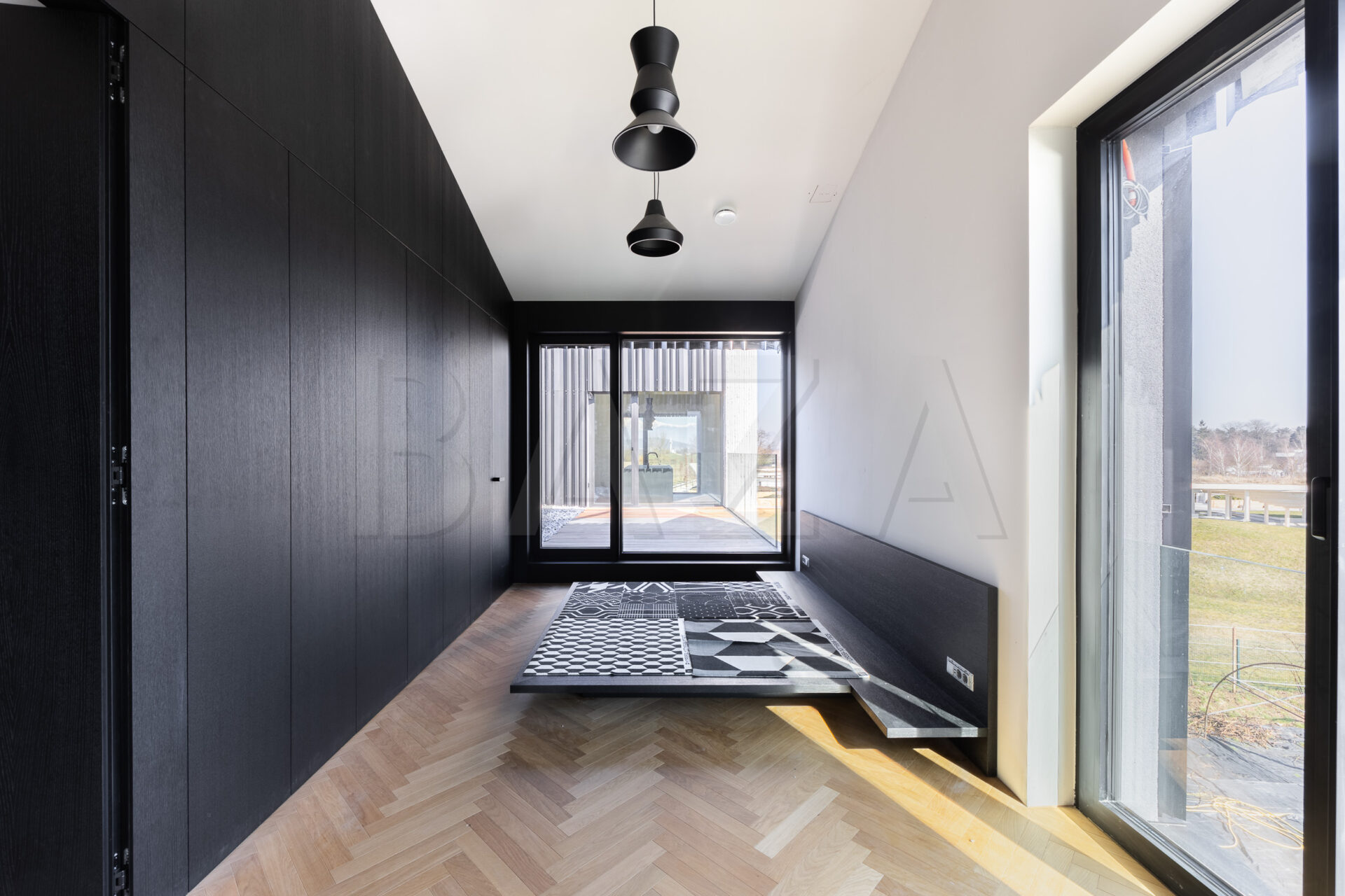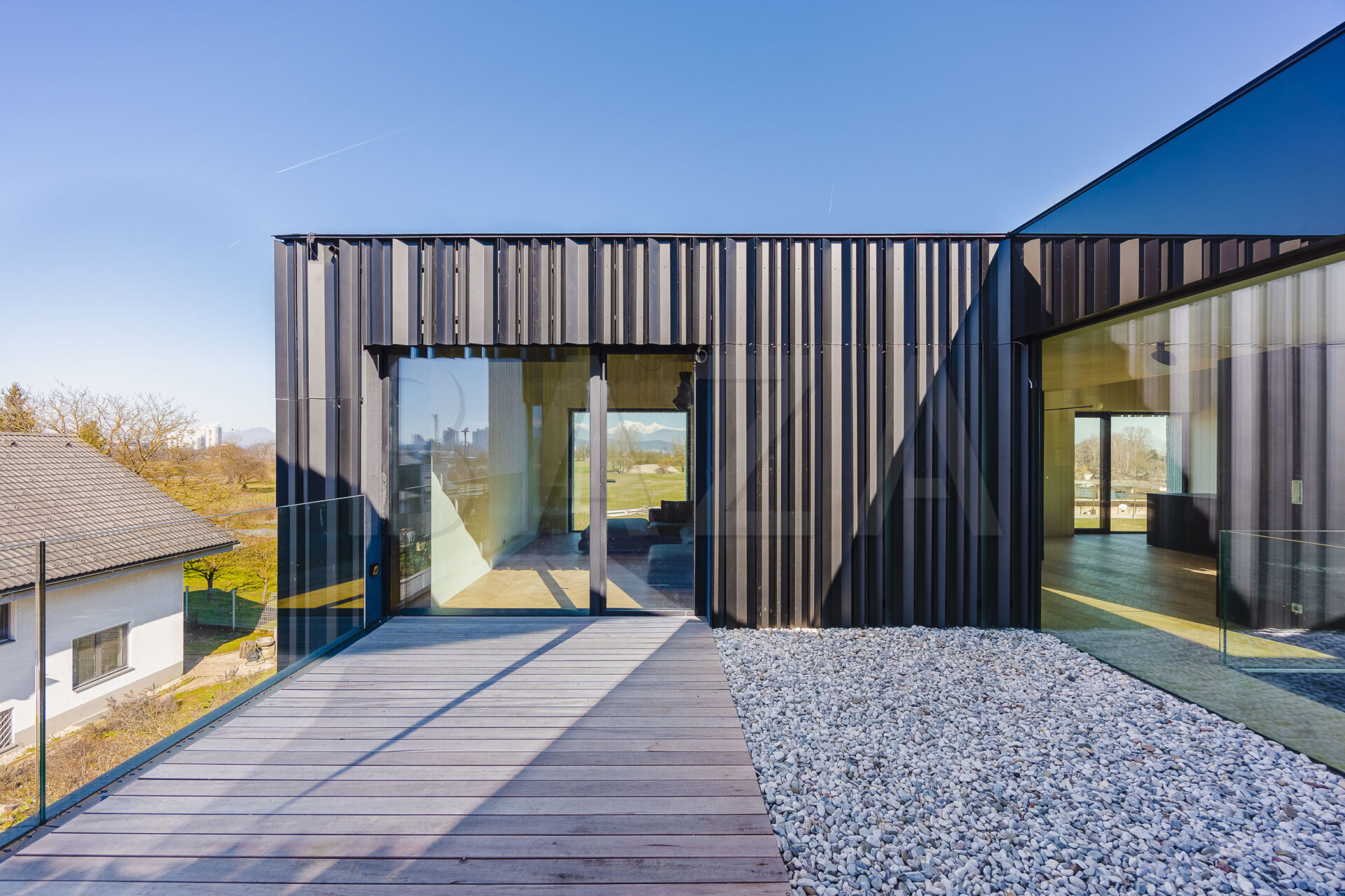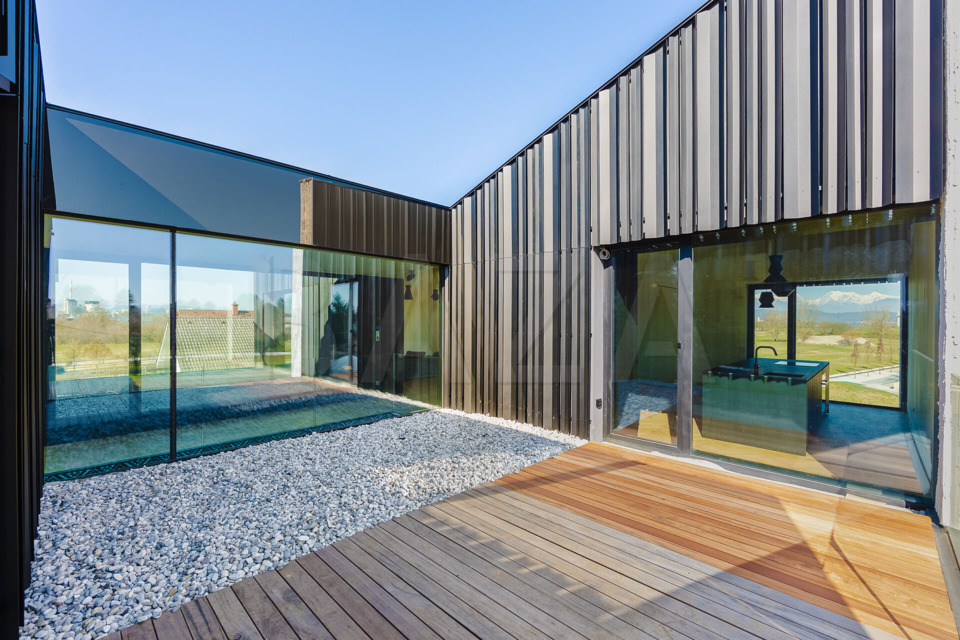 Stanovanje je zasnovano kot dvignjena atrijska hiša z odprtimi pogledi na vse štiri strani neba, kar zagotavlja veliko naravne svetlobe skozi ves dan. Obsega prostoren dnevno-bivalni del s kuhinjo in jedilnico ter izhodi na terase, tri spalnice ter dve kopalnici. Kuhinja je v celoti opremljena, kopalnici sta dokončani in opremljeni.