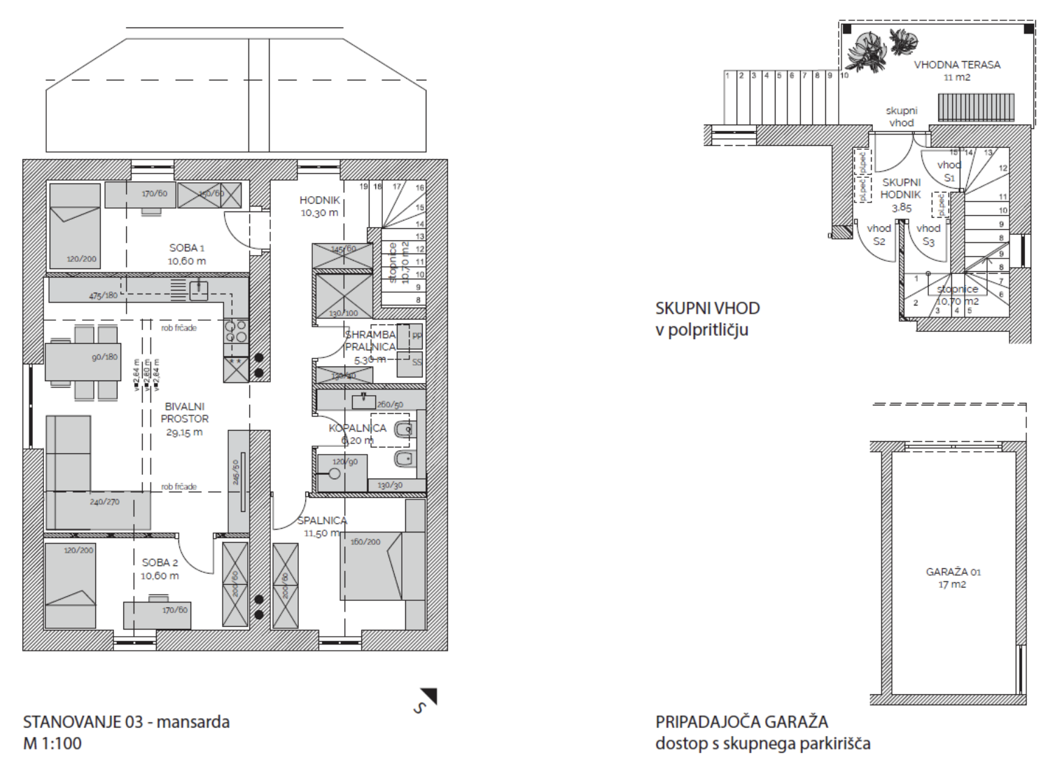 Stanovanje obsega dve sobi, spalnico, kopalnico, hodnik, stopnišče ter pralnico oziroma shrambo. Osrednji bivalni del predstavlja prostorna dnevna soba z jedilnico, ki nudi prijetno in udobno bivanje. Tloris je funkcionalno zasnovan in omogoča optimalen izkoristek prostora. Stanovanju pripada garaža, dodatno pa še eno nepokrito parkirno mesto.