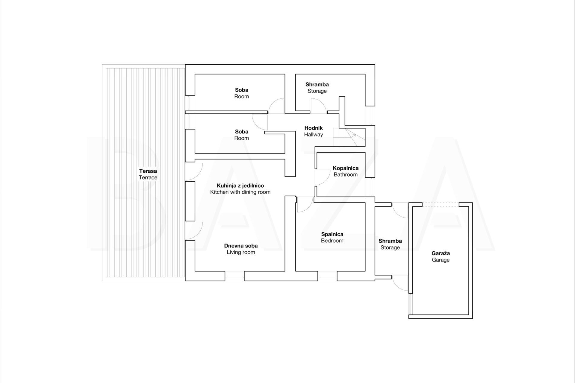 Tloris stanovanja obsega dve sobi, spalnico, kopalnico, hodnik, stopnišče ter pralnico oziroma shrambo, osrednji del pa predstavlja prostorna dnevna soba z jedilnico, ki omogoča prijetno in udobno bivanje. Razporeditev prostorov je funkcionalna in primerna za družinsko življenje ali za vse, ki si želijo več bivalnega prostora ter dobro izkoriščen tloris. Posebnost stanovanja je tudi ločen zunanji del, saj mu pripadata velik vrt in terasa, ki ponujata številne možnosti za ureditev zelenice, prostora za druženje ali sprostitev na prostem.