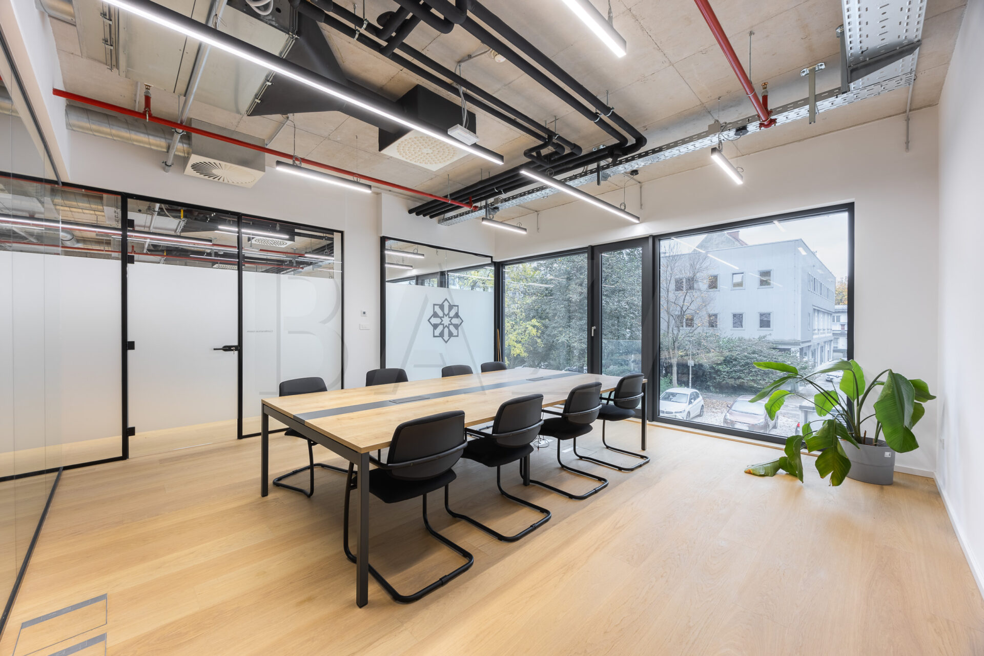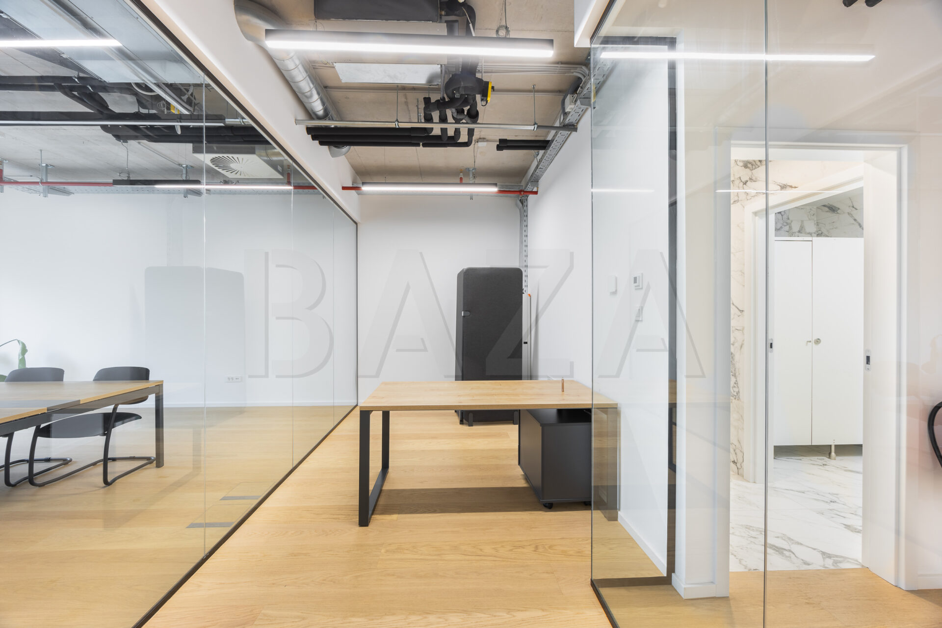 Nahaja se v prvem nadstropju in obsega osrednji open office prostor, sejno sobo, pisarno, čajno kuhinjo in sanitarije. V prostoru je optični internet, talne vtičnice, panoramska okna, senčila na električni pogon ter senzorji temperature in vlage. Možnost najema parkirnih mest v garaži stavbe za 200 EUR + DDV / mesec. Na 30 m2 notranje površine je predvideno eno parkirno mesto.