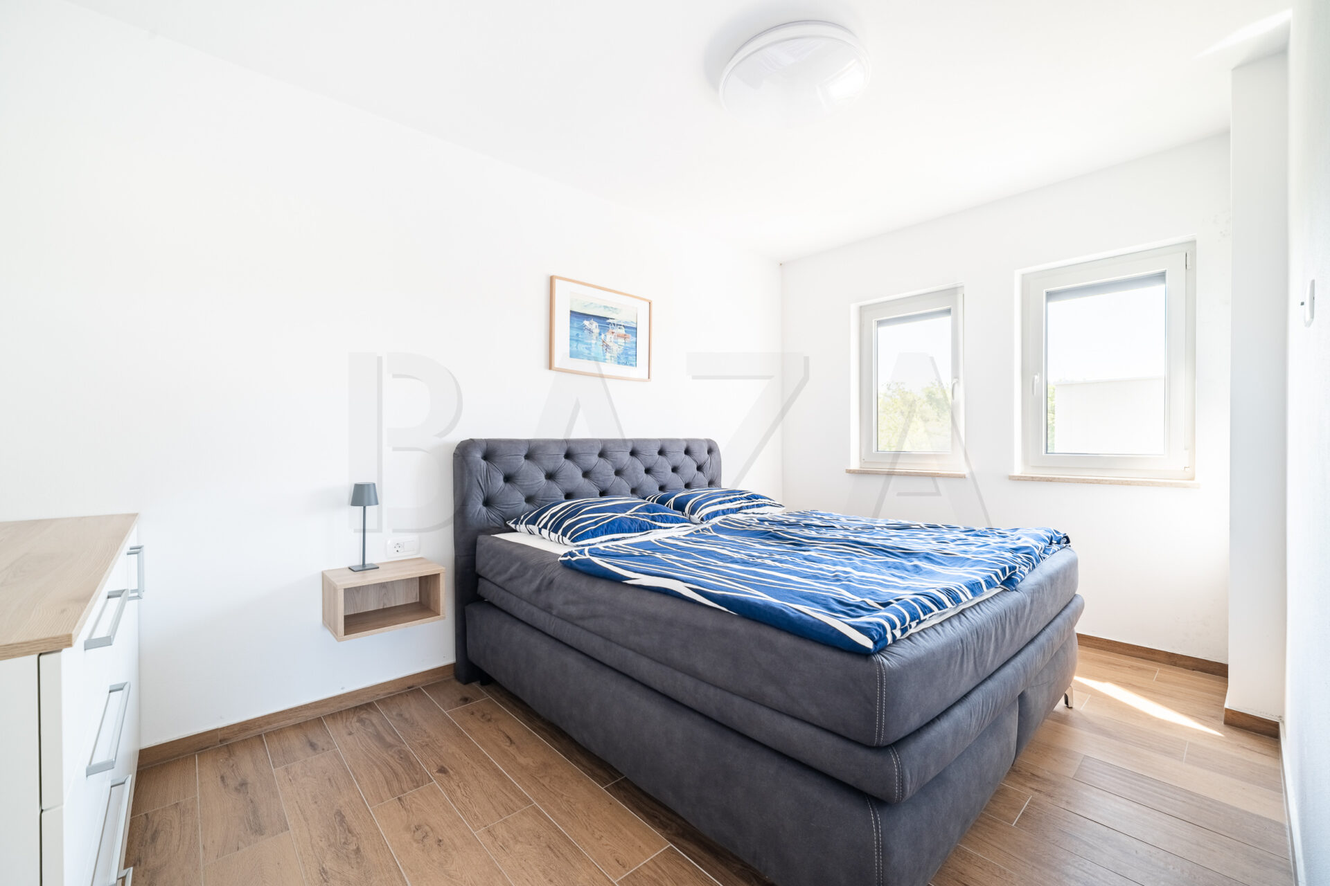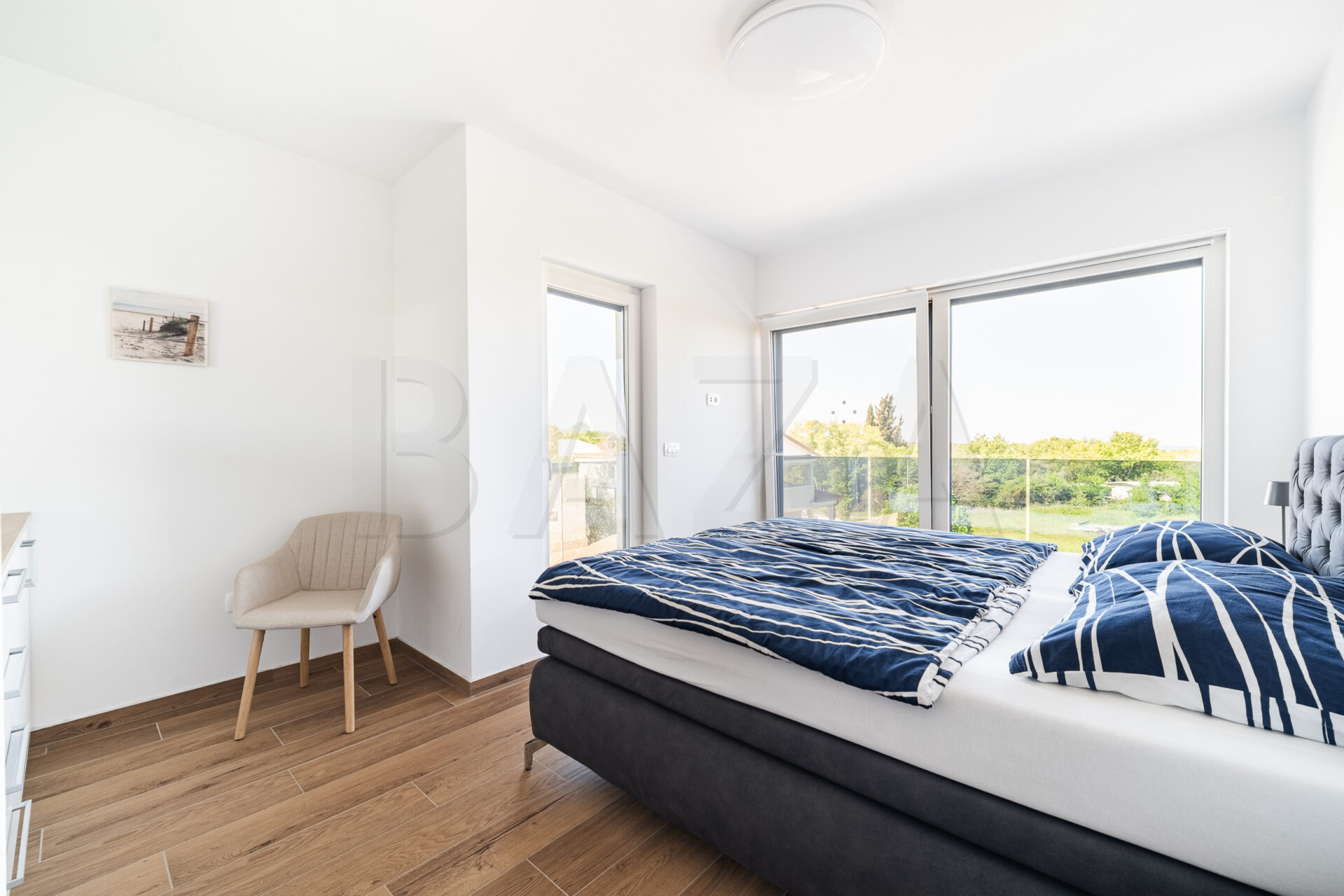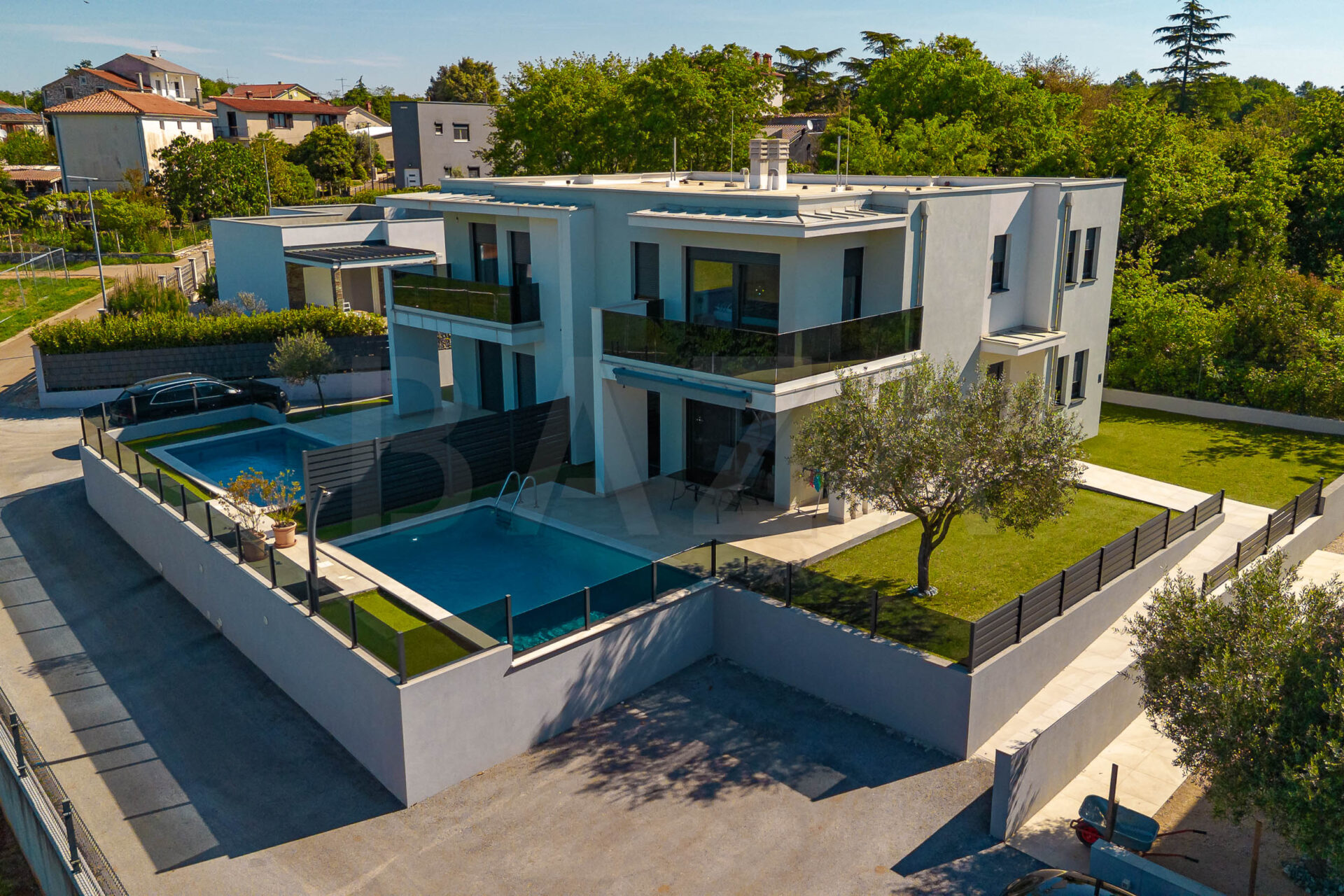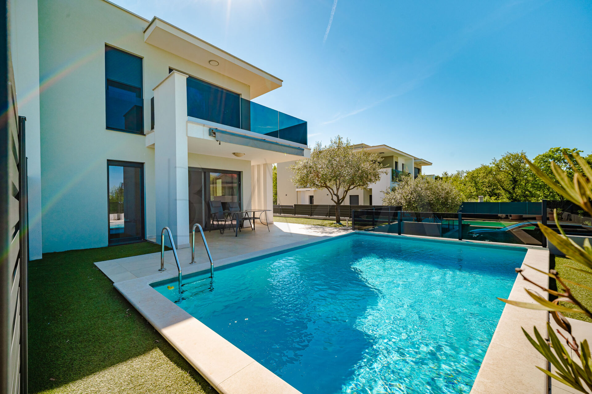Hiša dvojček – novogradnja, Hrvaška – Umag, zgrajeno l. 2024, P+1, neto tlorisna površina 400,00 m2, uporabna površina 130,00 m2, terasa, balkon, bazen, 2x parkirno mesto. Cena: 595.000 EUR.