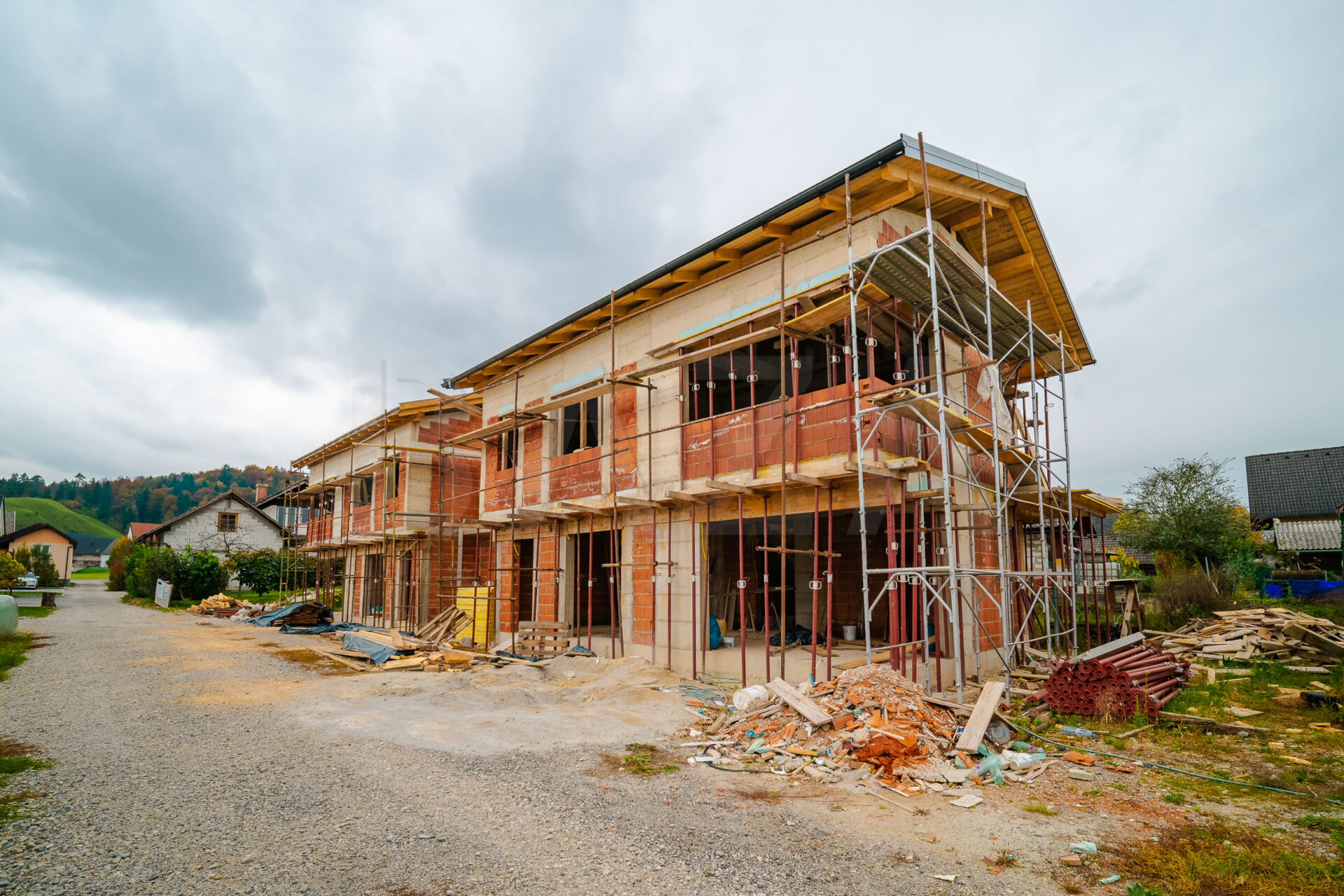 Hiša dvojček, Medvode – Vaše, novogradnja, P + 1, zgrajeno do aprila 2026 (do 3. podaljšane gradbene faze), skupna površina 171,35 m2, bivalna površina 158,90 m2, vmesna zunanja shramba 12,45 m2, zemljišče 377,00 m2, dve parkirni mesti, možnost dokončanja na ključ. Cena: 398.000 EUR.