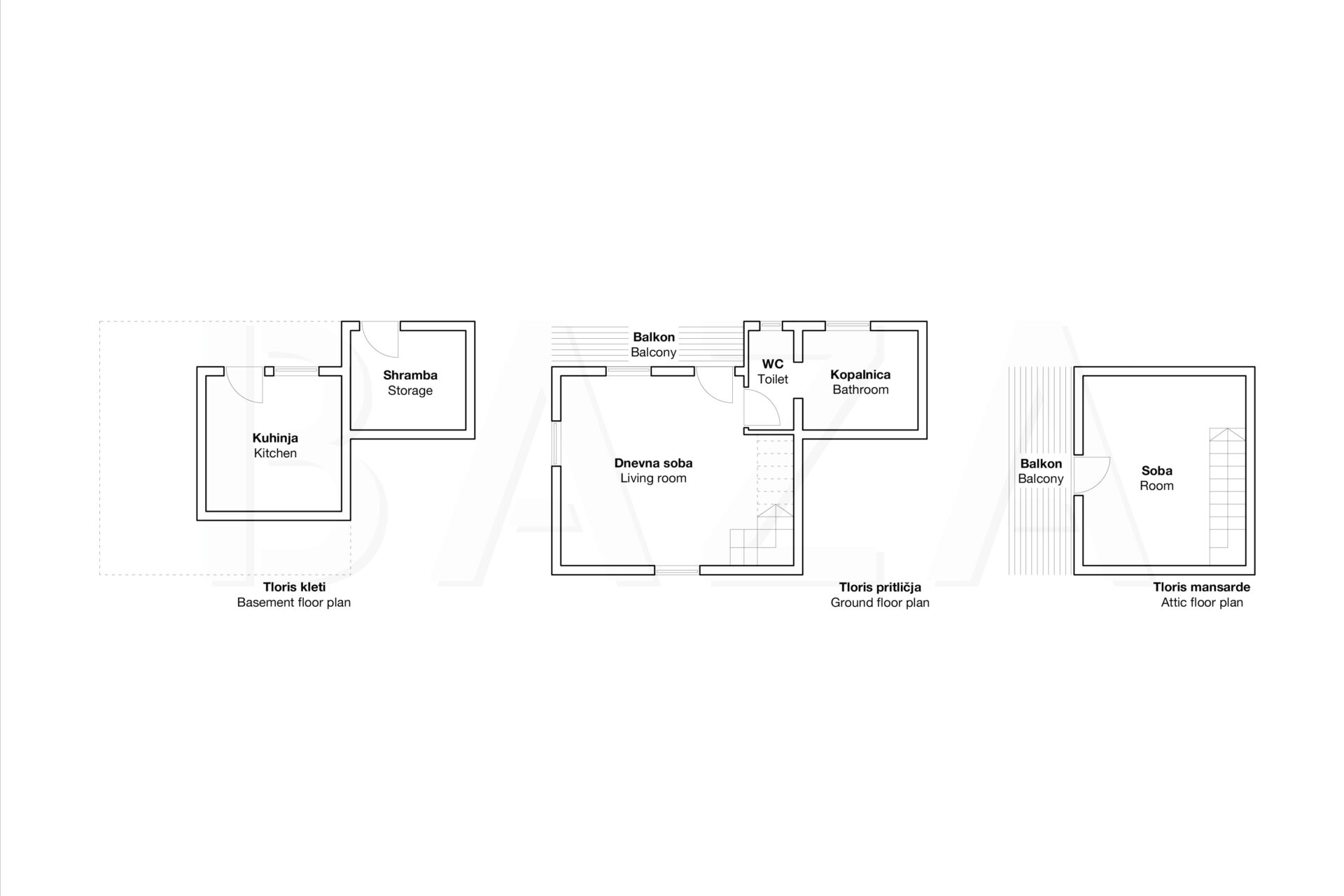 Prostori so funkcionalno zasnovani. Tlorisna zasnova obsega tri etaže – polklet, pritličje in mansardo. V spodnjem delu se nahajata kuhinja ter praktičen shranjevalni prostor, na tem delu je možno urediti tudi teraso. Pritličje obsega dnevno sobo in kopalnico, mansarda z balkonom pa je namenjena spalnemu prostoru.