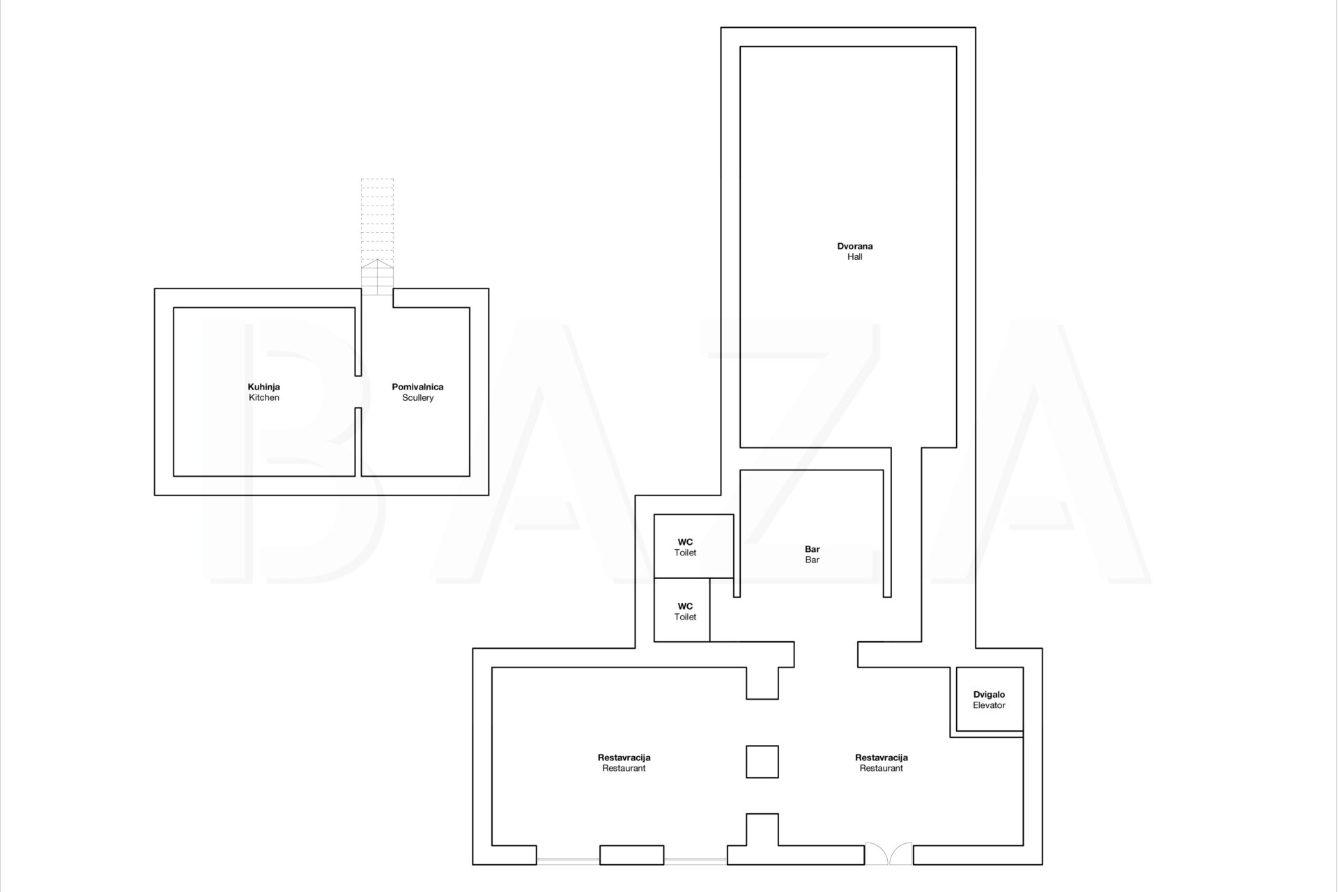 Lokal se nahaja v pritličju in obsega dva sprednja prostora z mizami, dvorano z mizami, šank, bar, sanitarije, pisarno, kletne prostore s kuhinjo (plin, žar, 2x ledomat), pomivalnico, dvigalom za hrano, zamrzovalnico in hladilnico, garderobo za osebje in tovornim dvigalom. Zunaj je omogočena uporaba velike terase s senčniki. Lastnik terase je občina. Notranji prostor ima možnost povezave z zunanjo teraso s sistemom drsnih oken. Oglasu so priloženi tlorisi površin s sedišči.