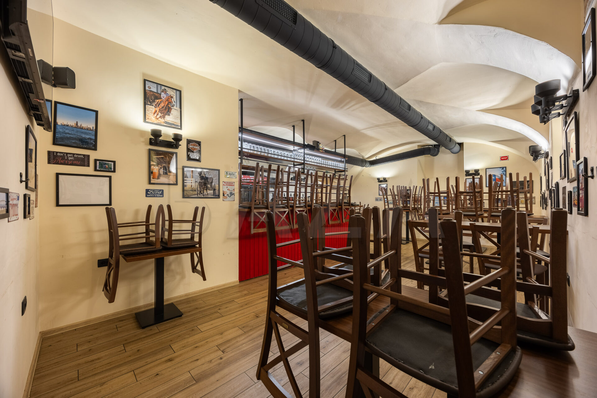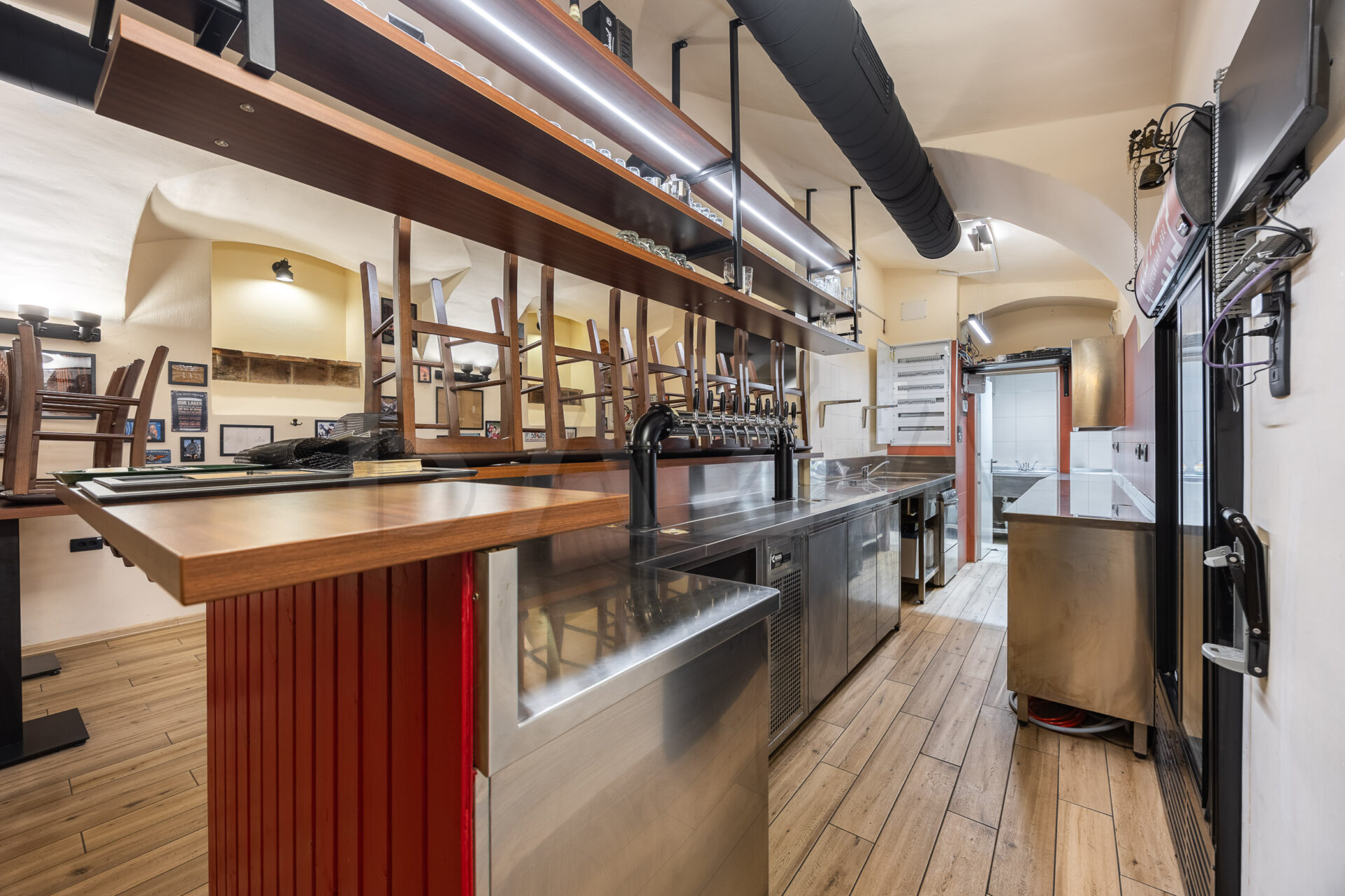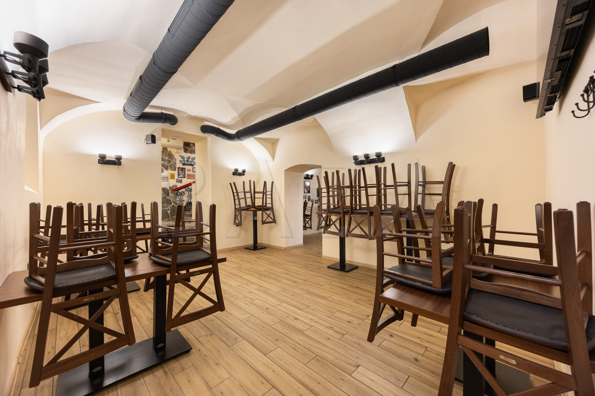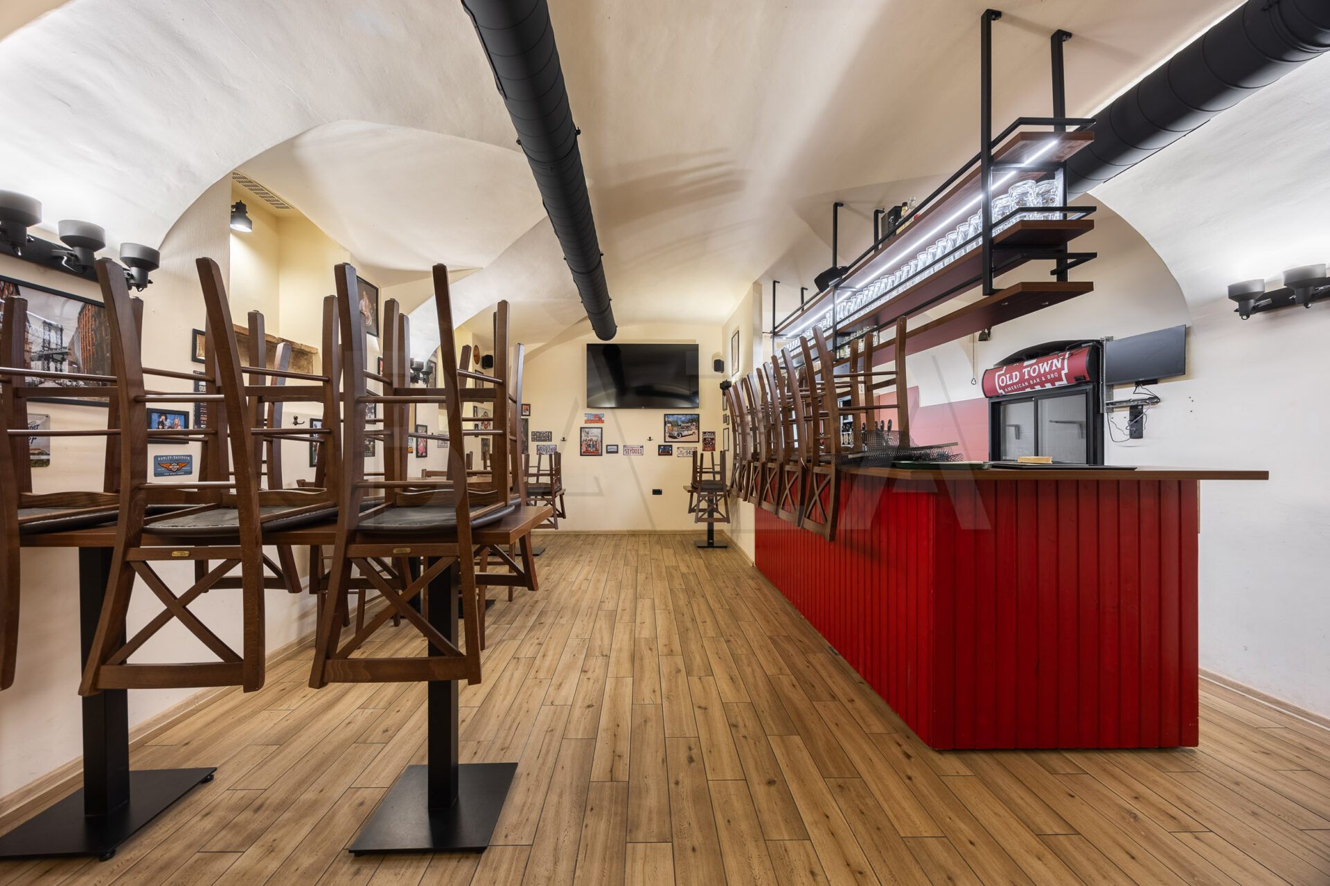 Lokal se nahaja v kleti in obsega dva prostora z mizami, šank, kuhinjo, shrambo za čistila, skladišče, sanitarije, wc za osebje. Prostor je bil celovito prenovljen leta 2023, in sicer so bile menjane vse inštalacije (elektrika, voda, odtoki), ometi, talne obloge, pohištvo, šank, nove sanitarije in moderen prezračevalni sistem. Sistem rekuperacije omogoča hlajenje oziroma gretje, ki je vezano na toplotno črpalko. Vgrajen je sistem ozvočenja, optika in sistem videonadzora. Stroški se obračunajo po porabi, stavba ima upravnika. V kuhinji se nahaja žar, friteze, sistem za točeno pivo, štedilnik na elektriko, izhod na atrij in možnost dostave na atrij. Na atriju je omogočena uporaba enega parkirnega mesta za osebje.