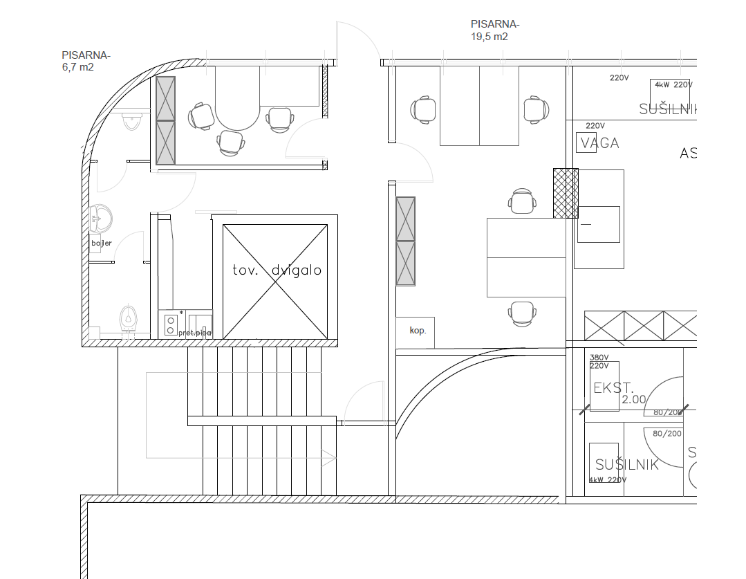 V poslovno industrijski coni BTC, oddamo poslovni prostor, ki obsega pisarniške prostore in skladišče, v skupni izmeri 249,50 m2. Nahajajo se v dveh etažah in sicer: v pritličju sta dve ločeni pisarni, čajna kuhinja in sanitarije (45,50 m2), v kleti sta prav tako dve pisarni z okni in skladiščni prostor (204,00 m2). V prostorih se nahaja tudi tovorno dvigalo, katerega nosilnost je 1500 kg (16 oseb).