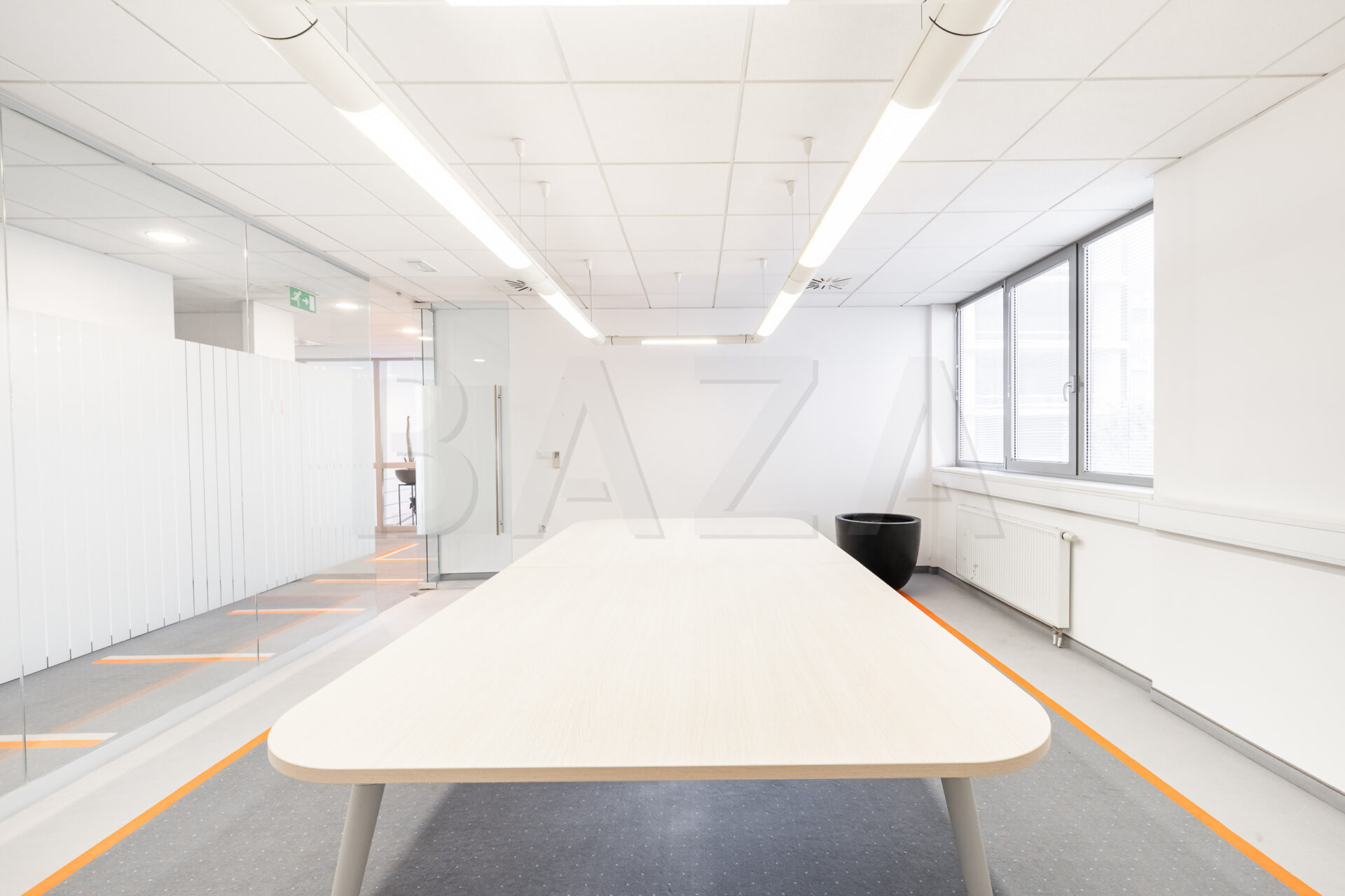 Prvi del prostorov obsega: sprejemno pisarno, 18 samostojnih pisarn, sejno sobo, kopirnico, dve čajni kuhinji, ločene ženske in moške sanitarije in server sobo. Vse pisarne imajo dnevno svetlobo, saj se nahajajo na obodu nadstropja, medtem ko jih povezuje skupen notranji hodnik s preostalimi prostori in sejno sobo. Lega pisarn je sever-jug.