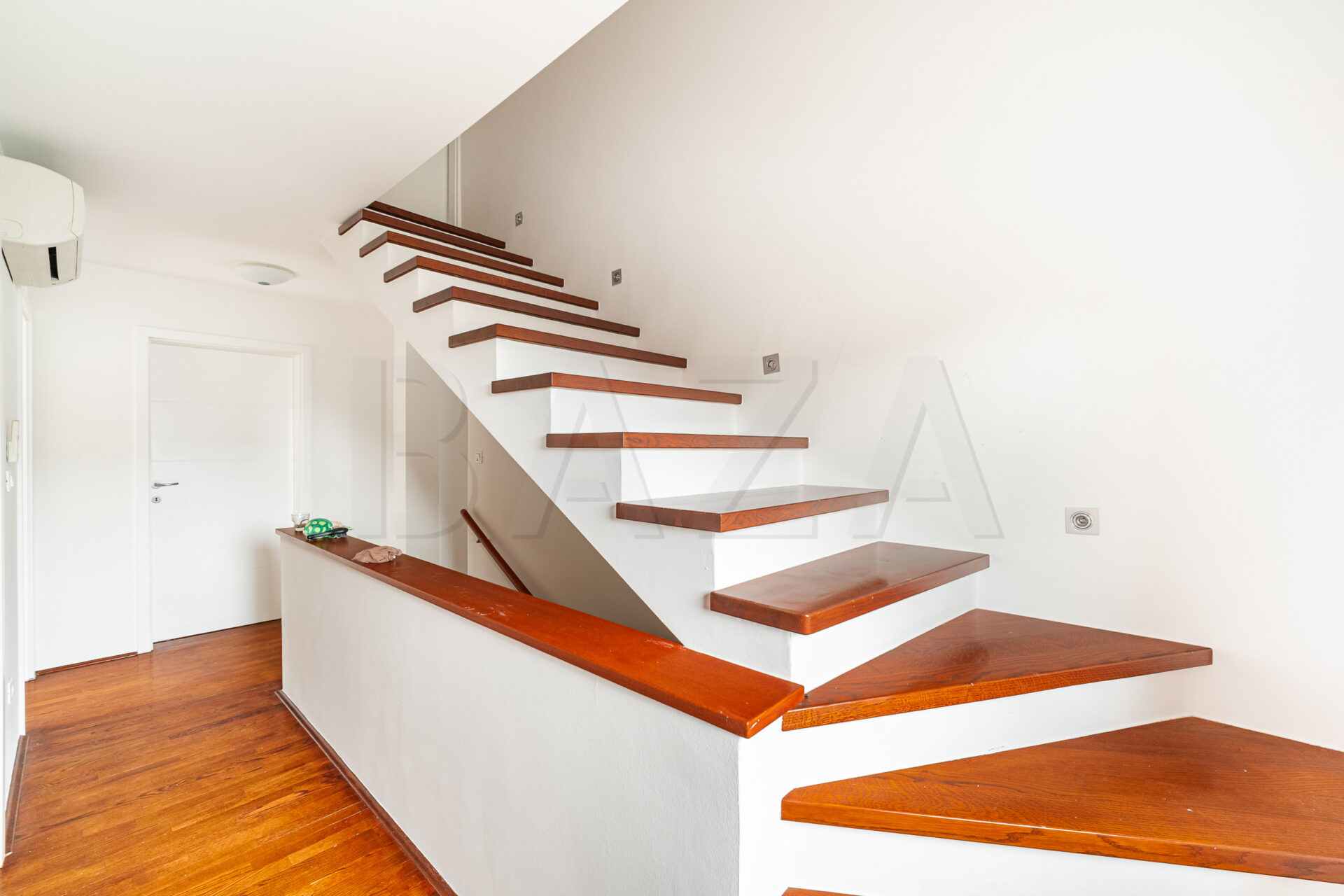 Hiša je bila zgrajena leta 2011 in se razprostira skozi tri etaže (P+1+M). V pritličju hiše se nahaja predprostor, shramba, kopalnica (s prho in sanitarijami), kuhinja z vsemi gospodinjskimi aparati (hladilnik z zamrzovalnikom, pečica, mikrovalovna pečica, pomivalni stroj, napa, indukcijska kuhalna plošča) ter dnevna soba z jedilnico in kaminom. Iz dnevnega prostora je izhod na vrt z letno kuhinjo, ki omogoča prijetno druženje na prostem. V prvem nadstropju je utility s pralnim strojem, kopalnica (s prho in sanitarijami), glavna spalnica z vgradnimi omarami ter dve otroški sobi, vsaka z izhodom na balkon. Mansarda je urejena kot fitnes ali dodatna spalnica, shramba in soba za druženje.