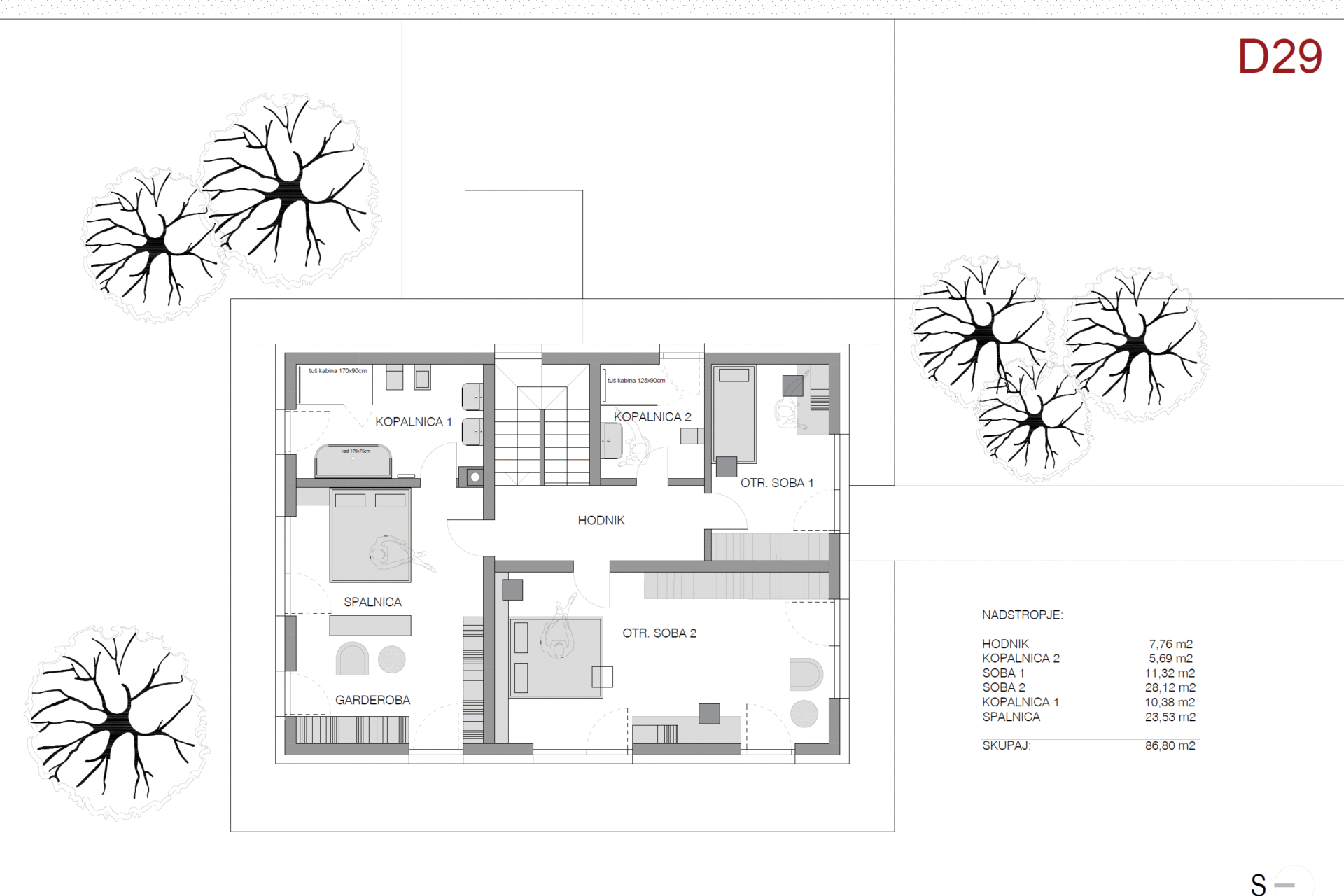 V nadstropju so tri otroške sobe ter prostorna glavna spalnica (master bedroom), iz katere je neposreden dostop do lastne kopalnice s kadjo, tušem in wc-jem. V nadstropju je dodatna ločena kopalnica s tušem in wc-jem. V vseh spalnicah so francoski balkoni, ki prostor dodatno odprejo in zagotovijo naravno svetlobo.