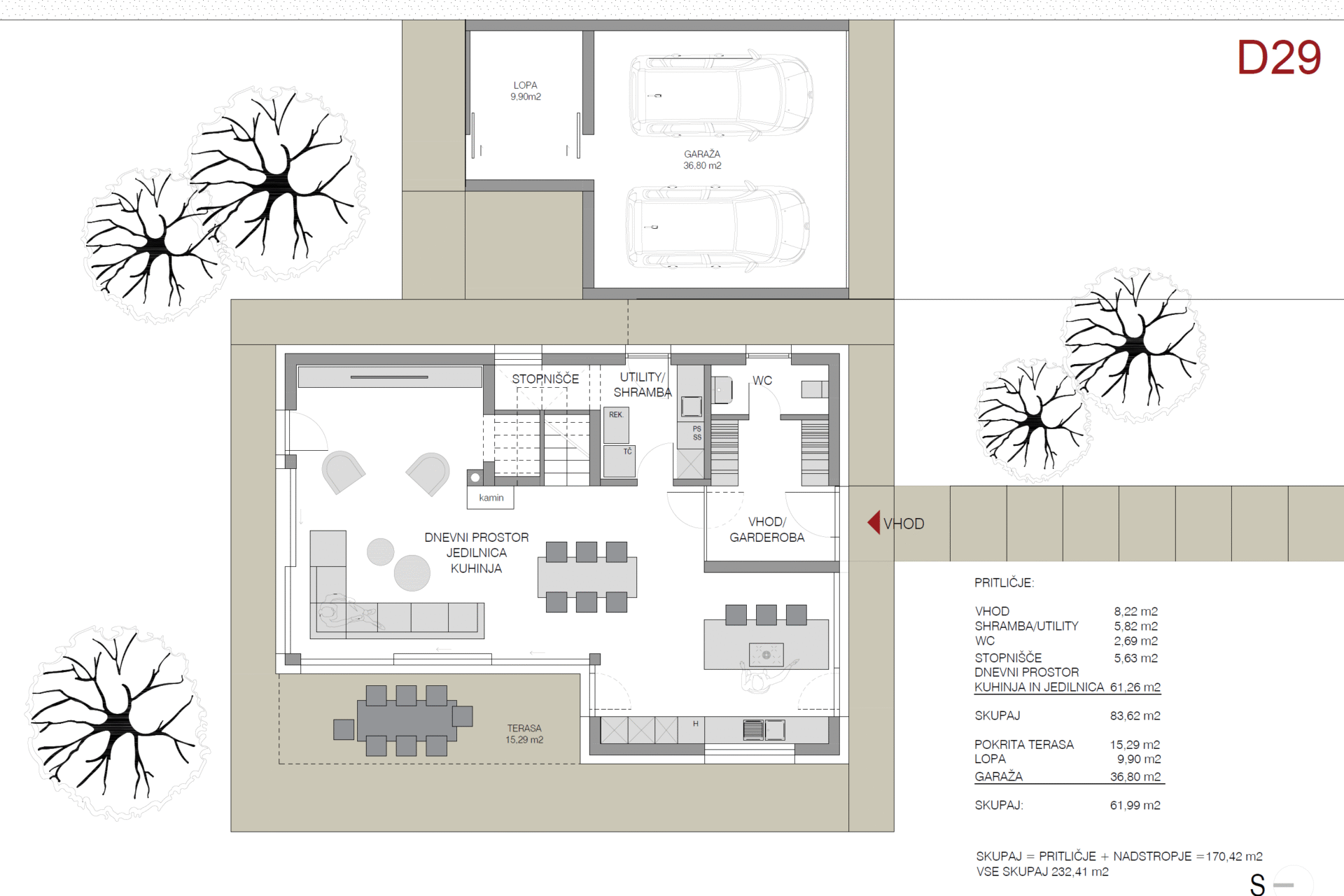 Posebna pozornost je namenjena udobju – na terasi so že pripravljeni priključki za vodo in elektriko, kar omogoča postavitev letne kuhinje. Hiša je opremljena s klimatsko napravo, okoliška terasa pa bo izvedena iz teraco betona.
