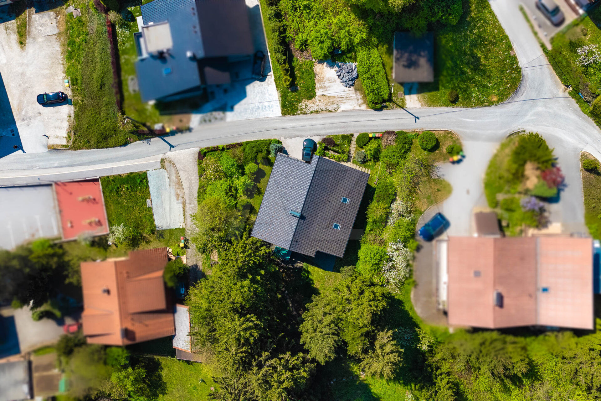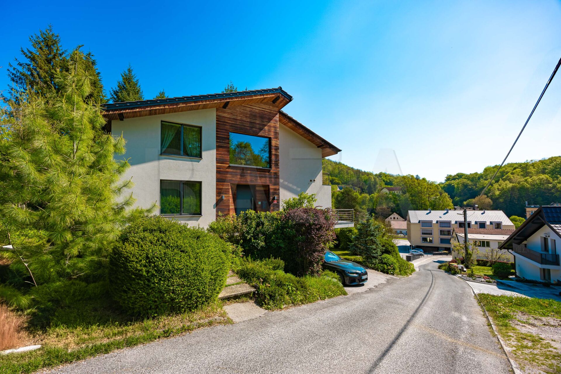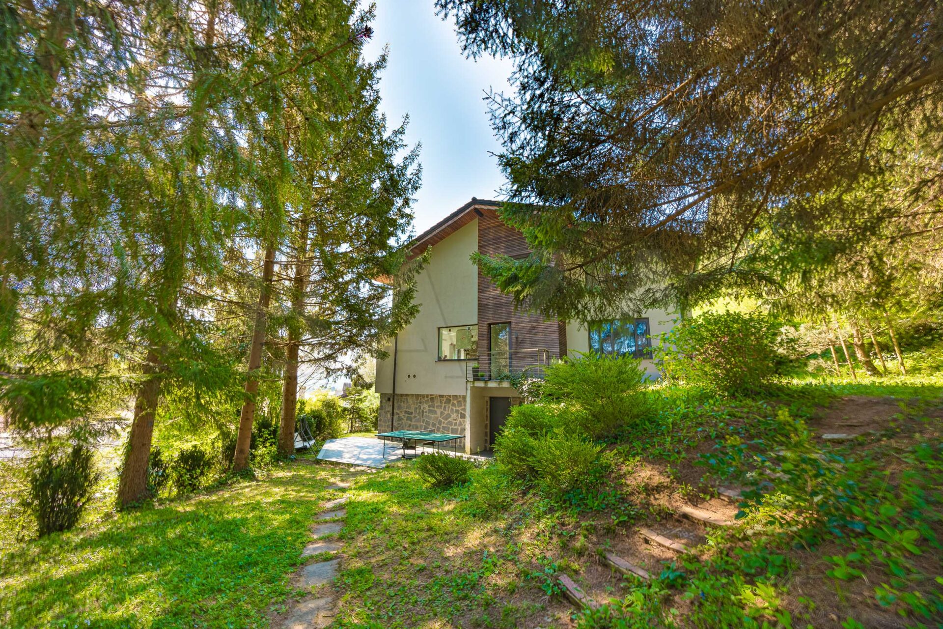 Nepremičnina stoji na urejenem in razgibanem zemljišču velikosti 1.250 m2, ki nudi veliko zasebnosti ter občutek bivanja v naravi. Okolica je bogato zasajena z iglavci in ustvarja prijetno, umirjeno atmosfero in naravno senco skozi vse leto.