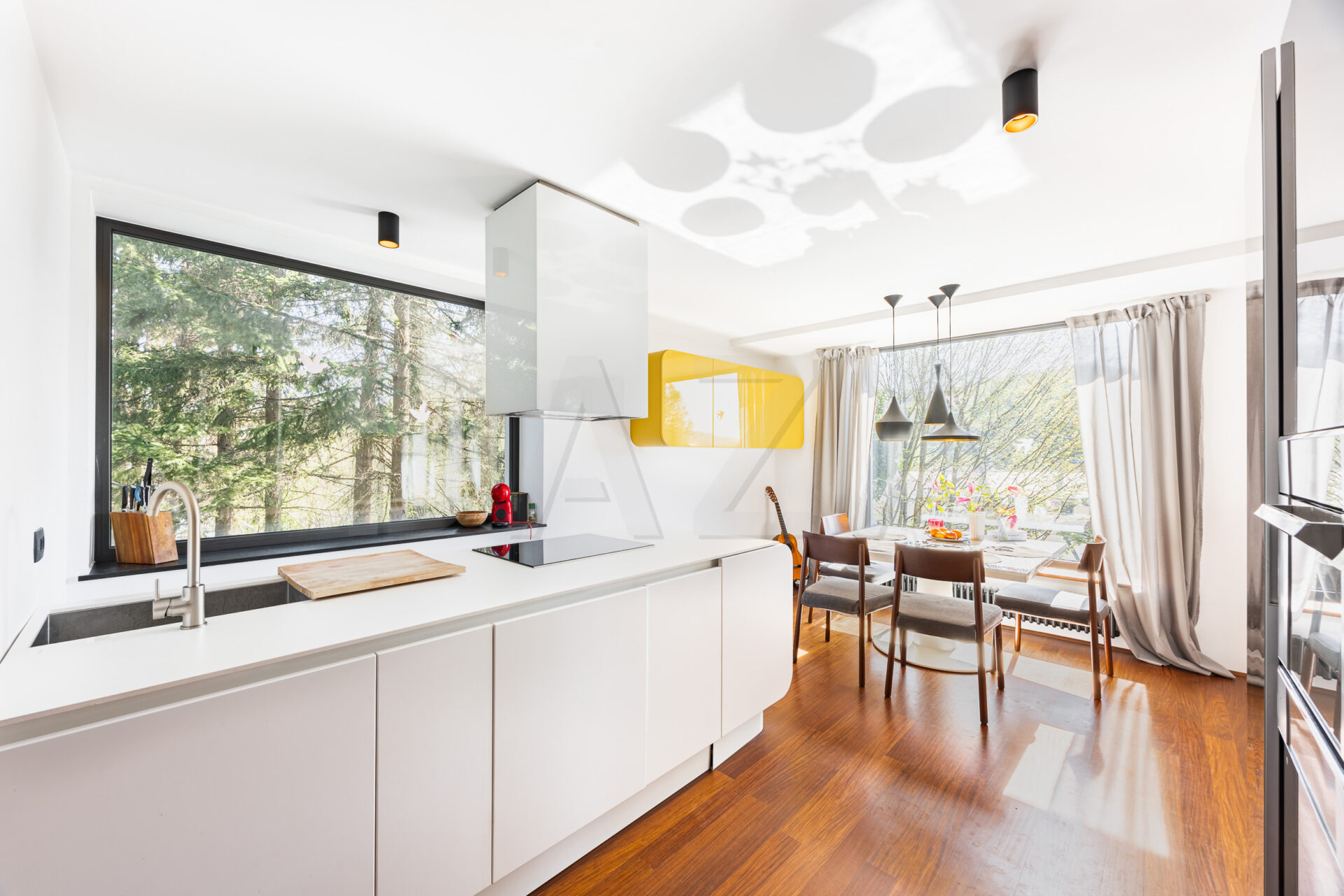 Pritlični del je namenjen bivalnemu prostoru, kjer se sodobna kuhinja z vrhunskimi aparati smiselno povezuje z jedilnico in dnevnim prostorom s kaminom. Velike steklene površine omogočajo obilico naravne svetlobe in izhod na balkon. V tej etaži sta tudi dve dodatni sobi ter kopalnica. Iz pritličja je urejen dostop do prijetne, senčne terase pod drevesi.
